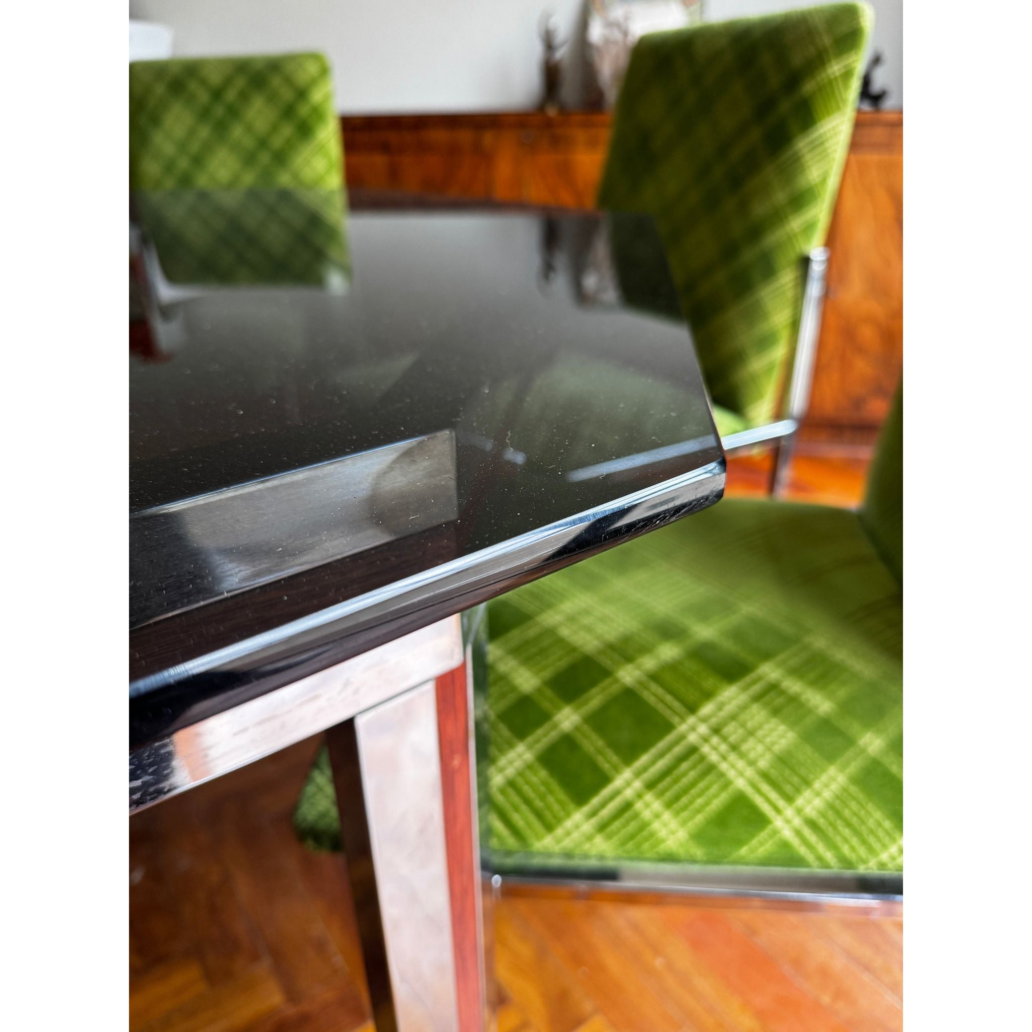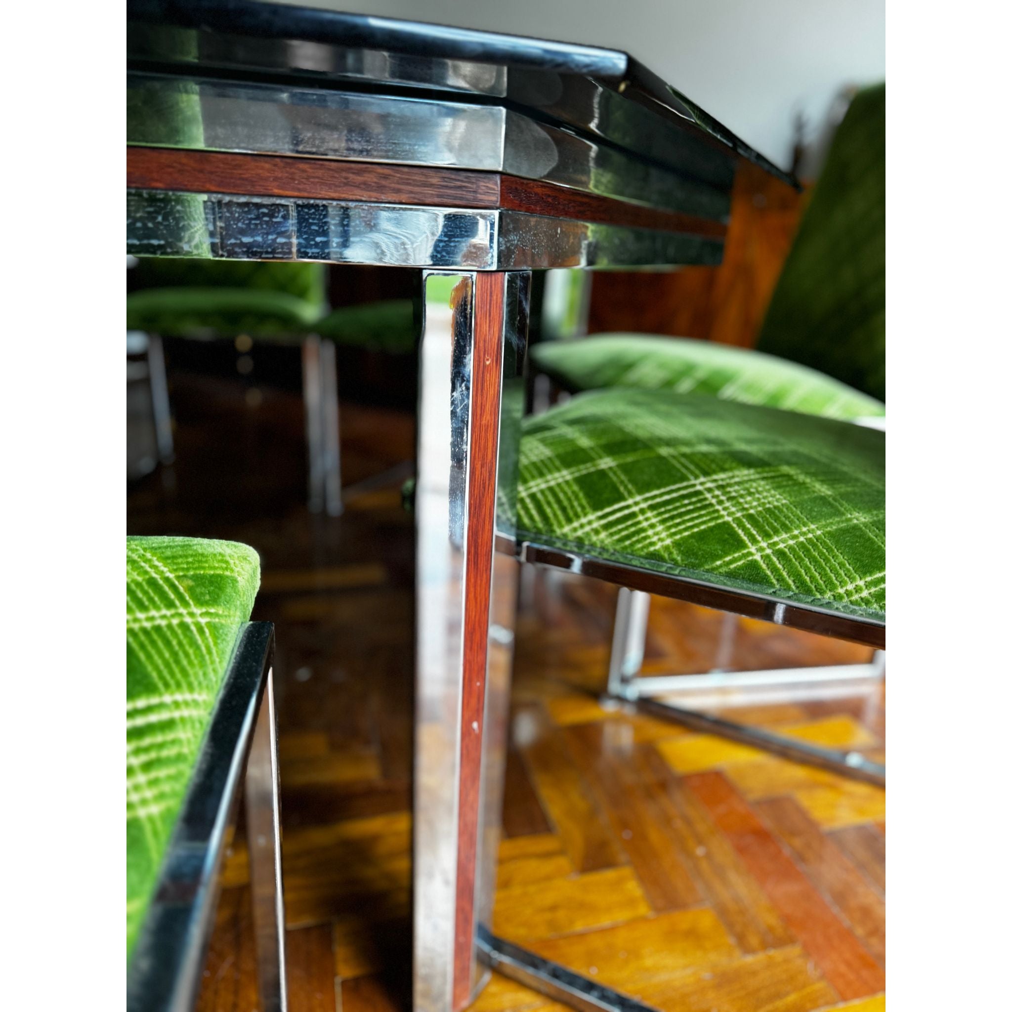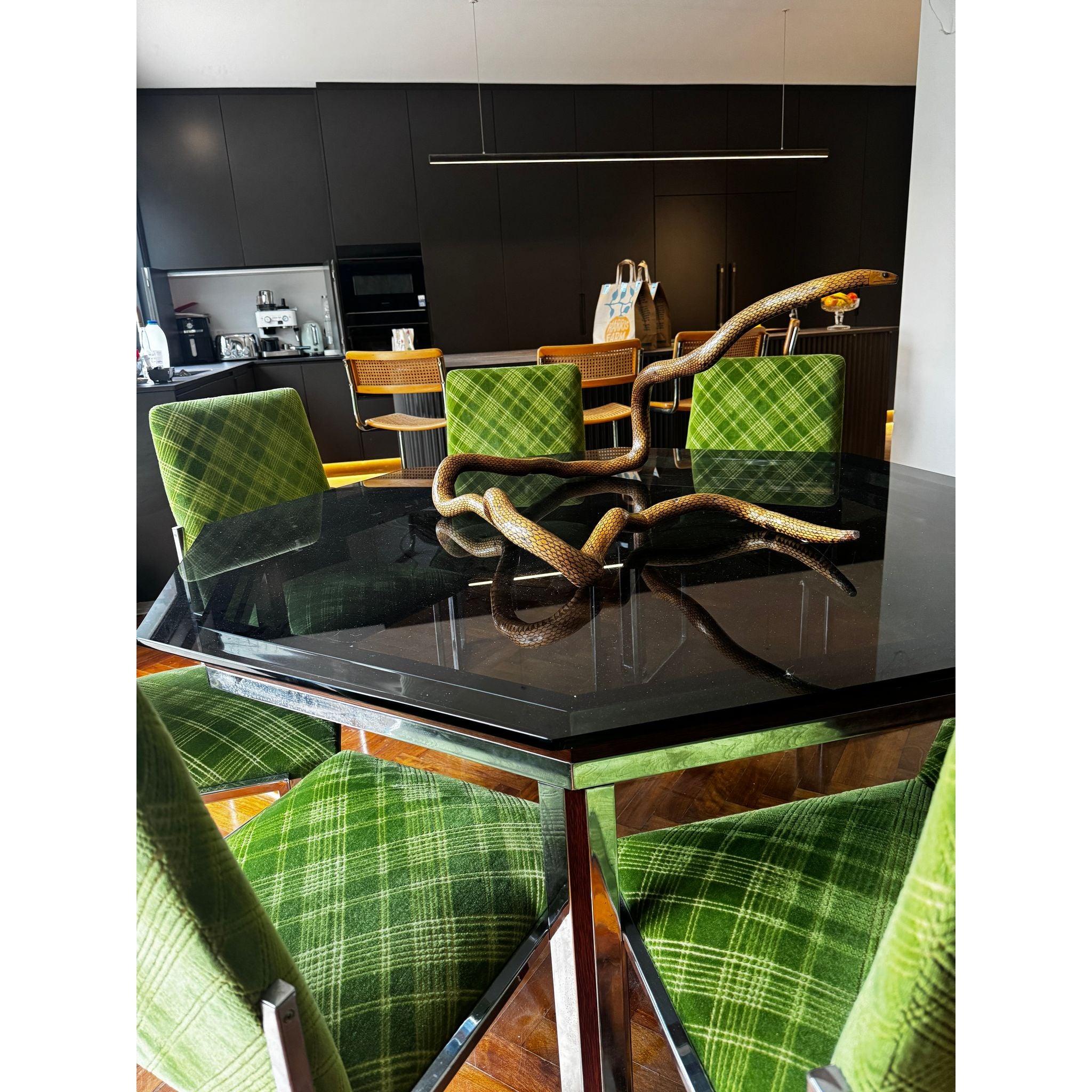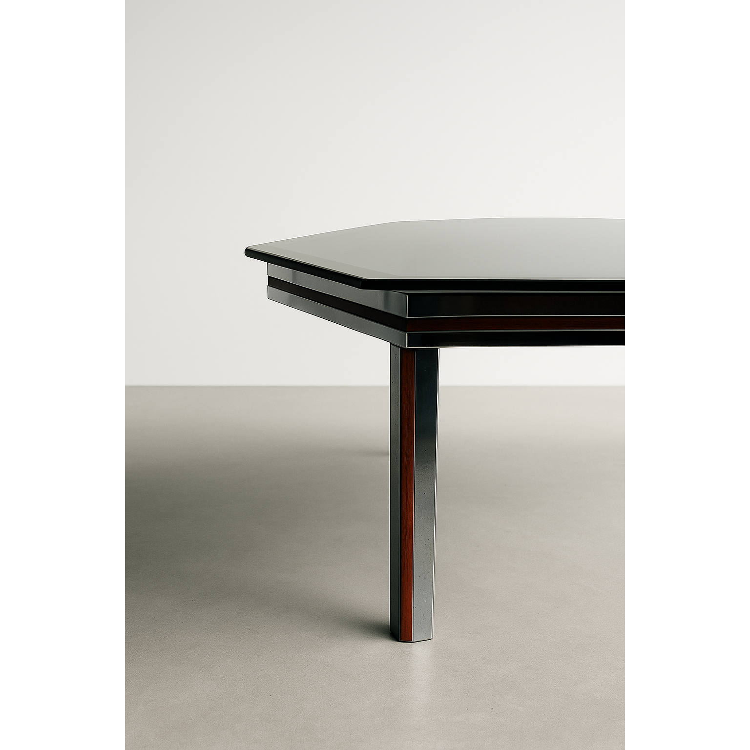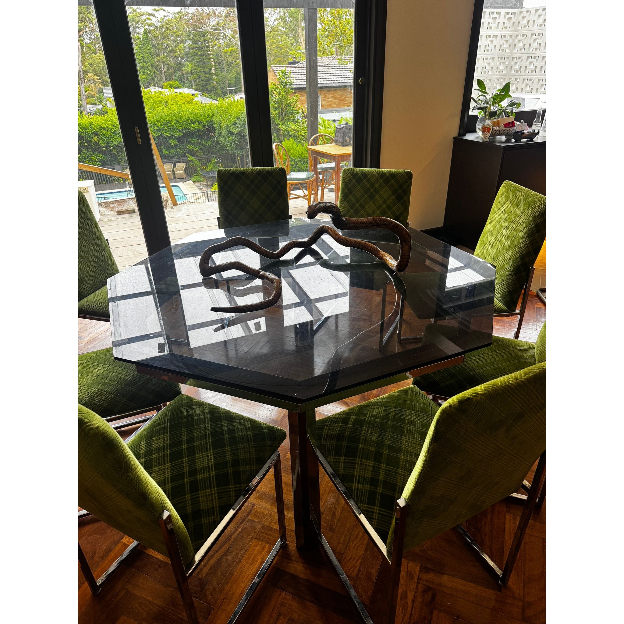 This striking piece features a hexagonal smoked-glass top that floats elegantly above a chrome-plated base, detailed with solid teak inlay running the full length of each leg and apron. The interplay of chrome and timber gives the table a refined, architectural presence—warmth and precision in perfect balance.