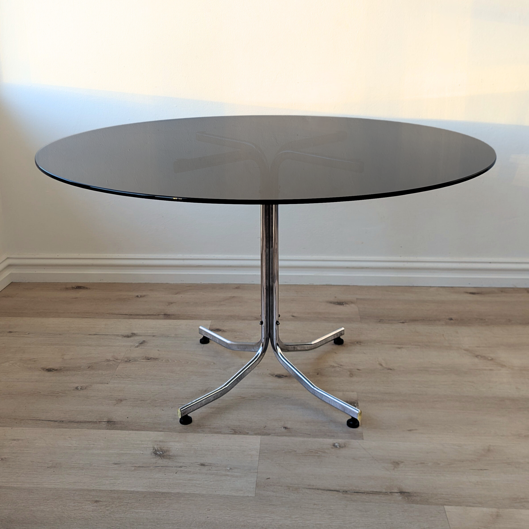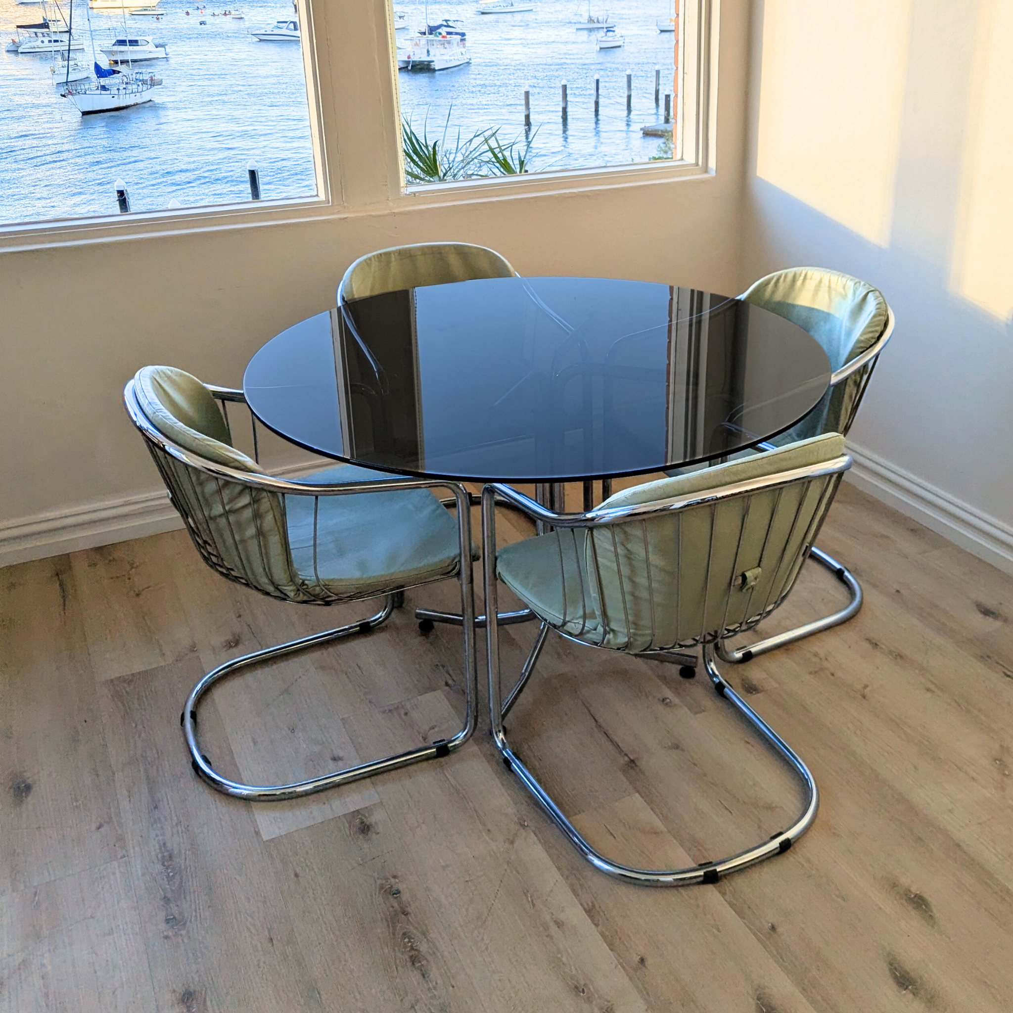 A complete Italian dining suite from the 1970s, where industrial precision meets lounge era ease. Four original Gastone Rinaldi cantilever chairs in pale green leather pair with a round smoked glass table set on a polished chrome base. The composition feels light yet assured, an ensemble balancing comfort, craftsmanship, and quiet glamour.
