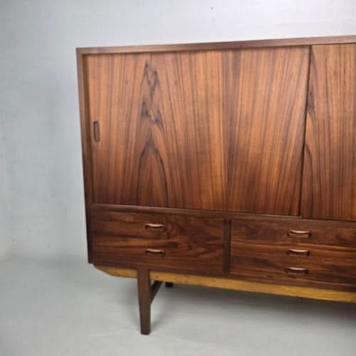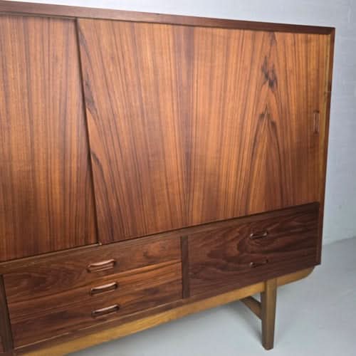 The teak wood construction provides rich colour and durability. The sideboard features two sliding doors as often used in Danish furniture for practicality and space-saving.
