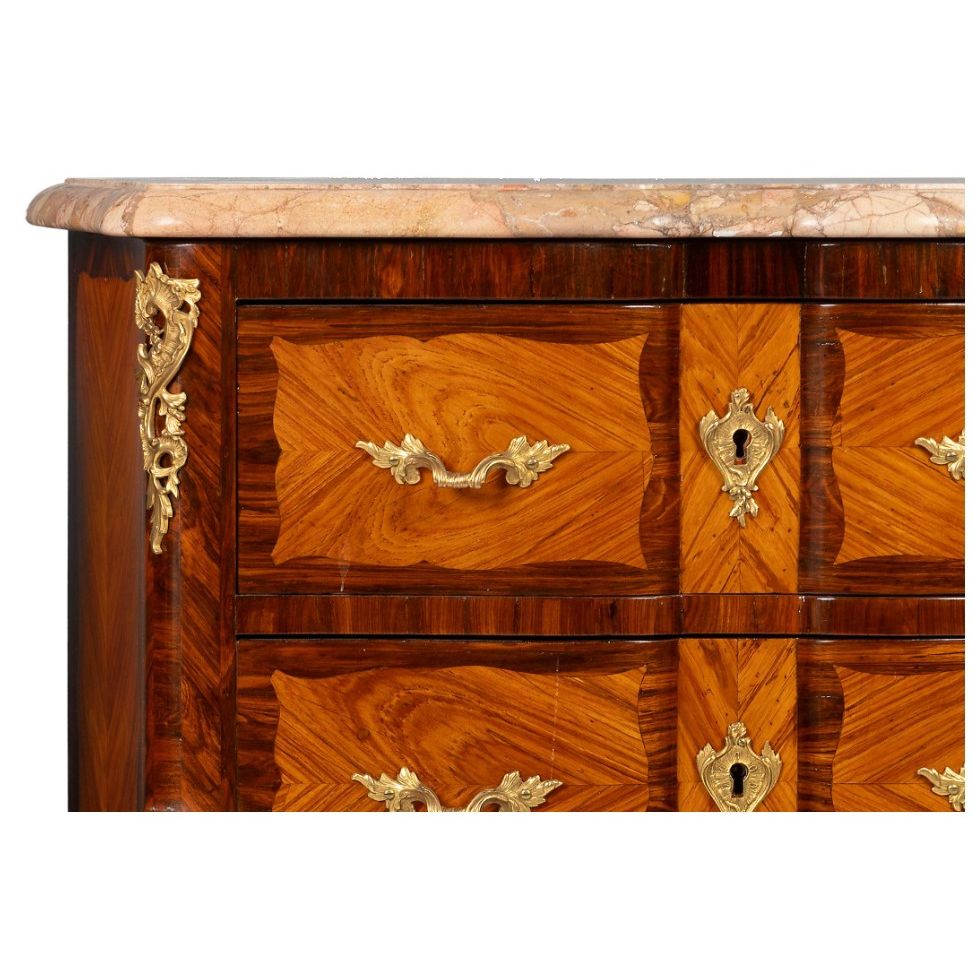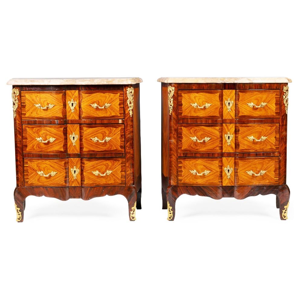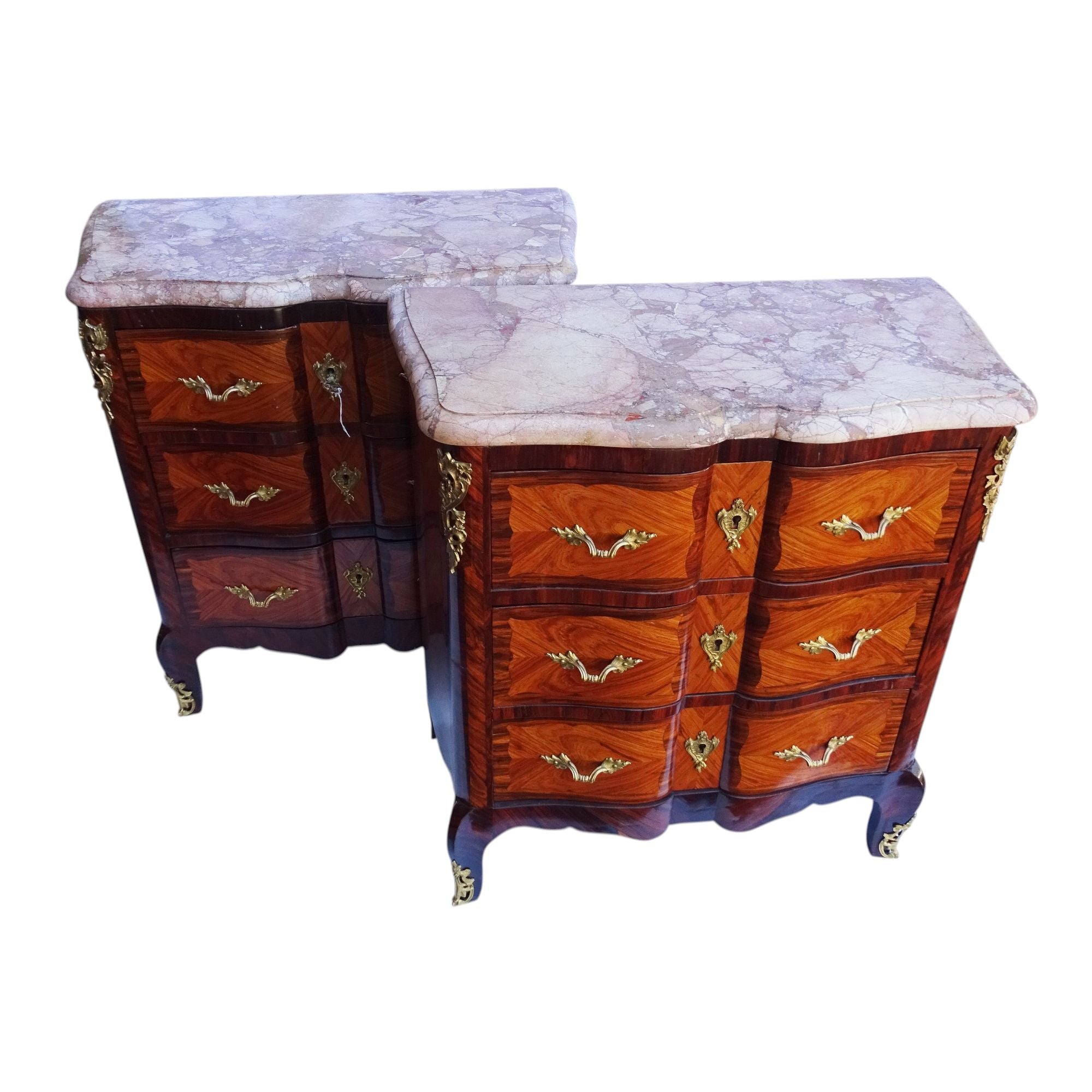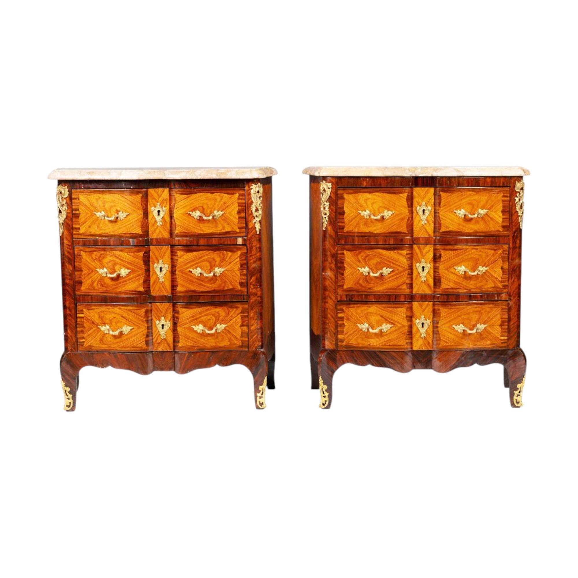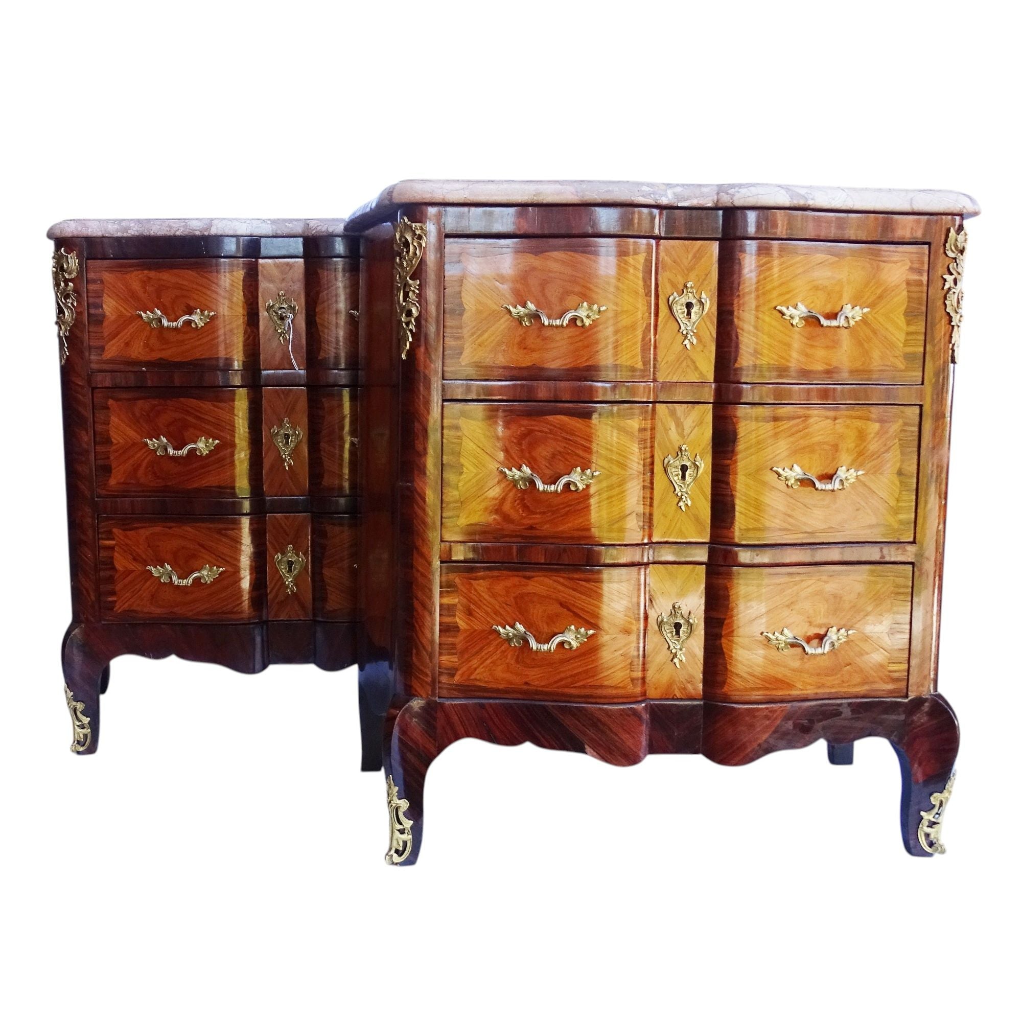 Identical 3 drawer chests with lovely inlay figured marquetry veneer and gilt bronze mounts