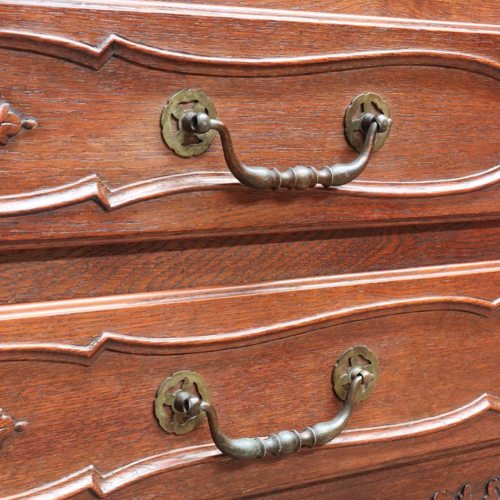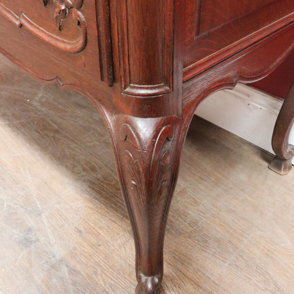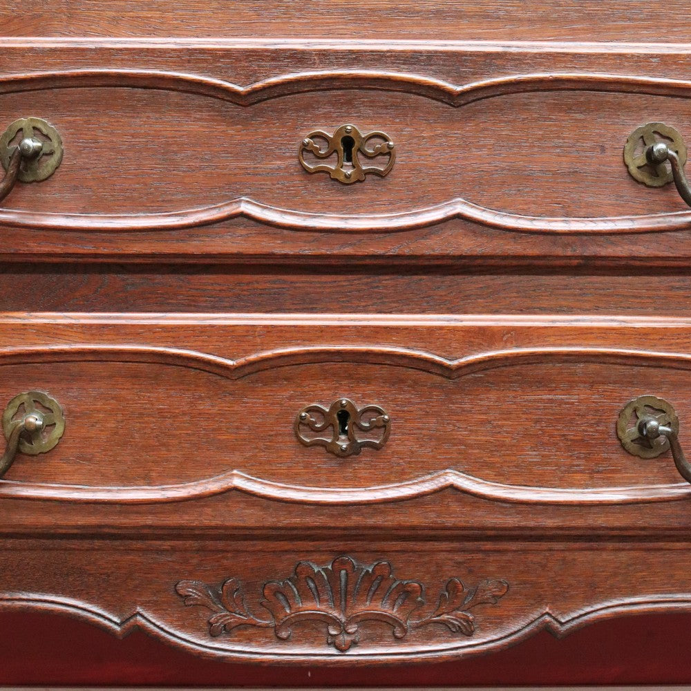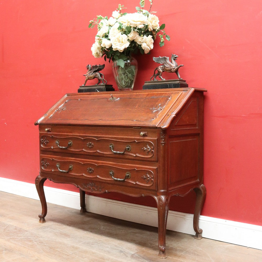 Below sit two long exterior drawers with brass handles and escutcheons, adding both storage and visual balance. The scalloped apron and panelled sides enhance the silhouette, allowing the bureau to look attractive from all angles. French cabriole legs with scroll feet complete the design.