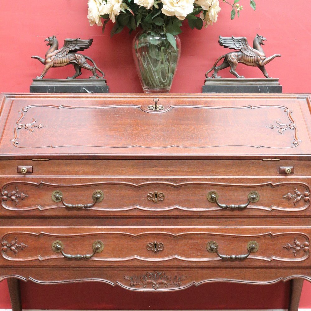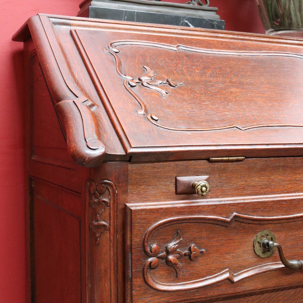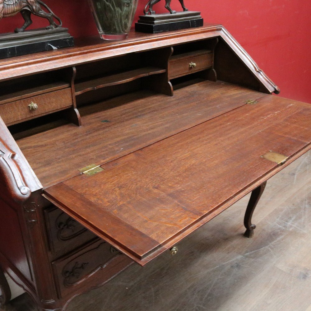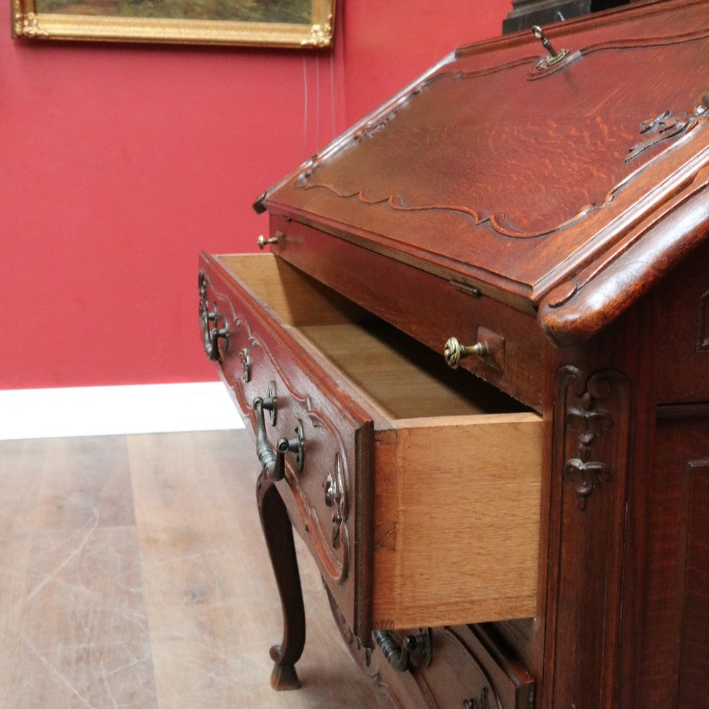 Description: An antique French oak writing bureau or desk with classic features and beautiful detail. The drop front desk is supported by two pull-out arms and opens to reveal six internal pigeon holes and two small trinket drawers, offering practical organisation for stationery and personal items.