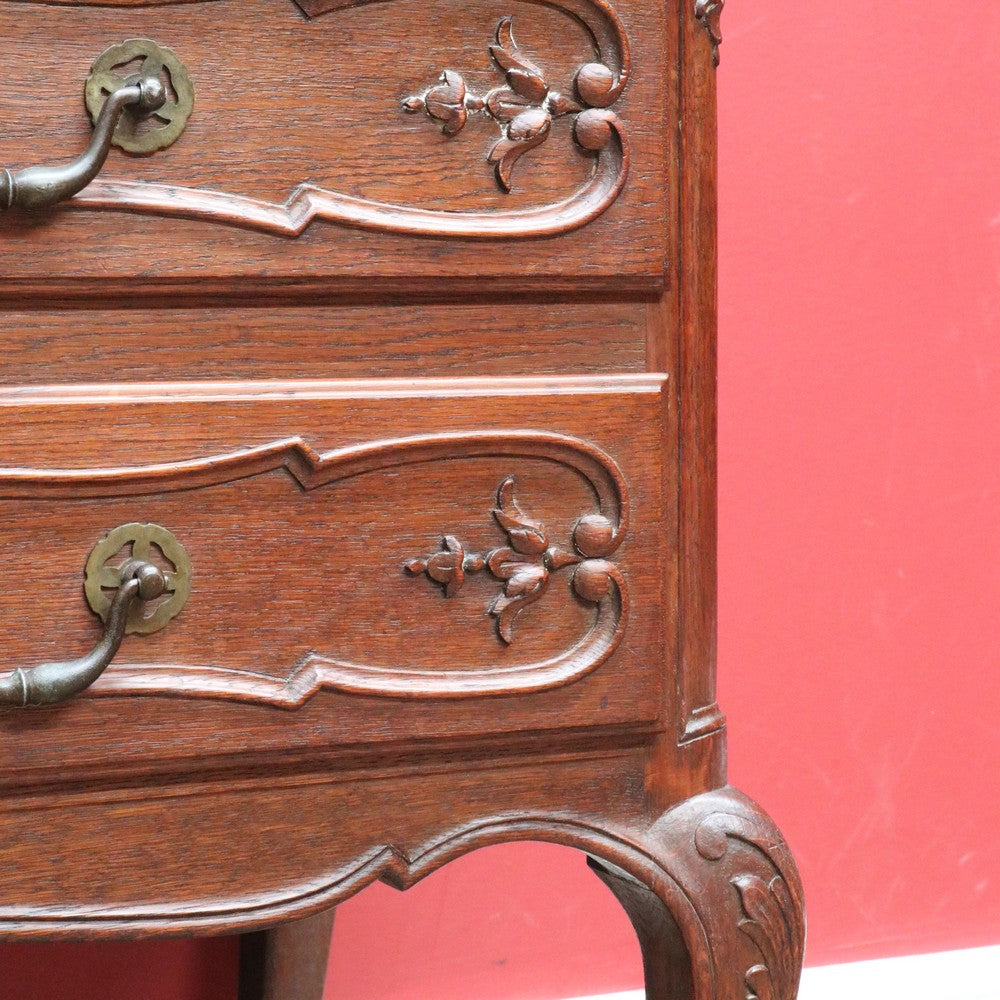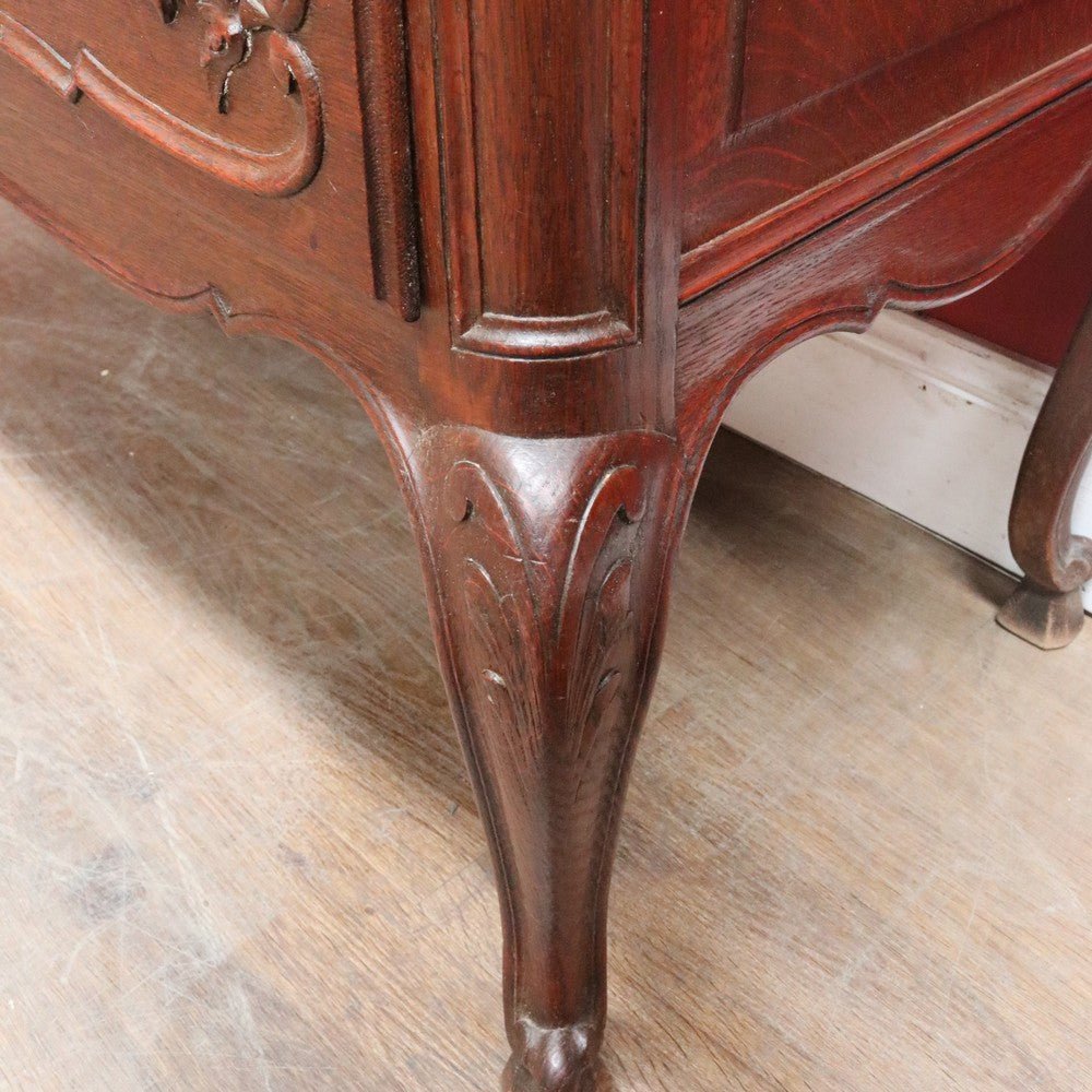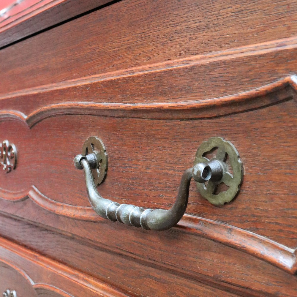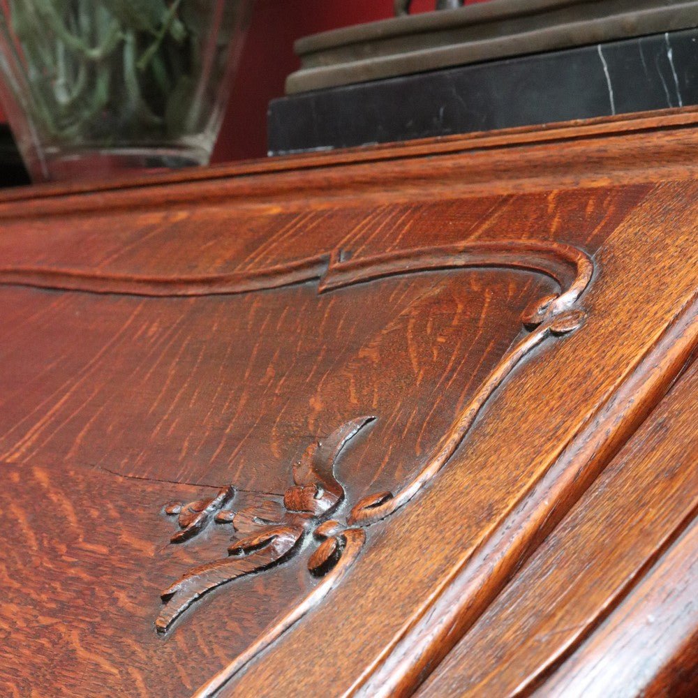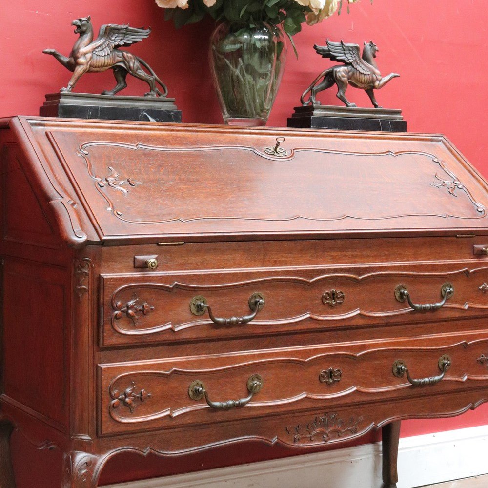 Description: An antique French oak writing bureau or desk with classic features and beautiful detail. The drop front desk is supported by two pull-out arms and opens to reveal six internal pigeon holes and two small trinket drawers, offering practical organisation for stationery and personal items.