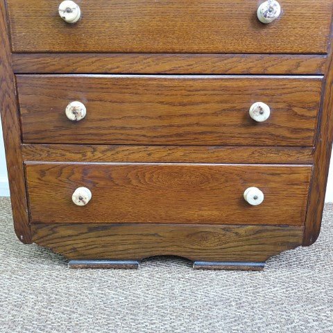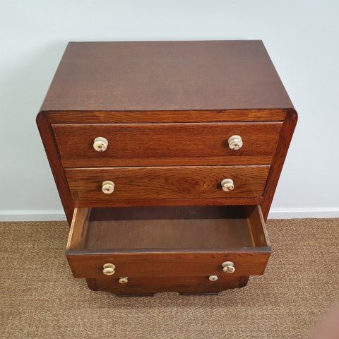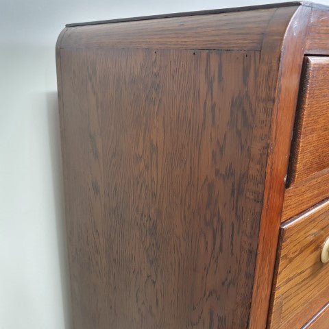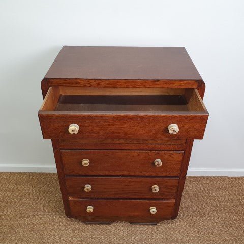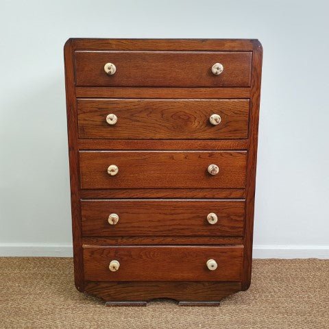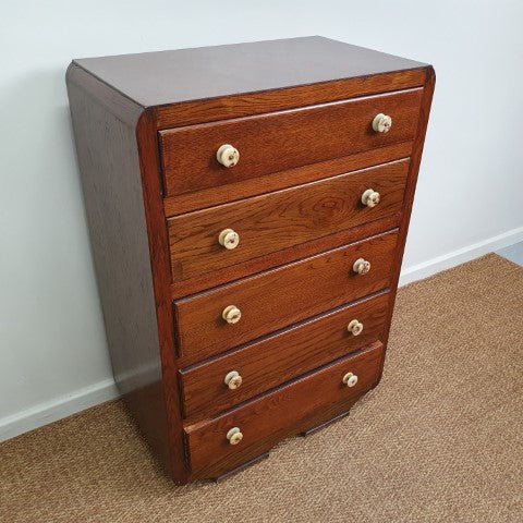 This arts & crafts movement chest of drawers is a tallboy design with five drawers and softly rounded top corners. It retains its original Bakelite handles, adding a distinctive period detail to the warm timber finish. A fine example of early 20th century craftsmanship and design.