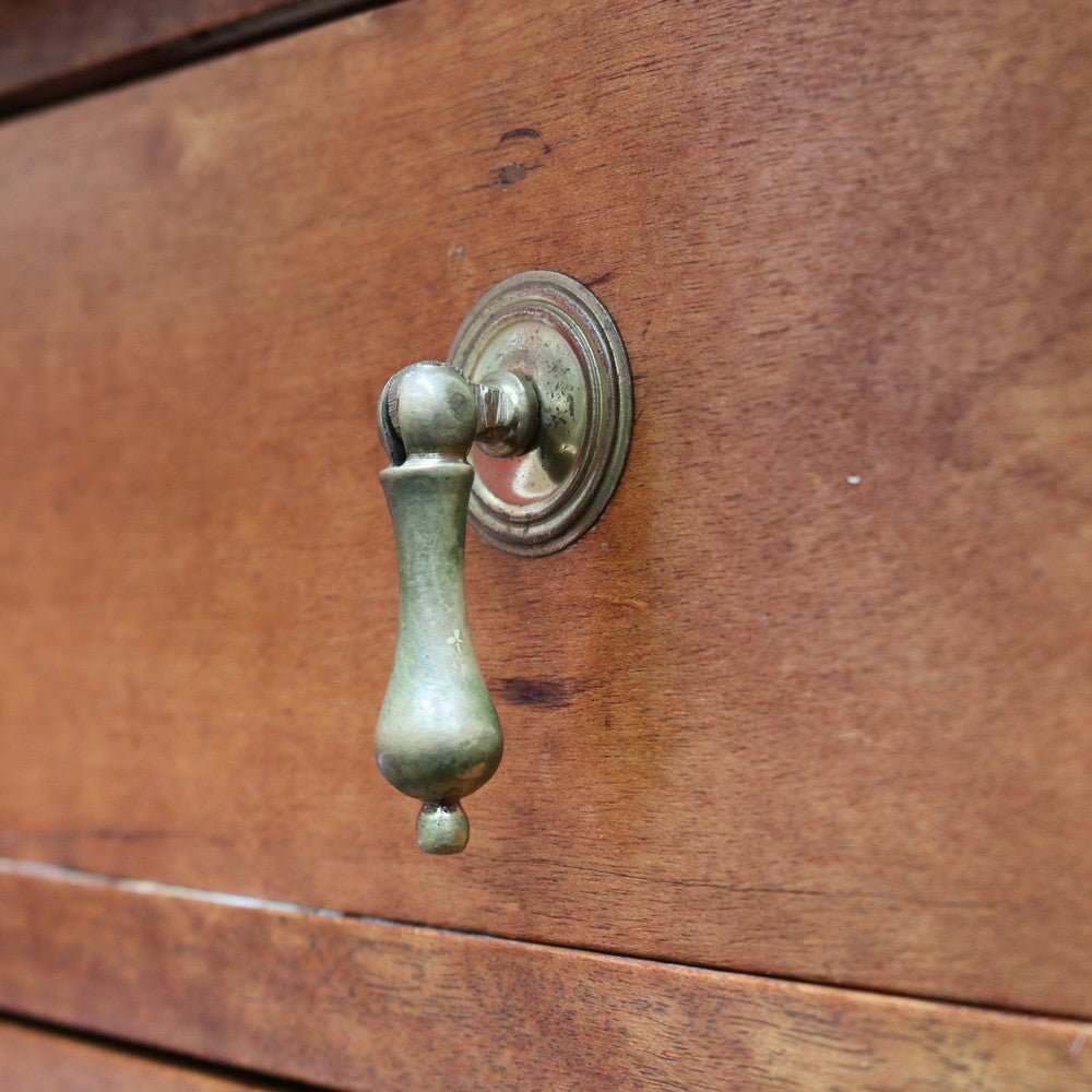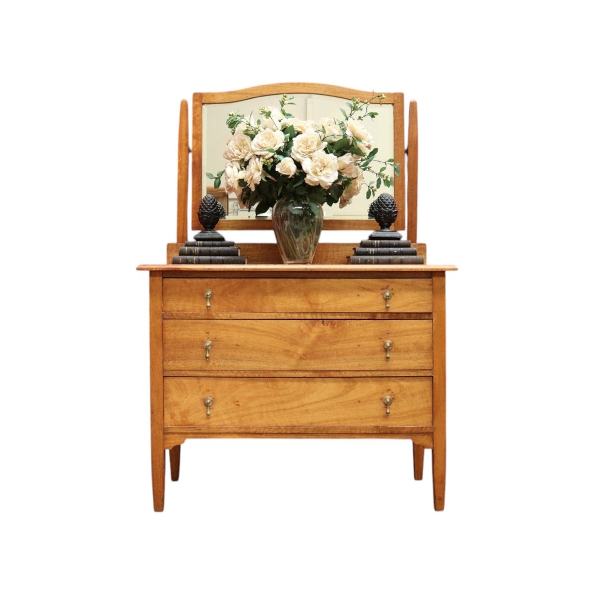 Description: Australian maple dressing table featuring three drawers with brass handles and an adjustable mirror above. Crafted from warm-toned maple, the piece has a gentle sheen and elegant simplicity typical of Australian design.