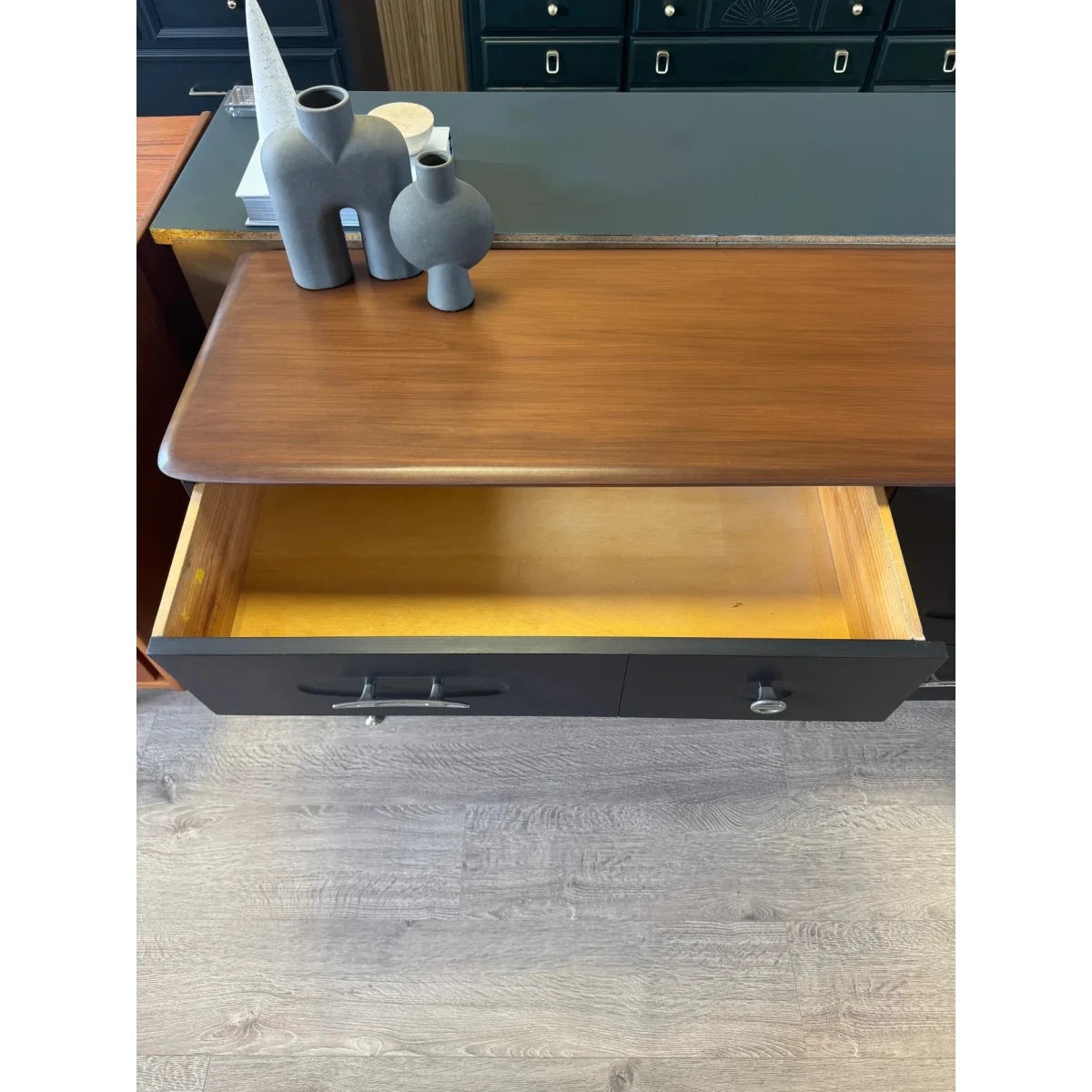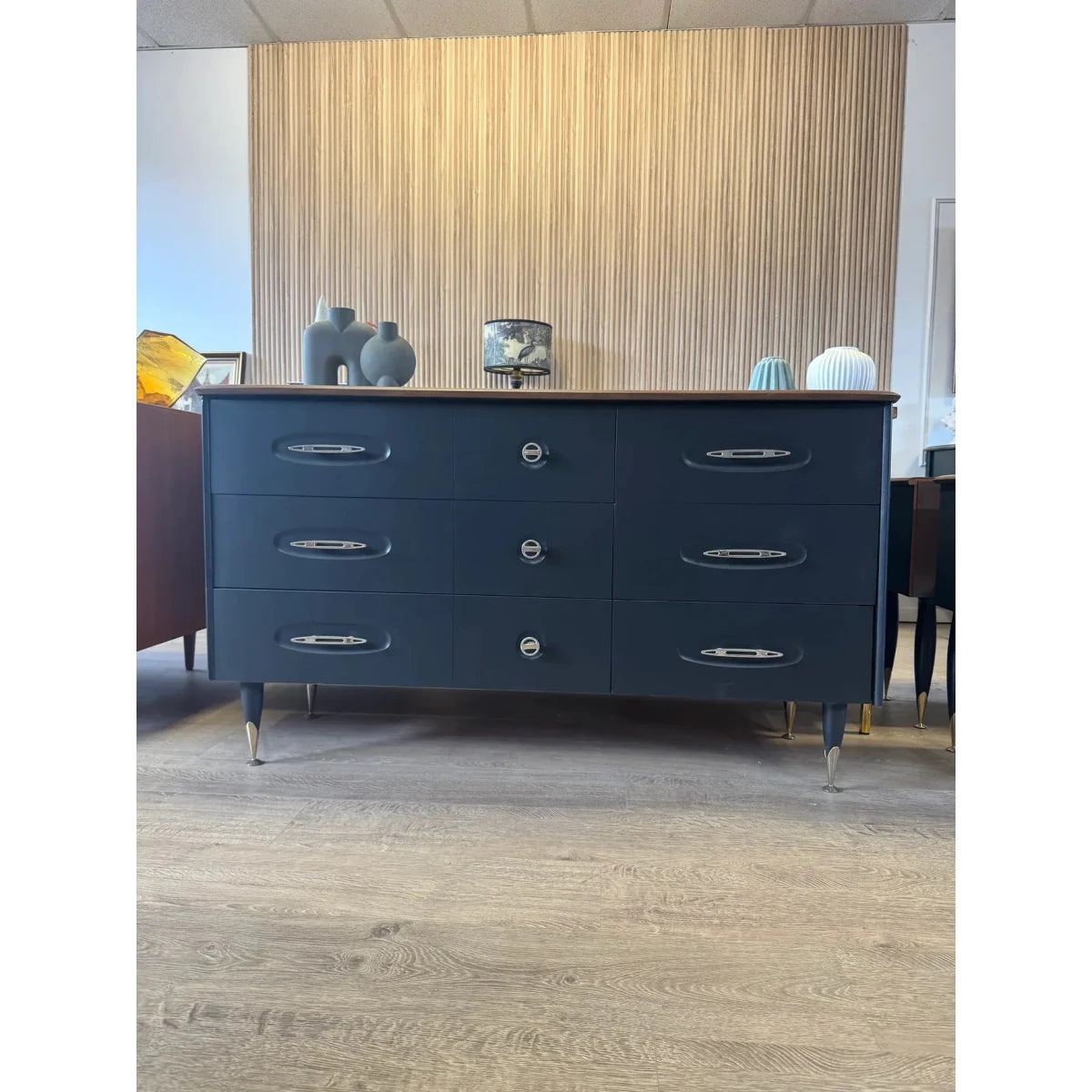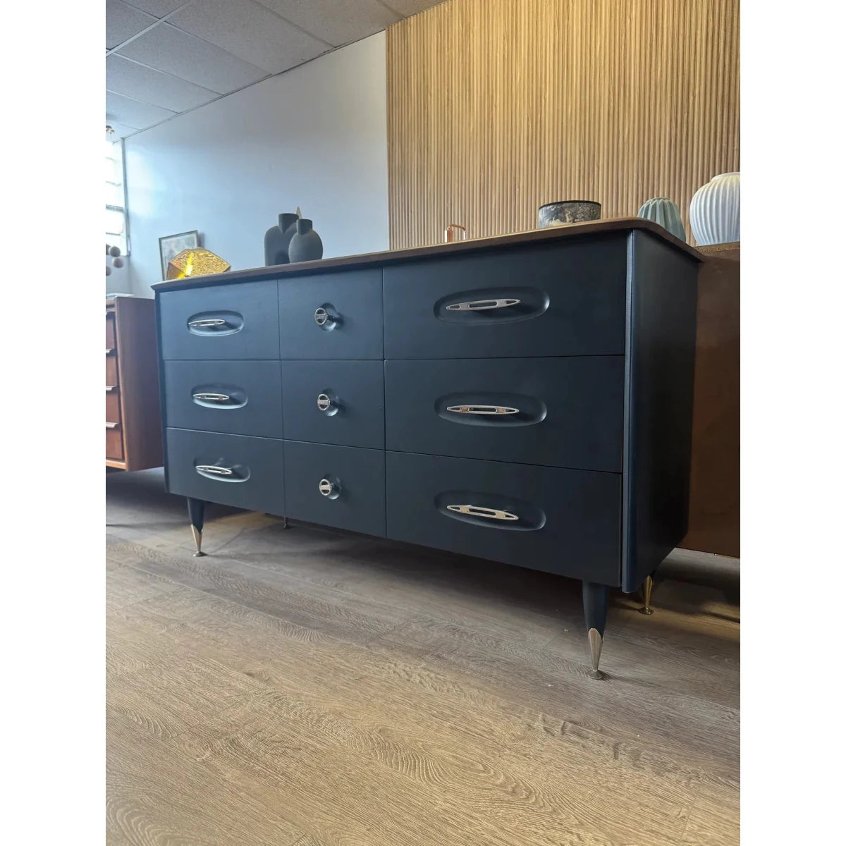 These beautiful solid wood mid century drawers are made by ‘Burgess Furniture’ an iconic and well regarded Australian mid century brand known for their commitment to quality and great design. Their designs are known to have stood the test of time as demonstrated with this iconic and very popular piece. This dresser has been professionally refinished and is in great condition. This dresser has 6 drawers with 3 of them being double drawers that all slide well, it has ample storage and has a polished and refined look.