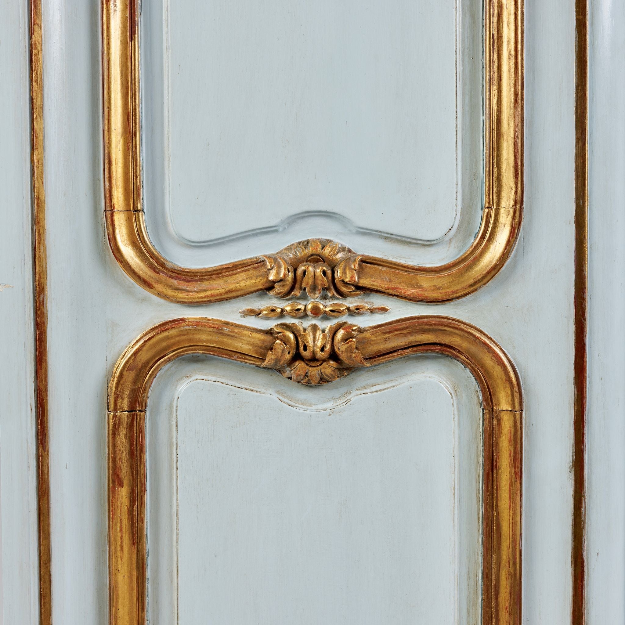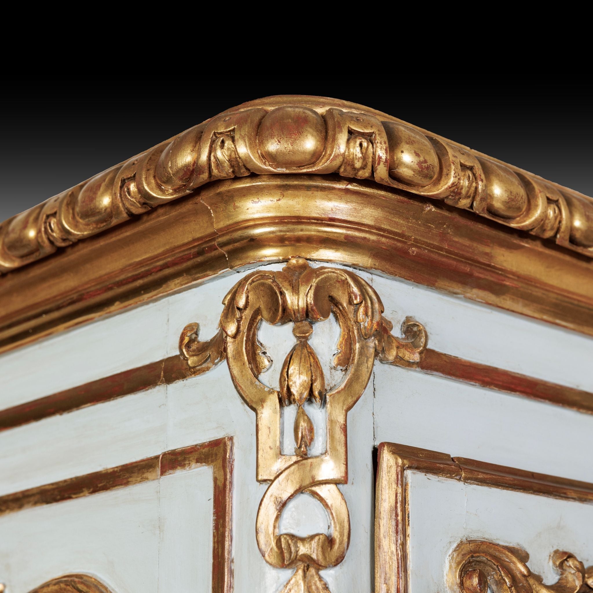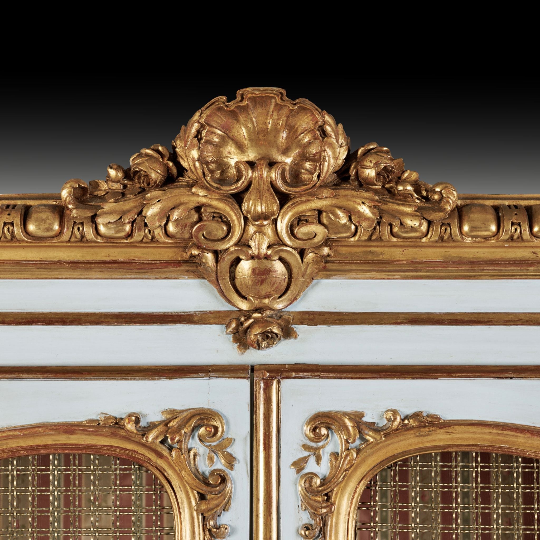 An exceptional 18th century French parcel gilt Louis XV armoire, the well carved and gilded pediment with shell crest and flowers above a pair of shaped and carved doors which open to reveal a pink and white striped fabric-lined cupboard enclosing shelves supported on four carved and gilded cabriole legs.