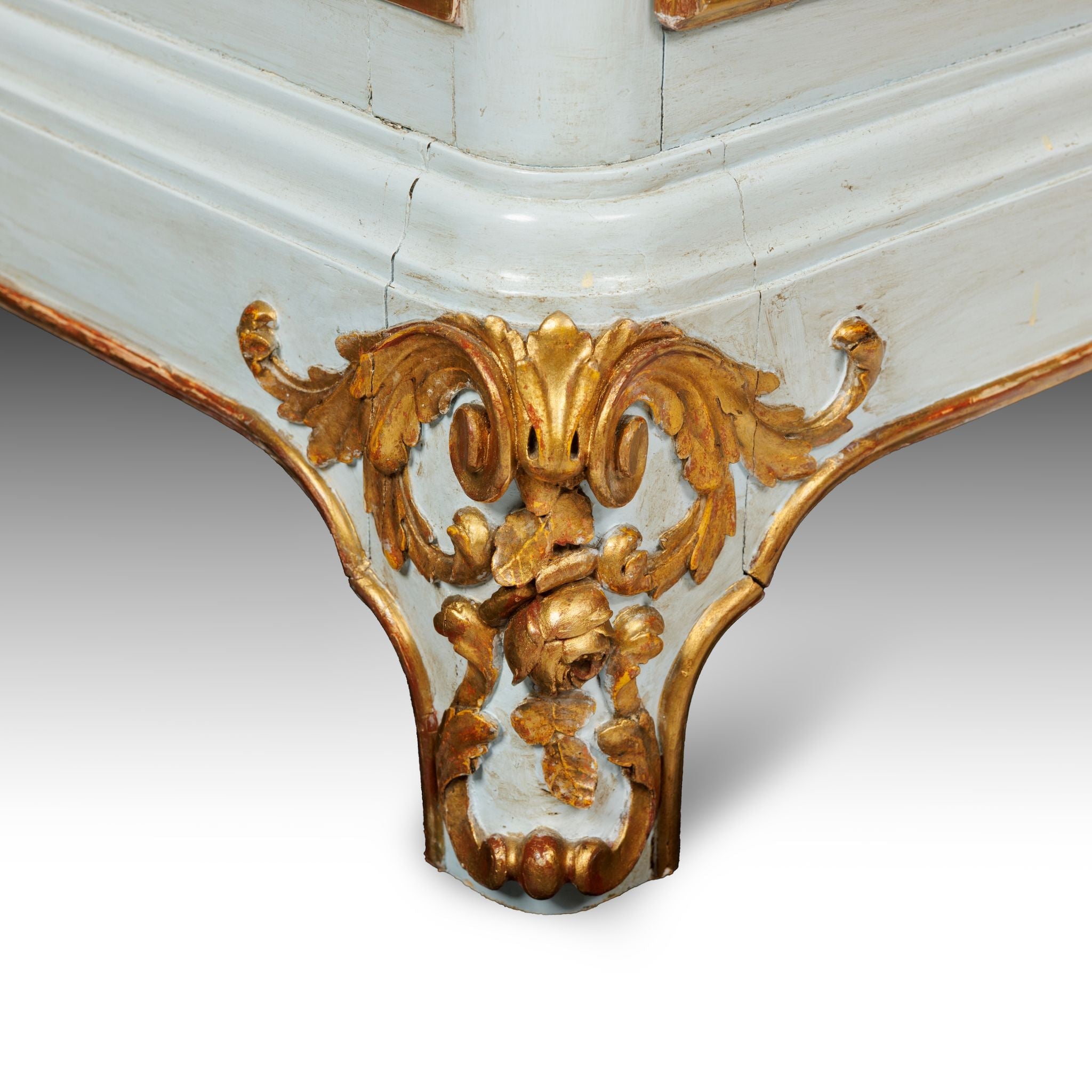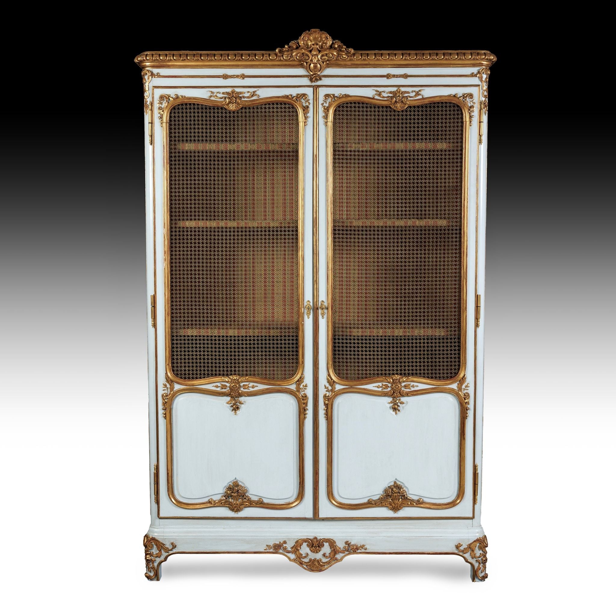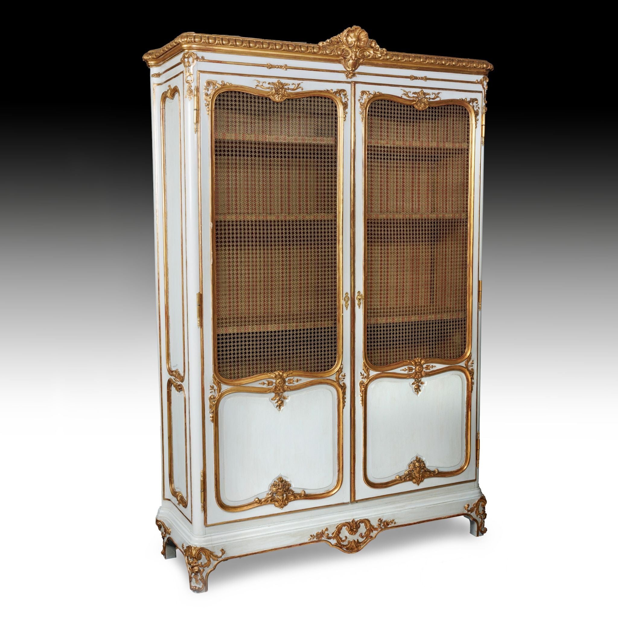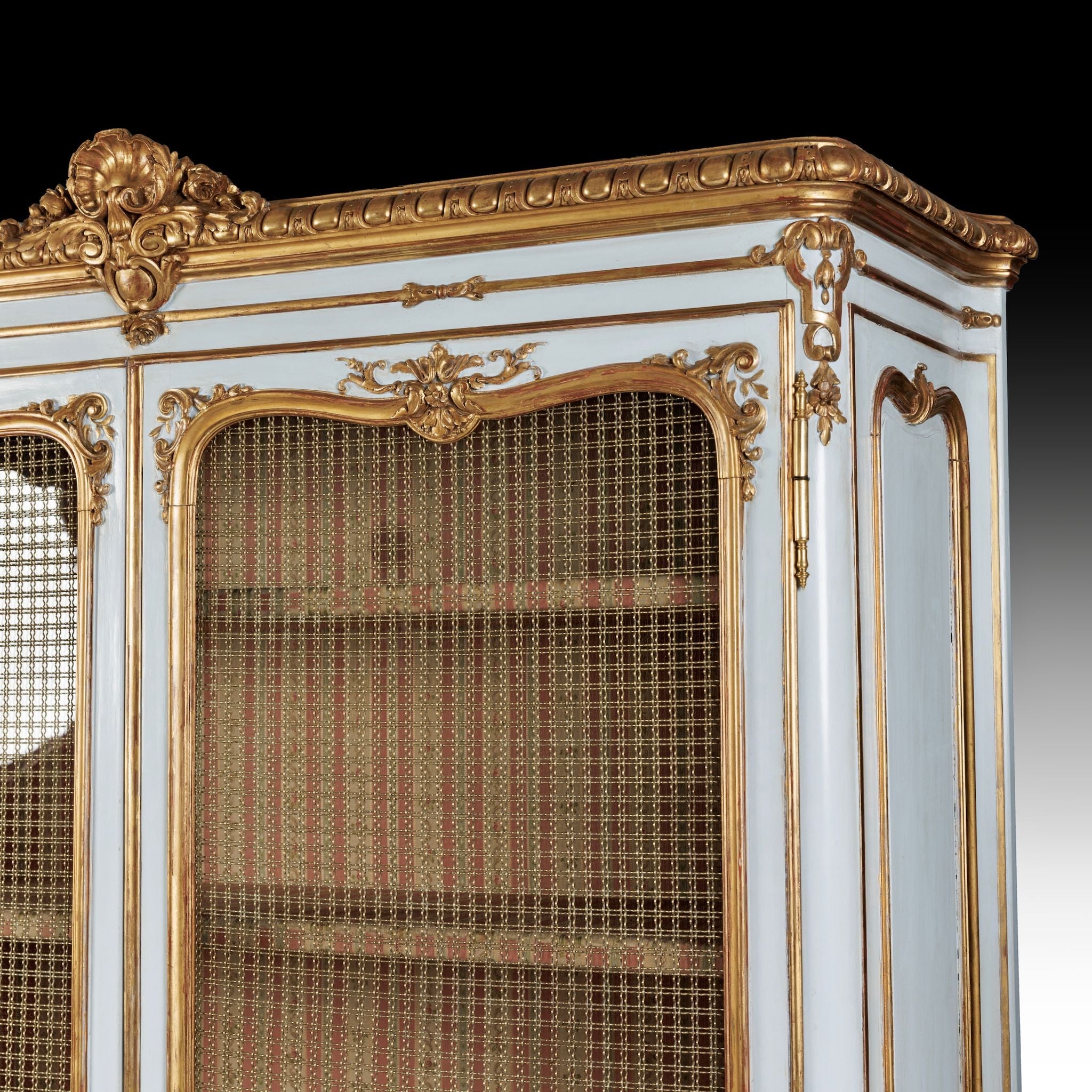 An exceptional 18th century French parcel gilt Louis XV armoire, the well carved and gilded pediment with shell crest and flowers above a pair of shaped and carved doors which open to reveal a pink and white striped fabric-lined cupboard enclosing shelves supported on four carved and gilded cabriole legs.