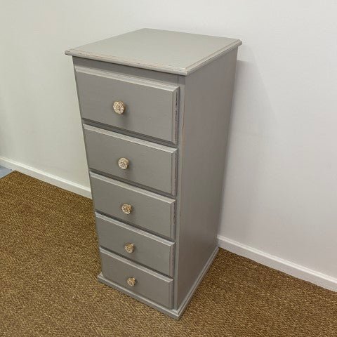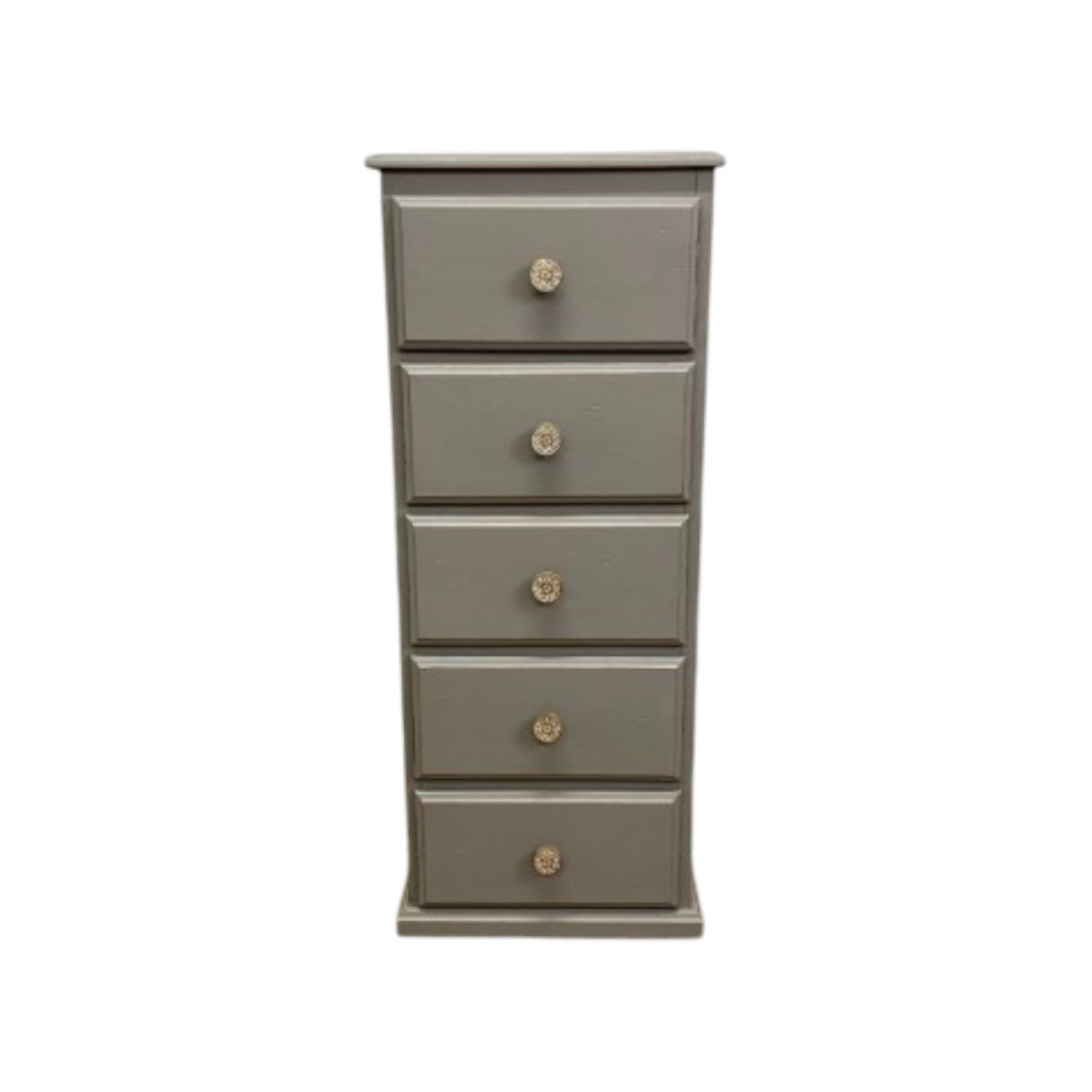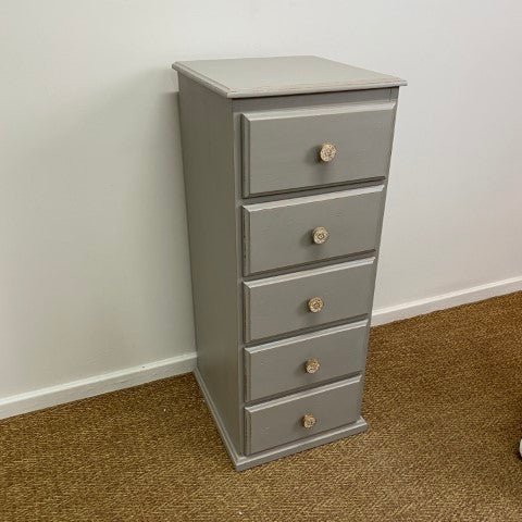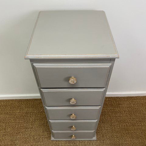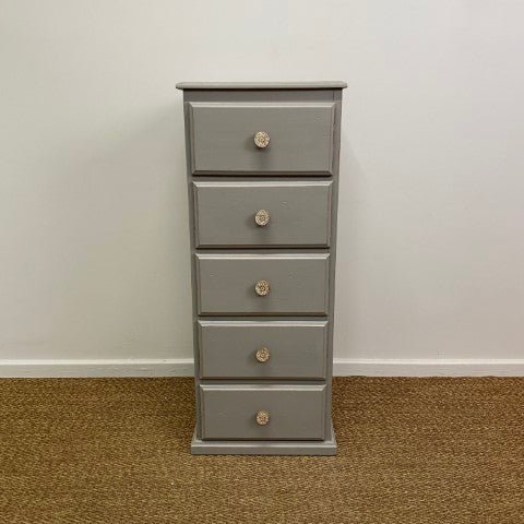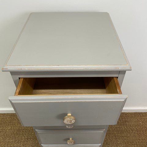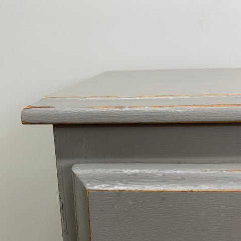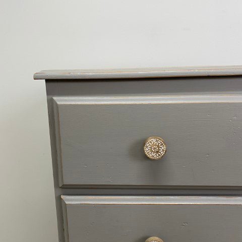 This tallboy has been handpainted in Annie Sloan Chalk Paint in the elegant shade ‘French Linen’. The soft grey tone highlights its classic design, giving it a calm and timeless presence.