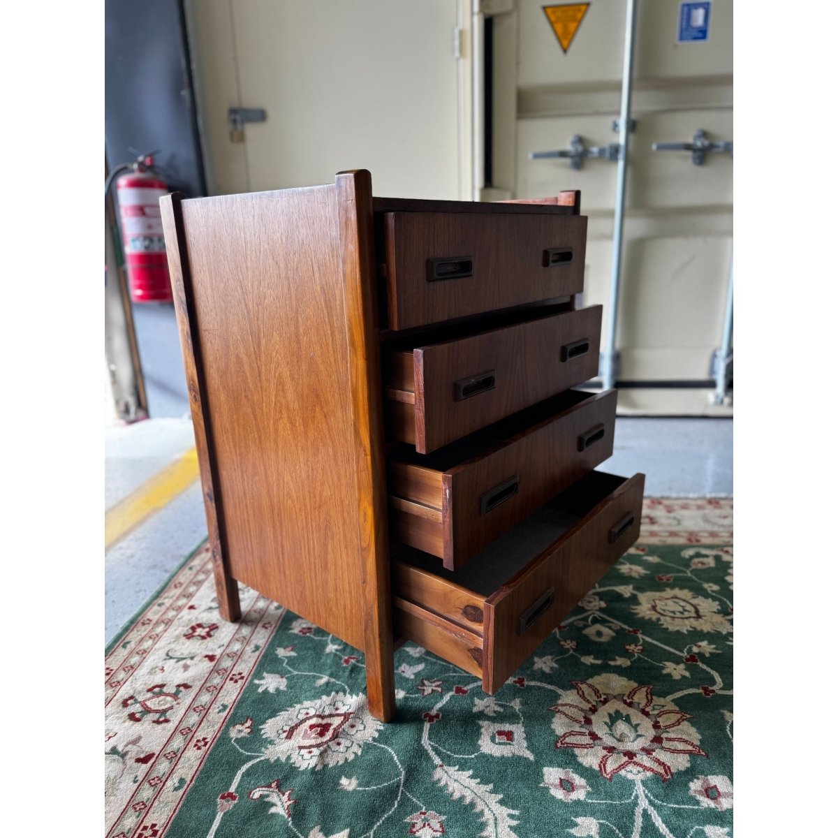 Features: Four drawers with recessed sculpted handles, stretched solid teak leaks