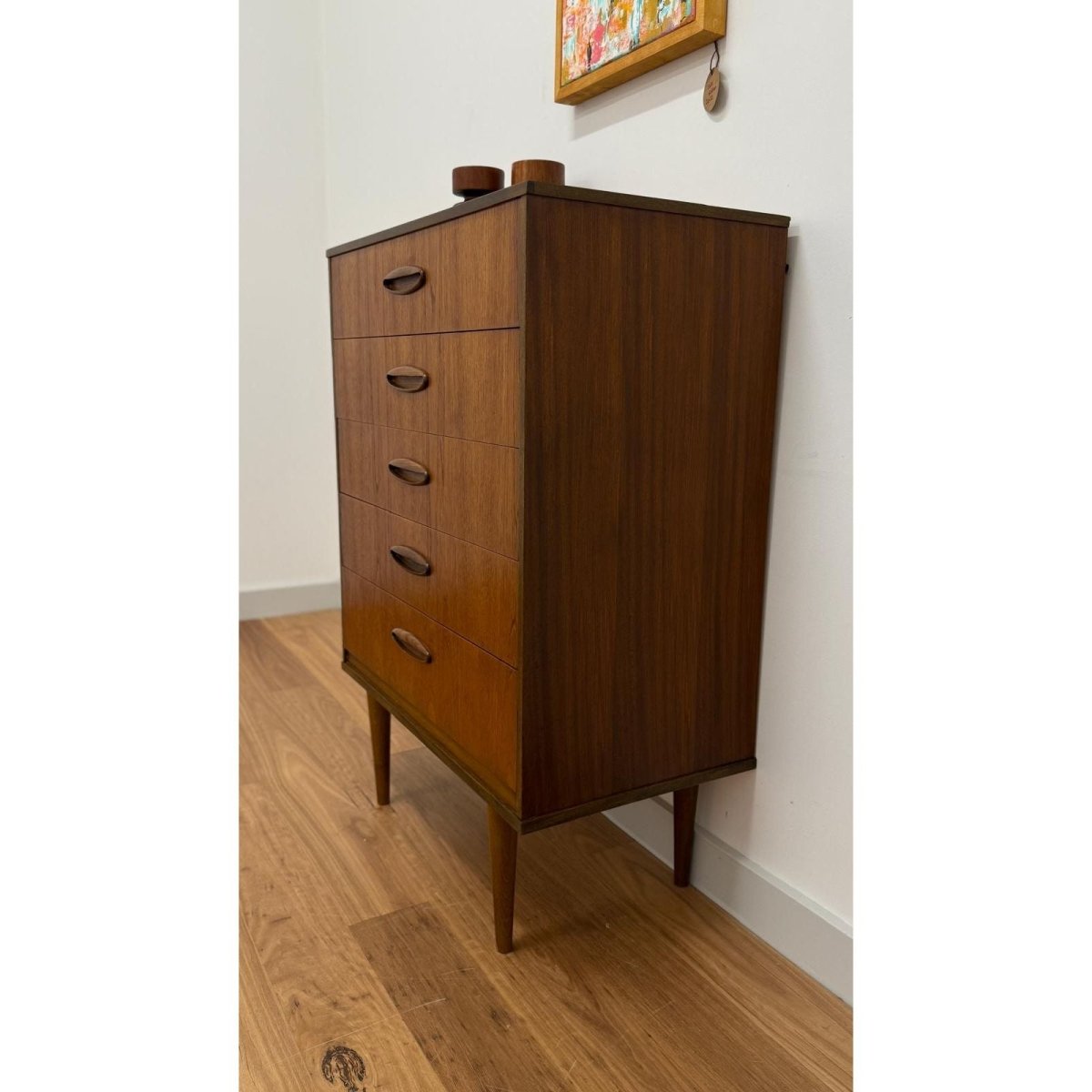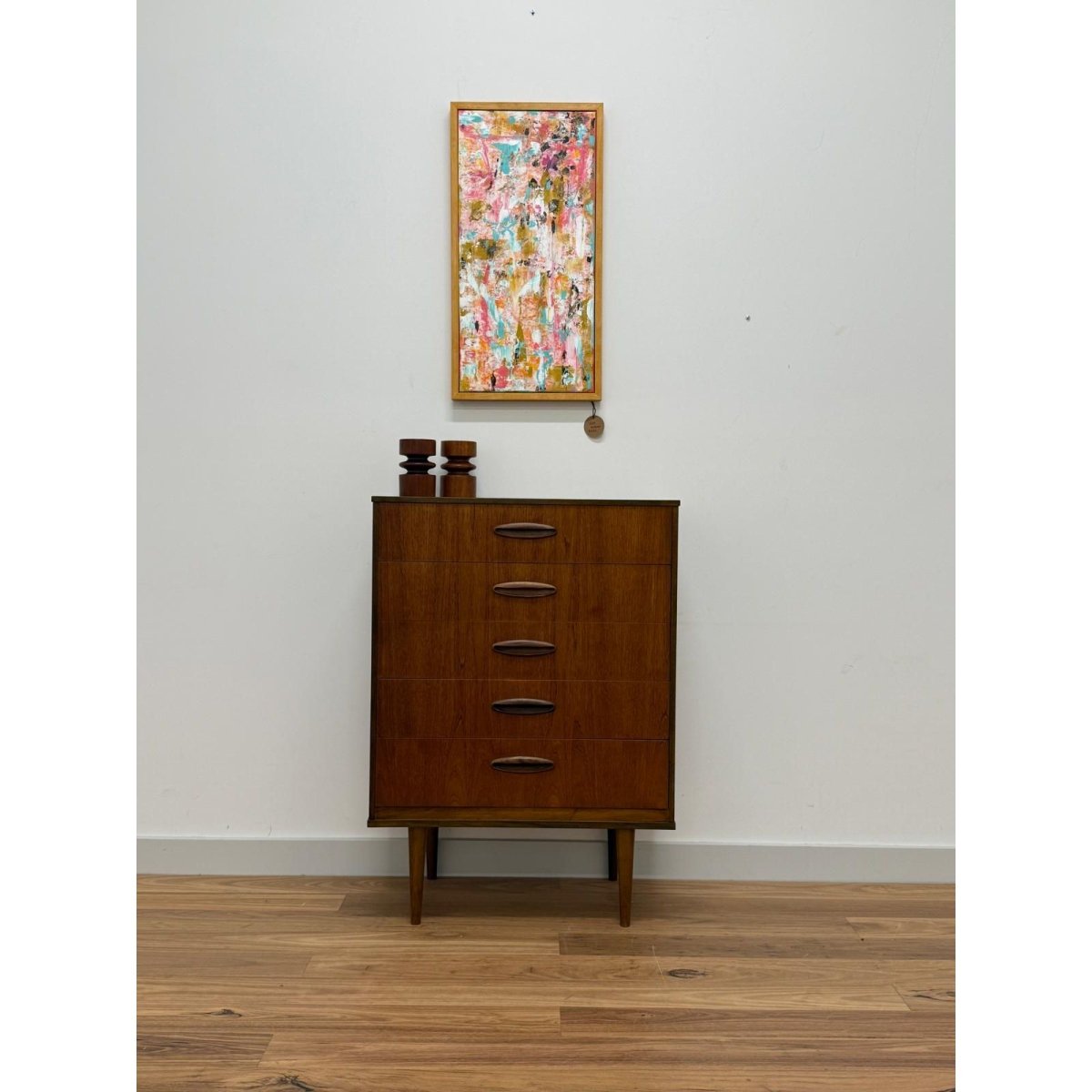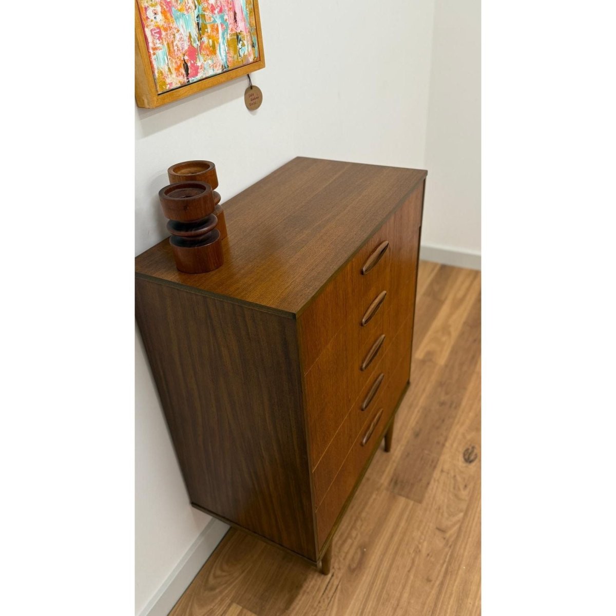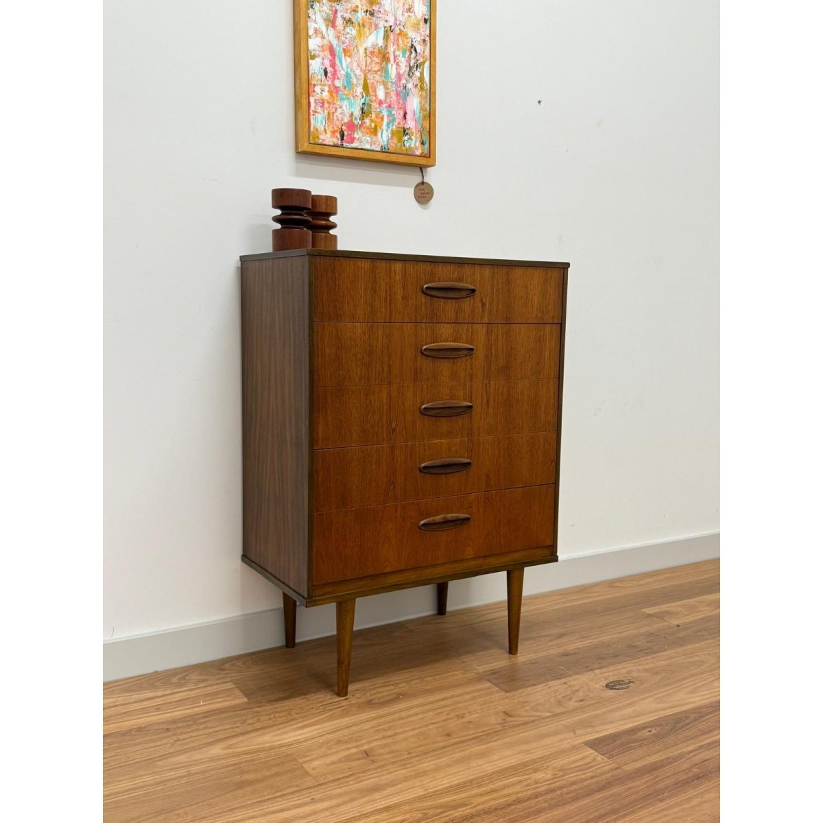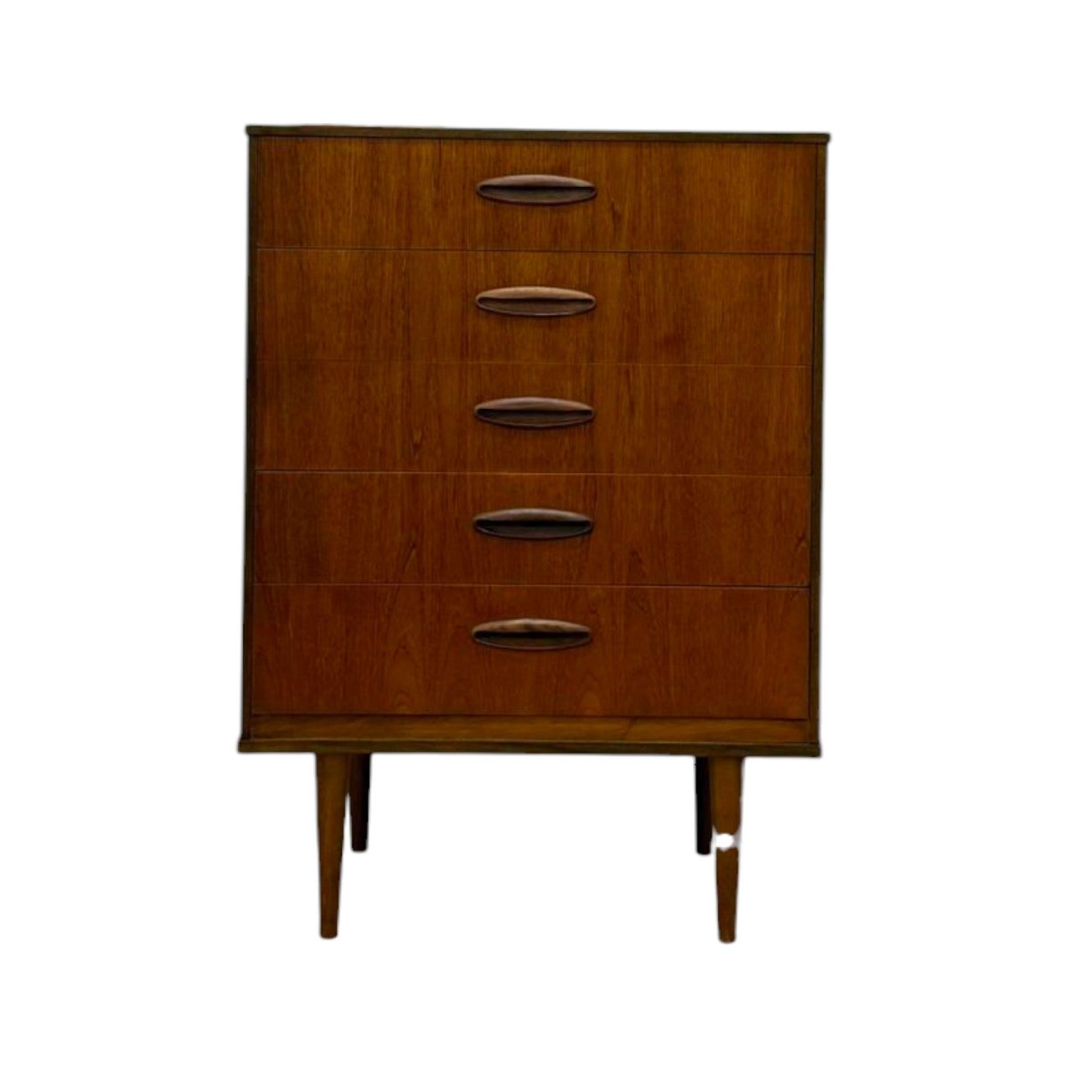 This elegant mid-century chest of drawers by Symbol Furniture showcases the understated craftsmanship of British design in the 1960s. Featuring five spacious drawers with sculpted teak handles, the piece sits gracefully on tapered legs, offering both style and practicality.