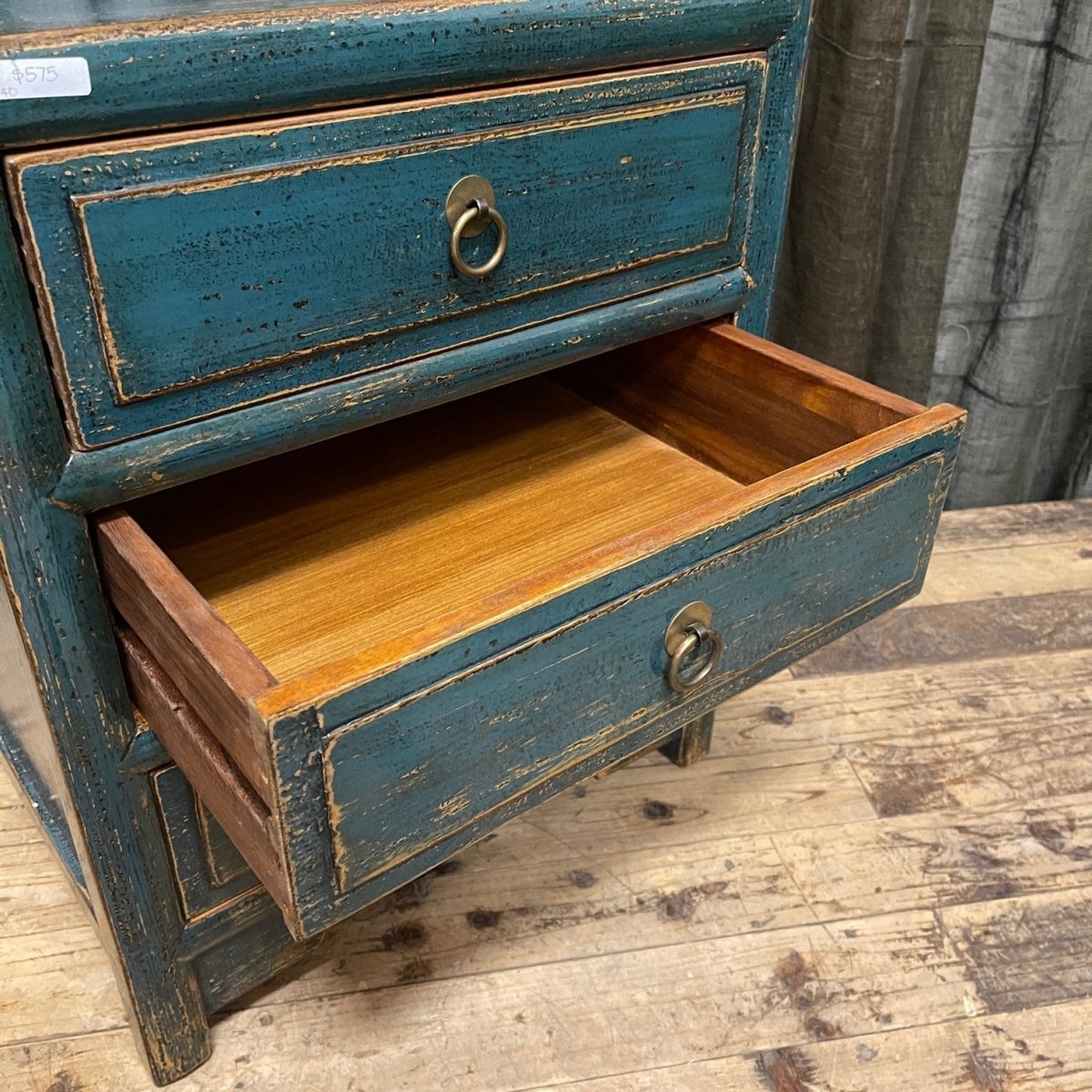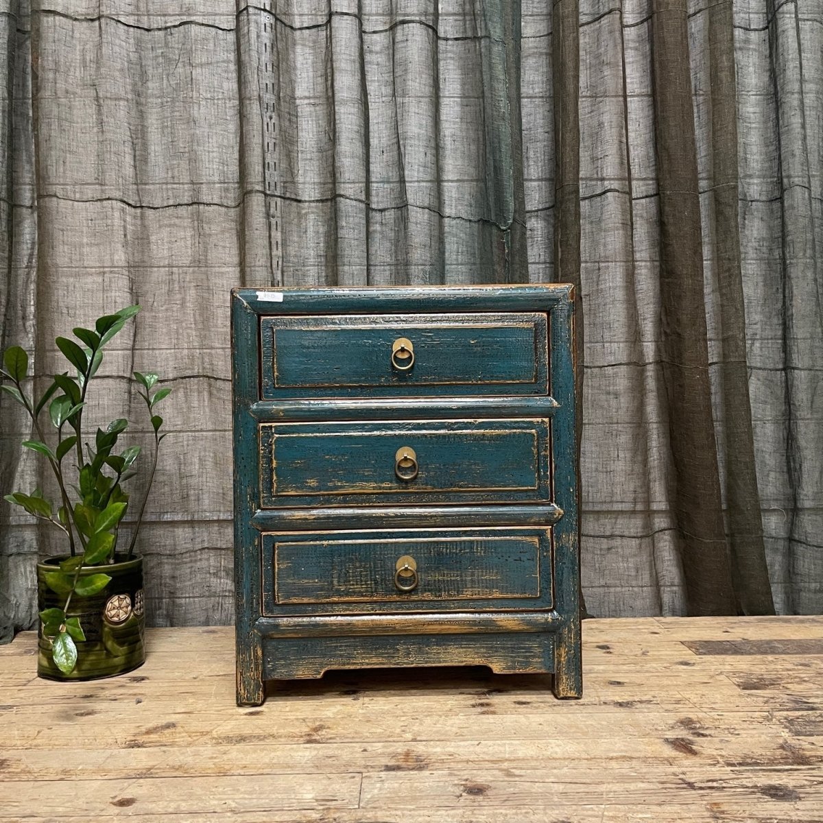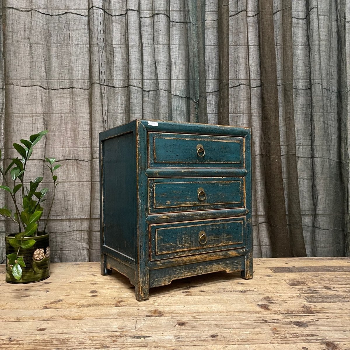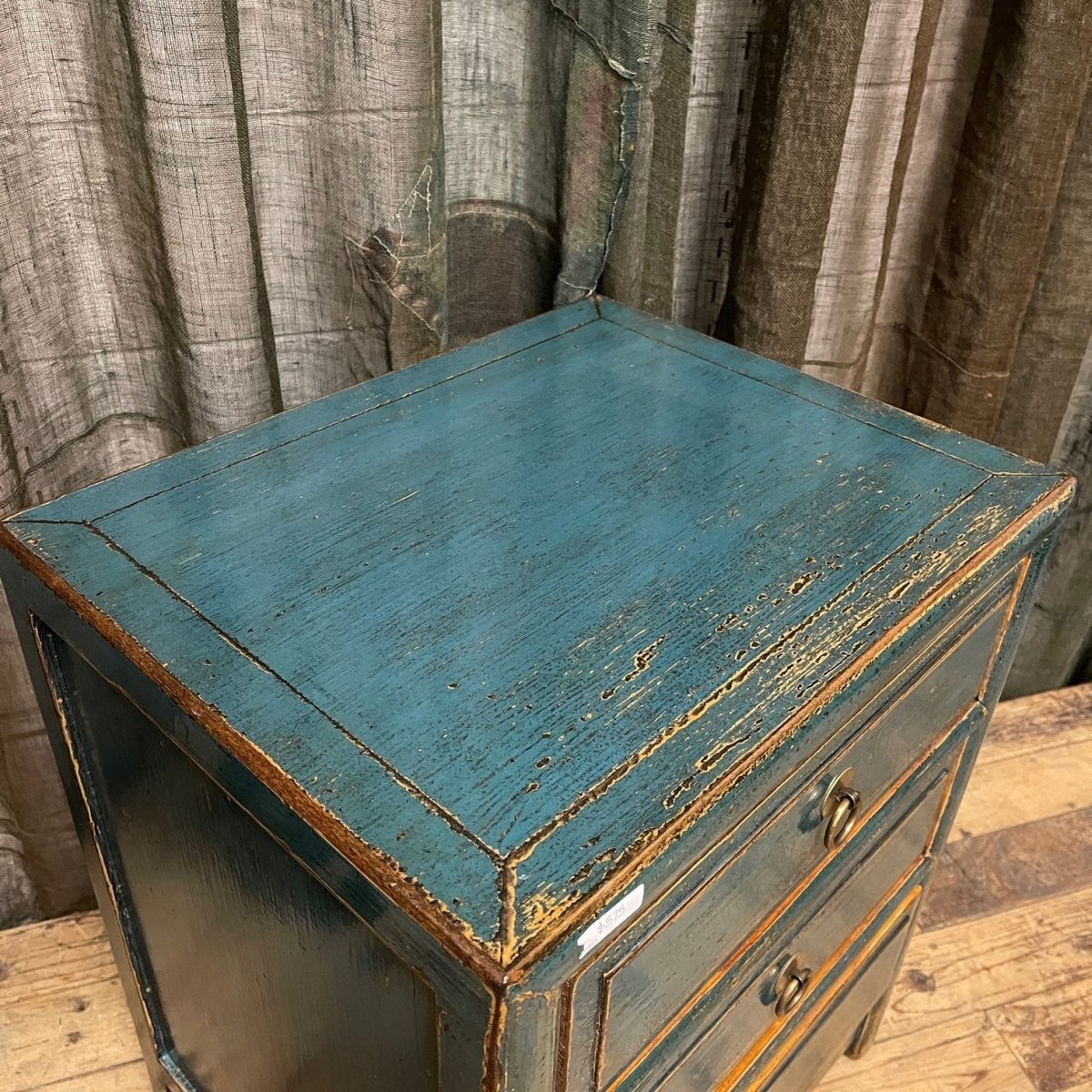 Provincial style Chinese blue lacquered side cabinet, featuring three drawers.