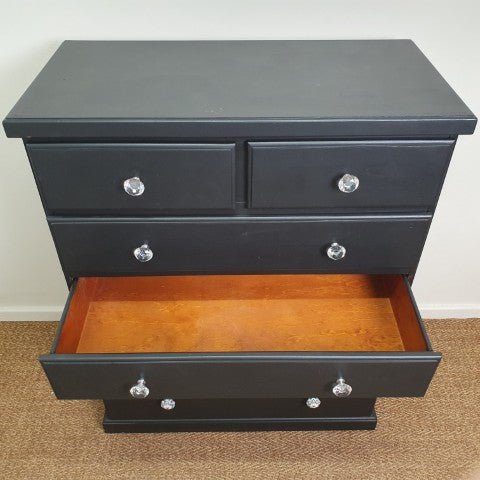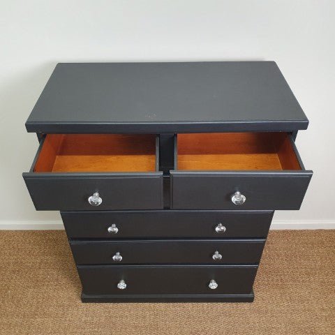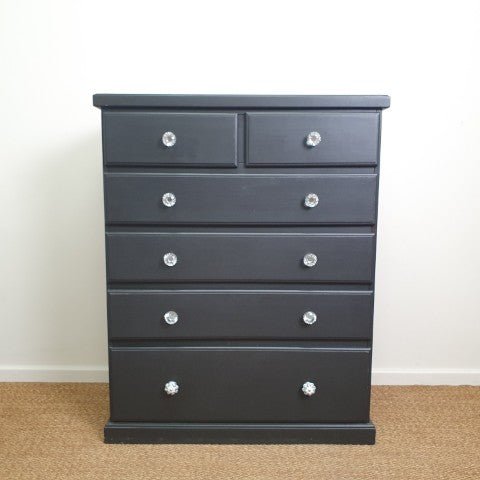 This tall boy chest of drawers in black features multiple drawers and a classic silhouette that brings practical storage and subtle style to your bedroom or living space.