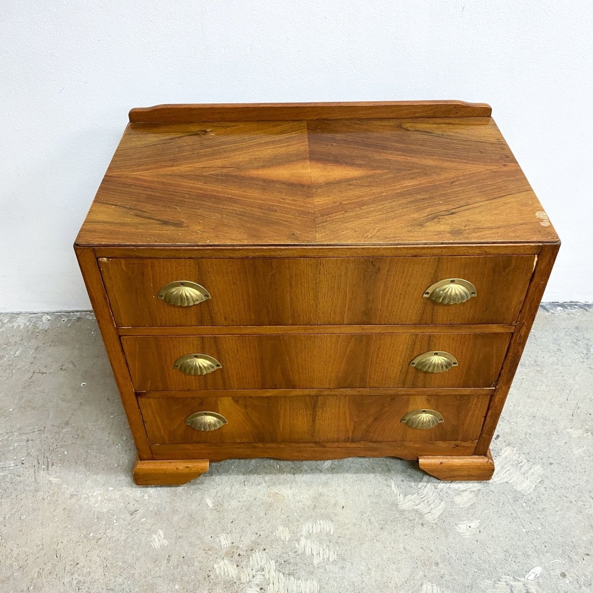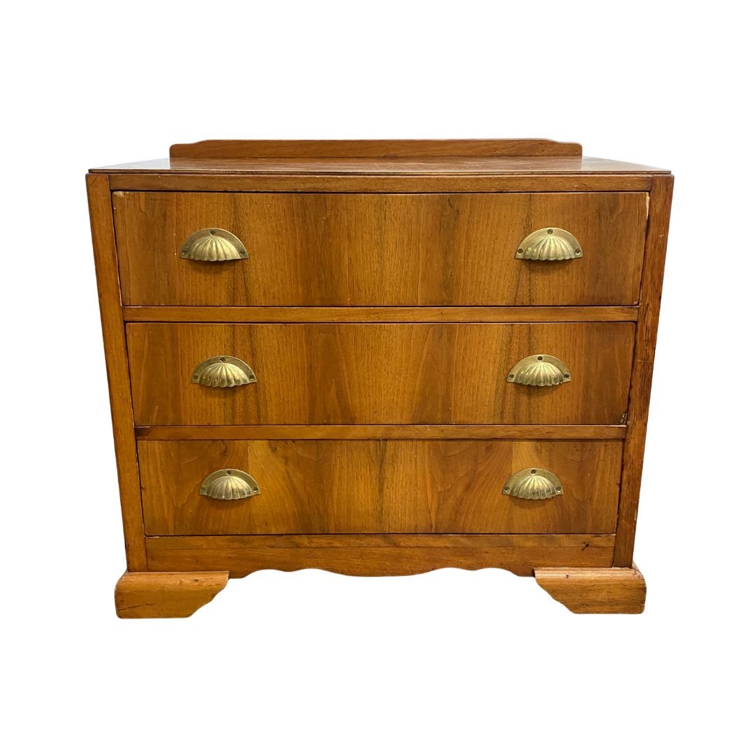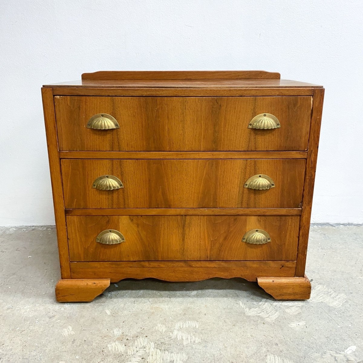 Charming Deco period chest of drawers, featuring 3 generous sized drawers with brass shell handles. In good original condition with signs of wear consistent with age.