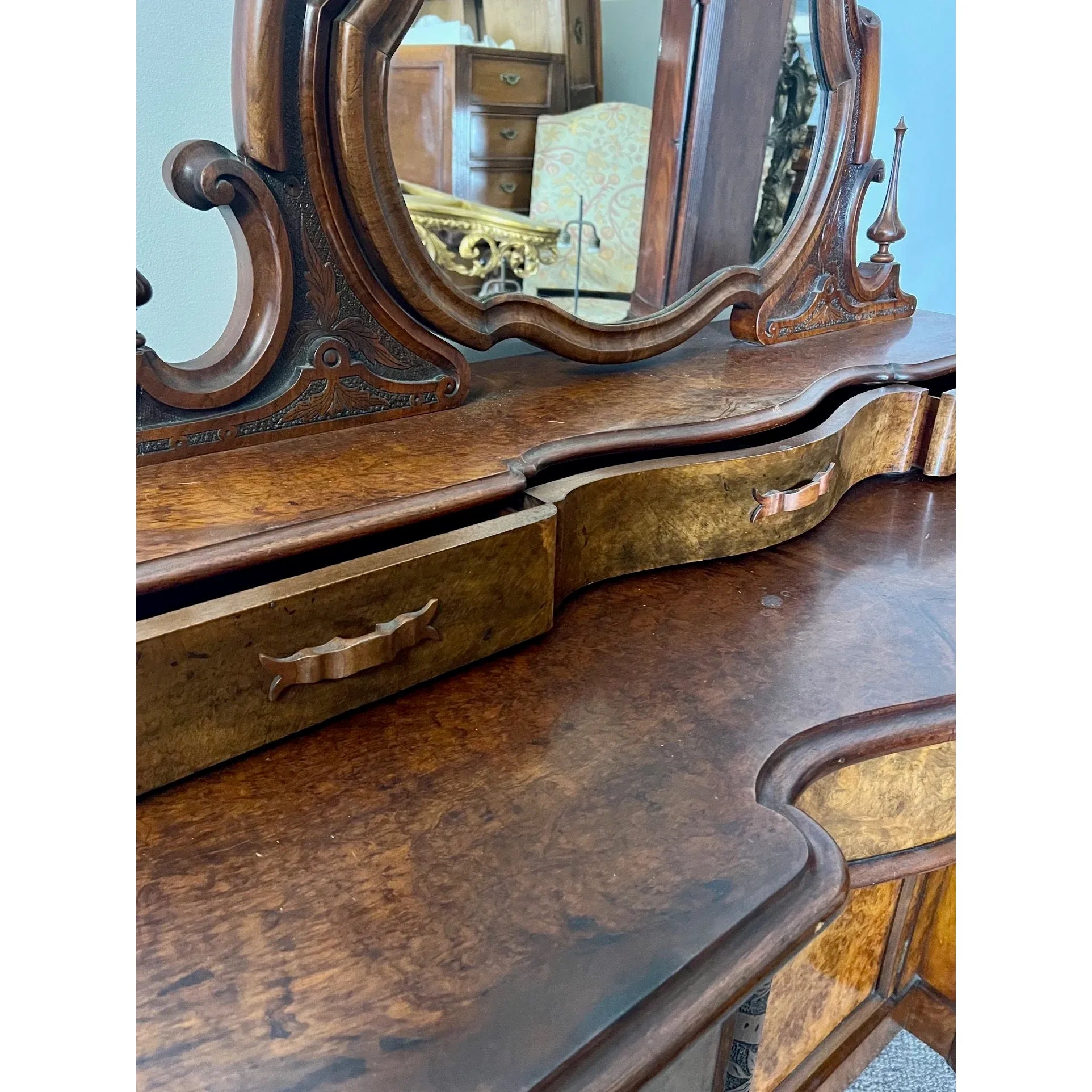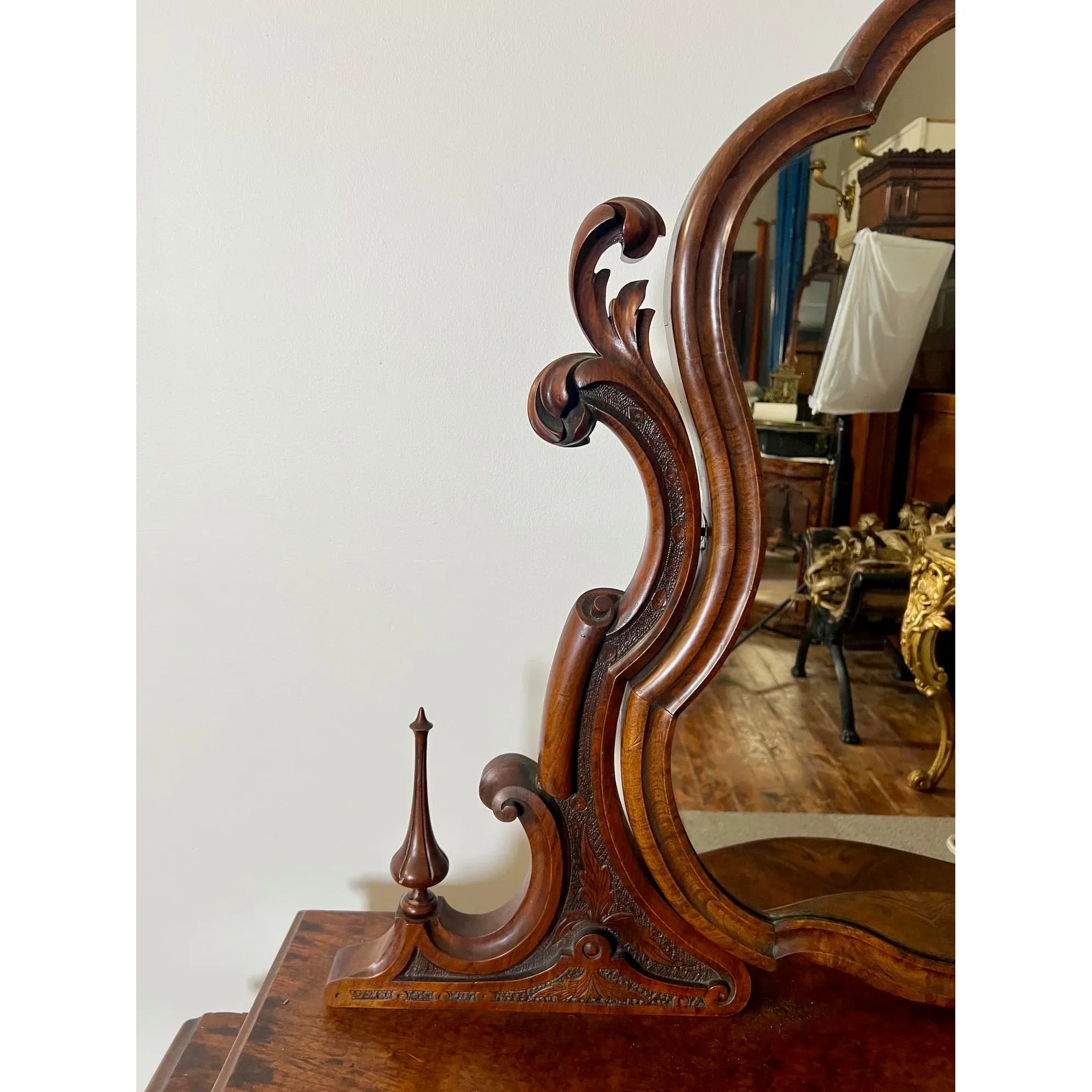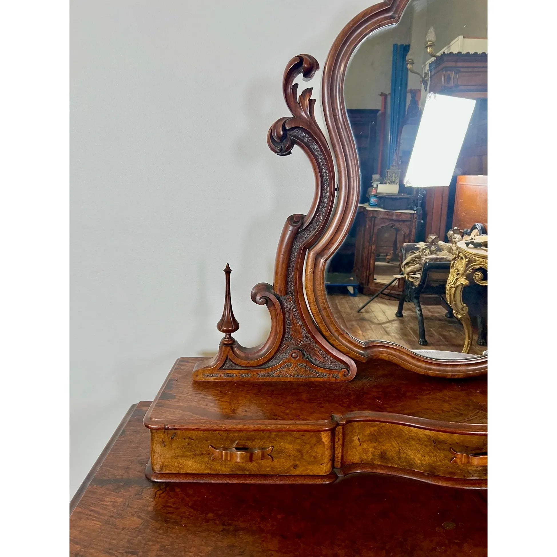 The top section features a serpentine framed swing mirror supported by opposed shaped and carved ‘S’ scrolled brackets. which rise from a raised platform with three side by side jewellery drawers of which the middle one is serpentine fronted and all drawers have decorative carved ribbon shaped draw pull handles.
