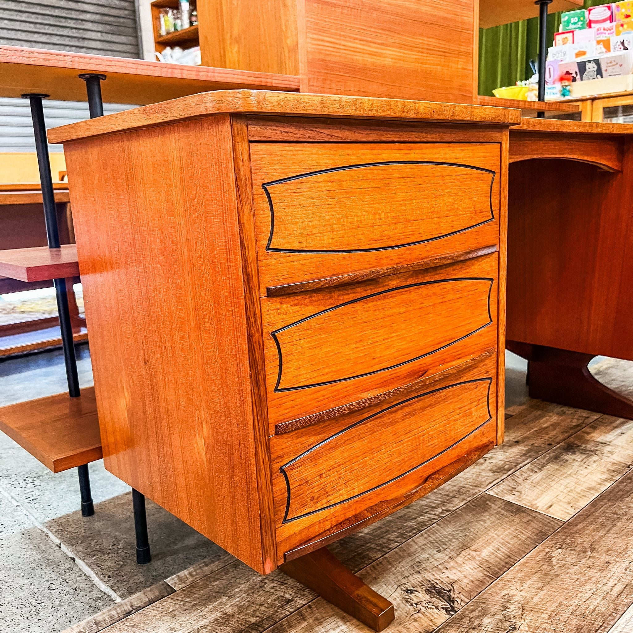 Featuring sculpted drawer fronts, generous storage on both sides and elegant curved feet, it showcases classic mid-century Australian craftsmanship with a warm timber finish.