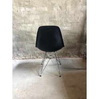 The iconic Eames Eiffel Chair features a molded plastic shell with a steel wire “Eiffel” base. Its intricate, graceful design combines light, elegant forms with remarkable structural strength.