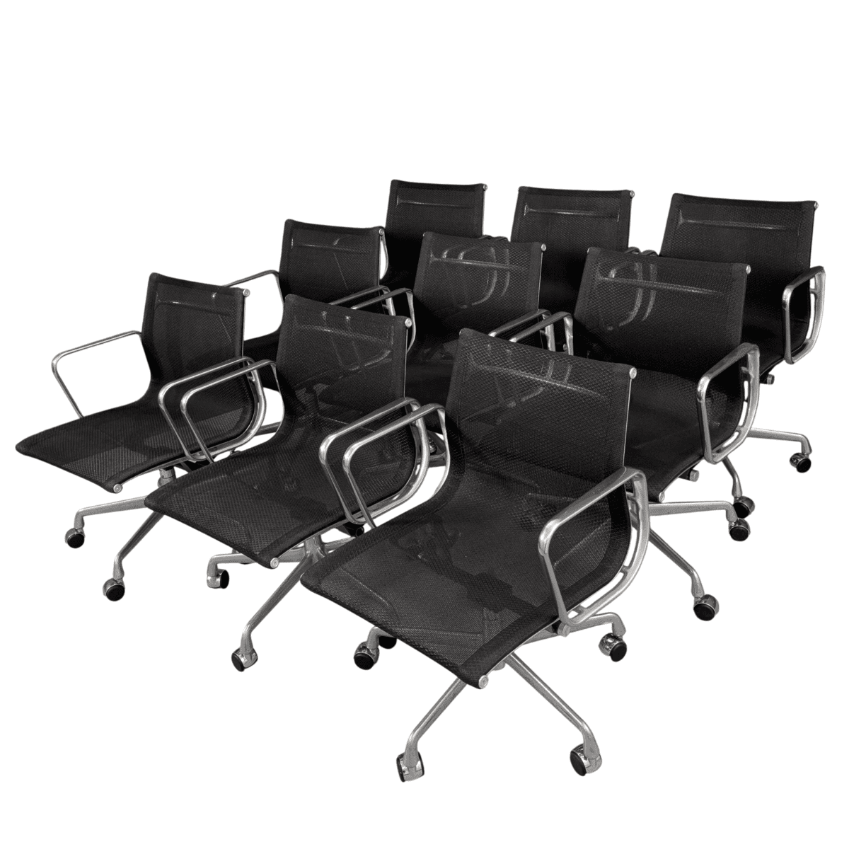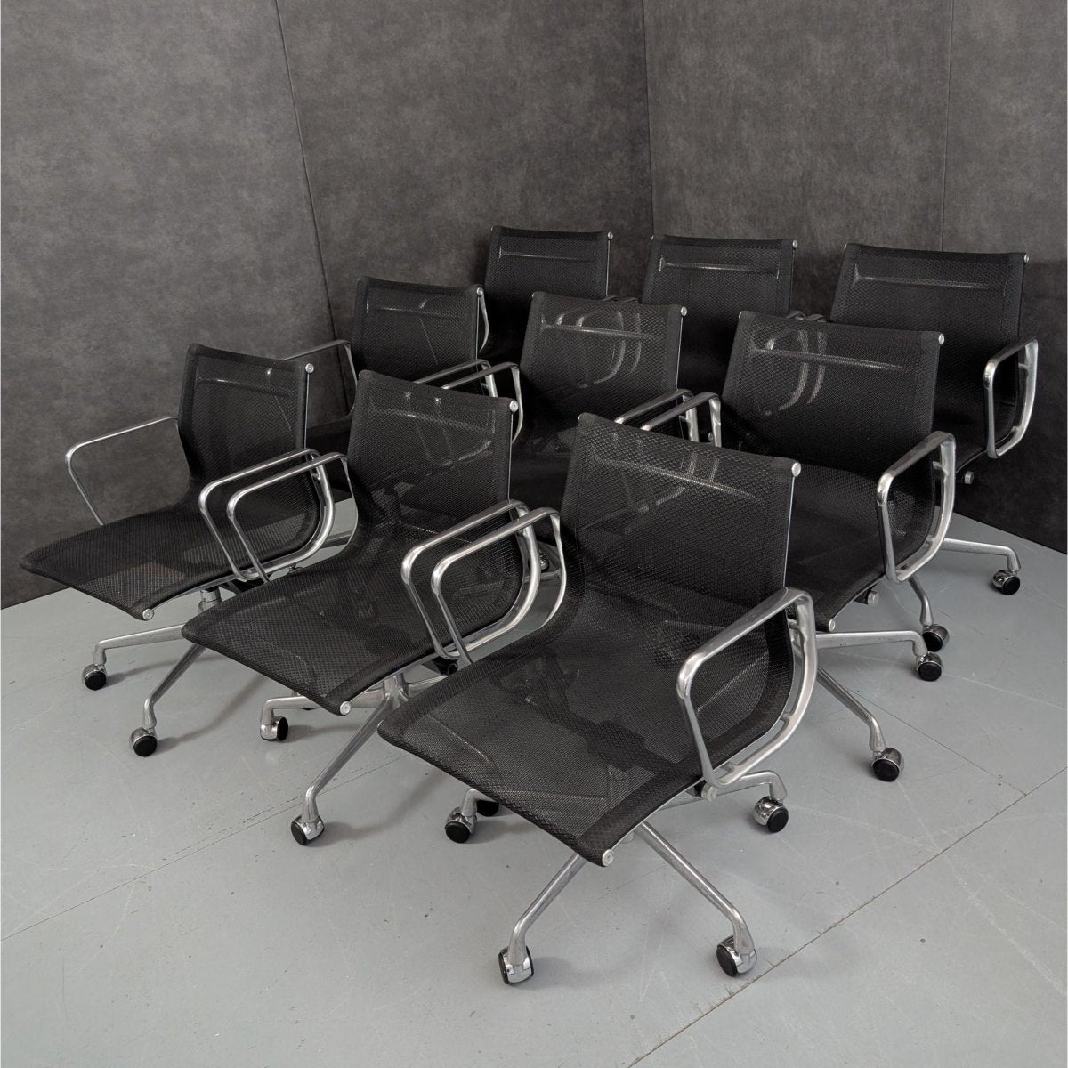 Designed by Charles and Ray Eames for Herman Miller, the Aluminium Group has been in continuous production since the late 1950s and remains one of the most recognised office seating lines worldwide. This fifteen piece collection was produced in 2006 and 2007, each chair retaining its original manufacturer sticker and finished in black woven mesh. The nine (9) EA335 models include height adjustment, swivel and tilt, while the five (5) EA330 models maintain the classic fixed base. The single (1) matching contract table unifies the set and offers a rare chance to secure a commercial grade suite in a single upholstery and finish.