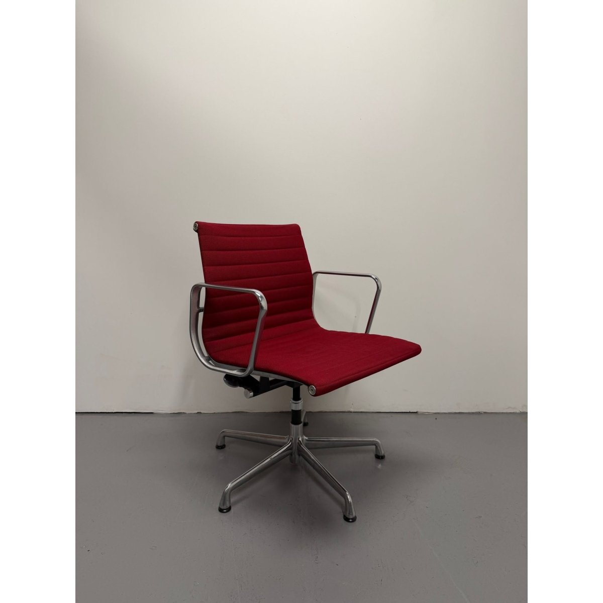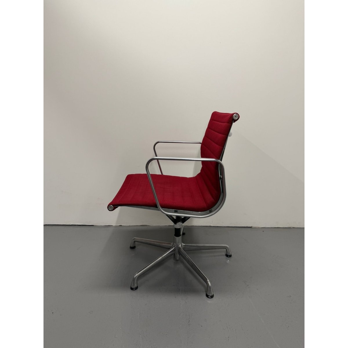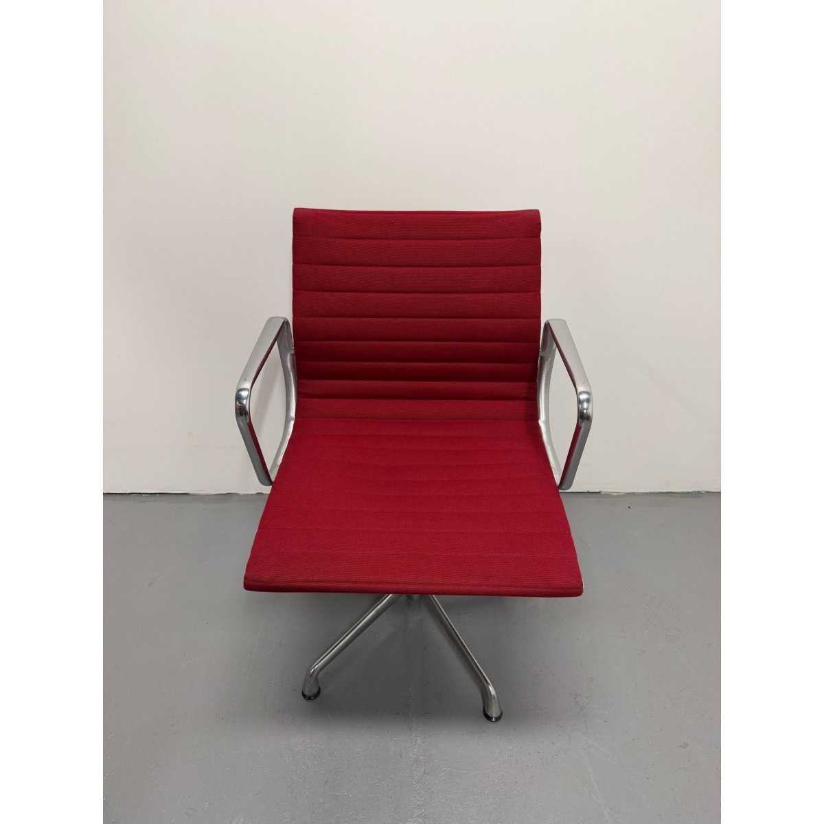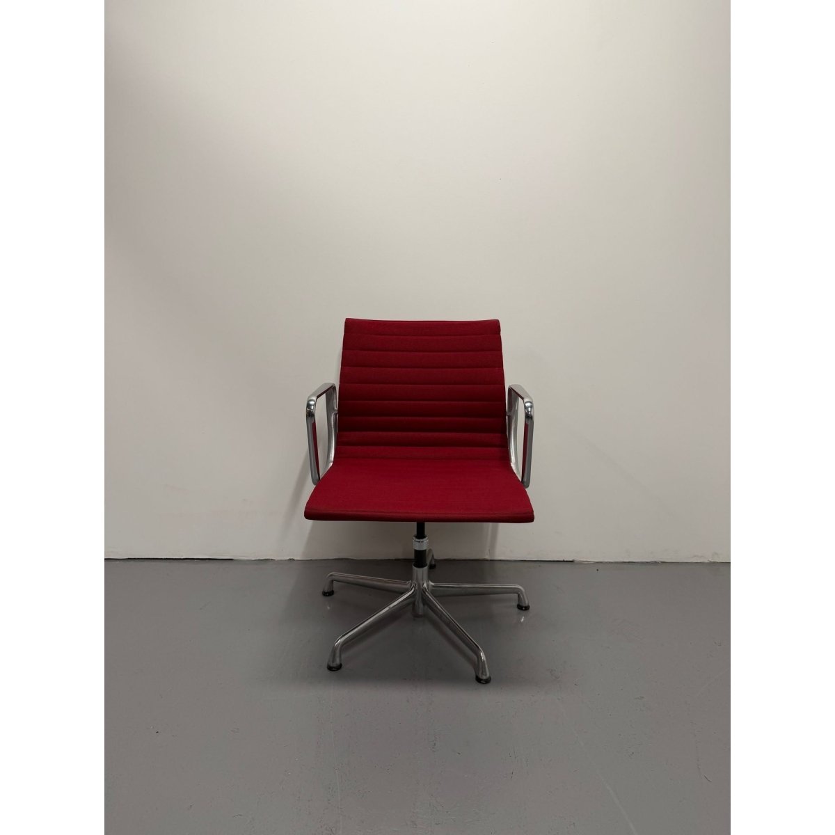 Finished in a deep red fabric upholstery with a polished aluminium frame, this piece brings mid-century sophistication into a modern workspace. Designed by Charles & Ray Eames, the Aluminum Group series is one of the most iconic chair collections of the last century.