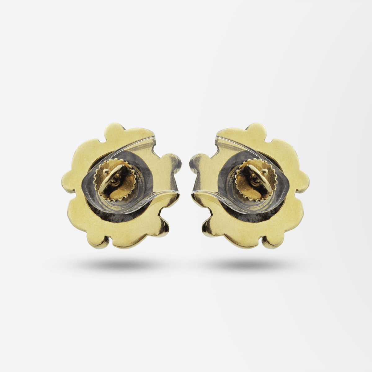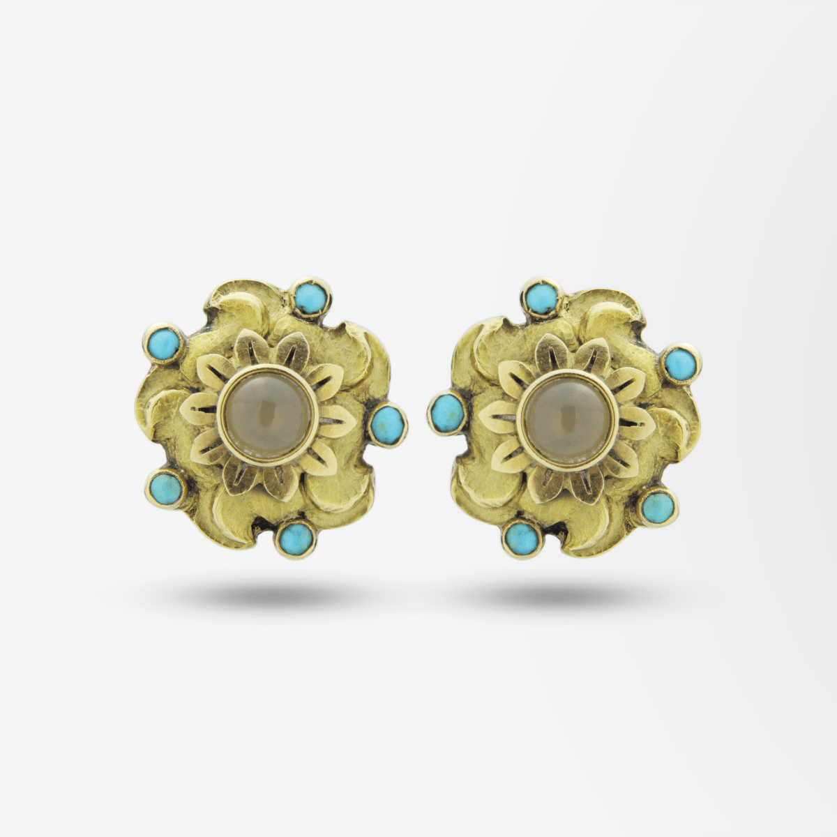A fine pair of 18kt yellow gold, agate and turquoise stud earrings. The pair are finished beautifully with cabochon cut turquoise pieces and a cabochon agate in the centre, surrounded by gold flower petals. The hand sculpted and hammered gold is reminiscent of fine Italian jewellery, however is unmarked. The studs feature screw on backings adding extra security for the owner when wearing.