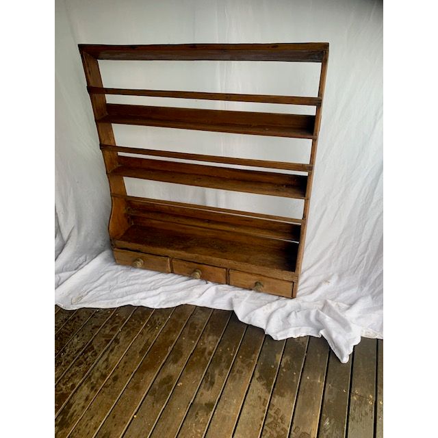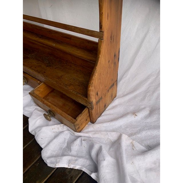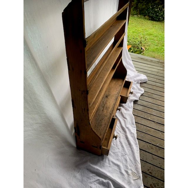 A unique rustic 19thC Irish farmhouse wall hanging rack for plates with 3 drawers which show dovetail joints. A lovely decorative display piece. Circa 1870. Honey coloured with bee’s wax finish.
