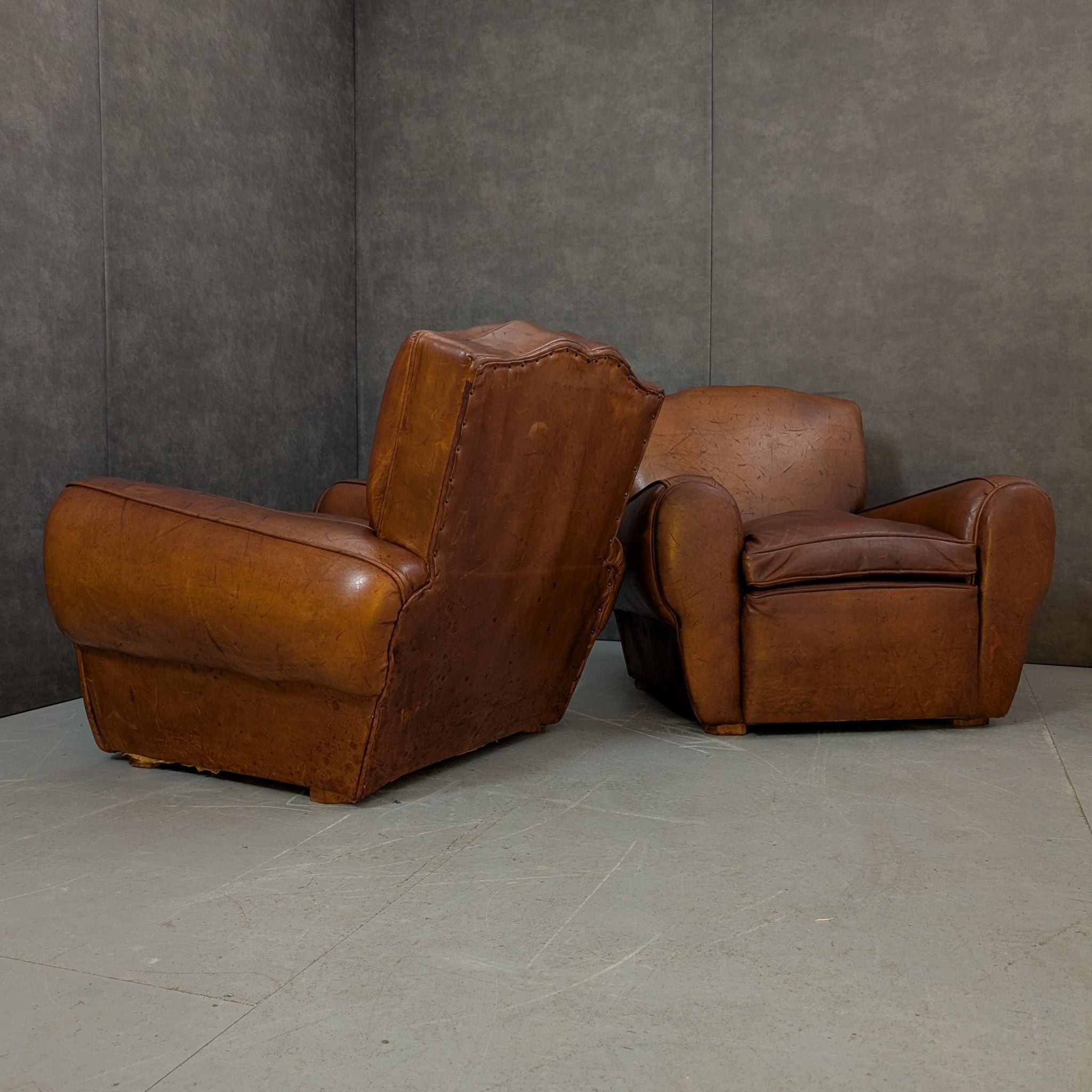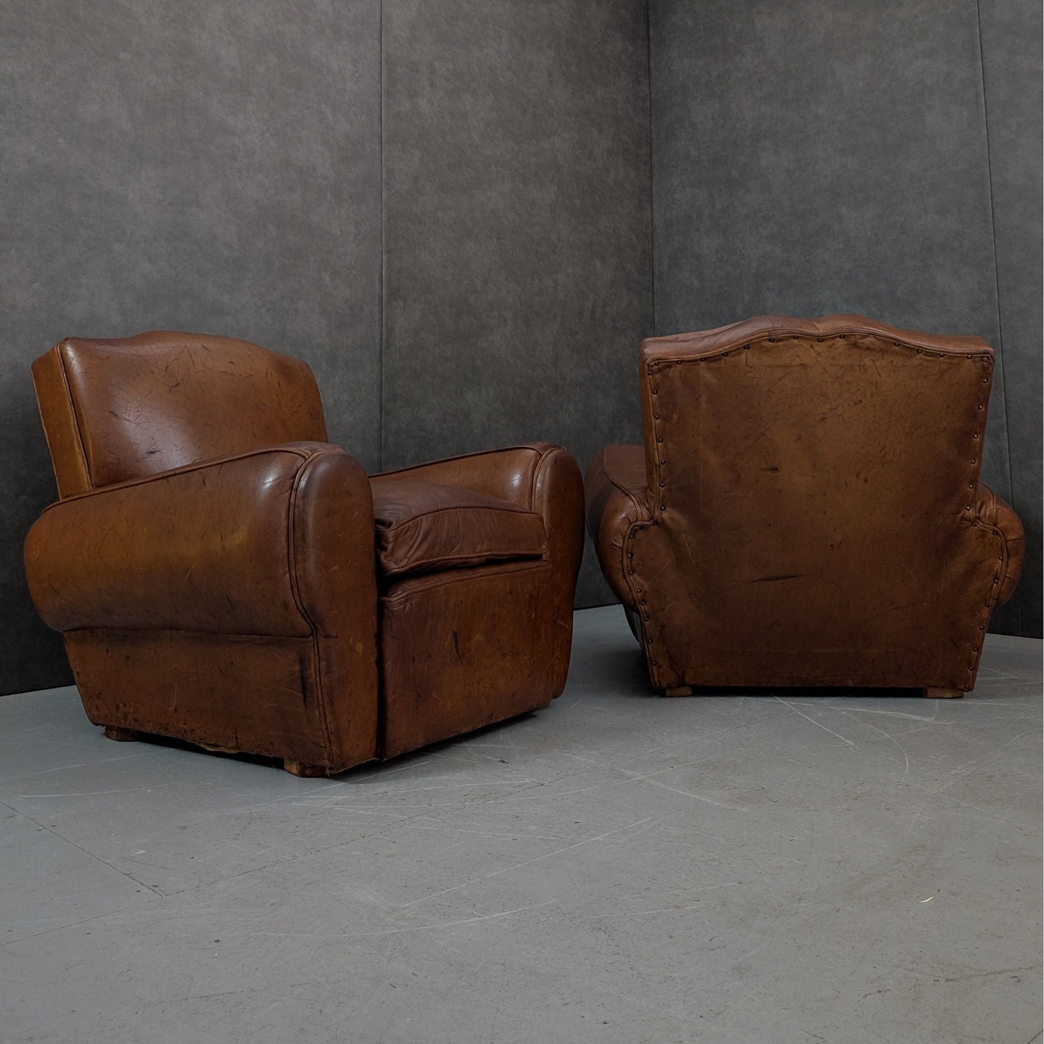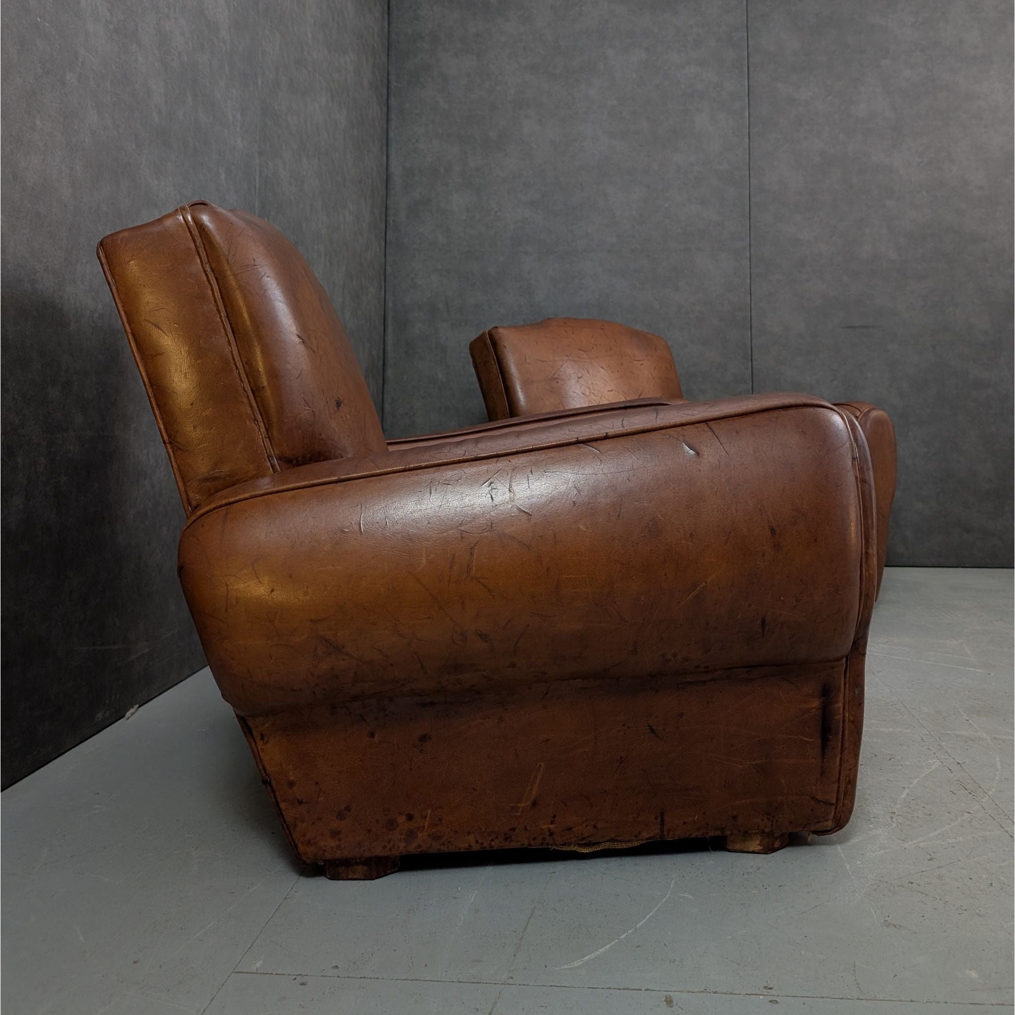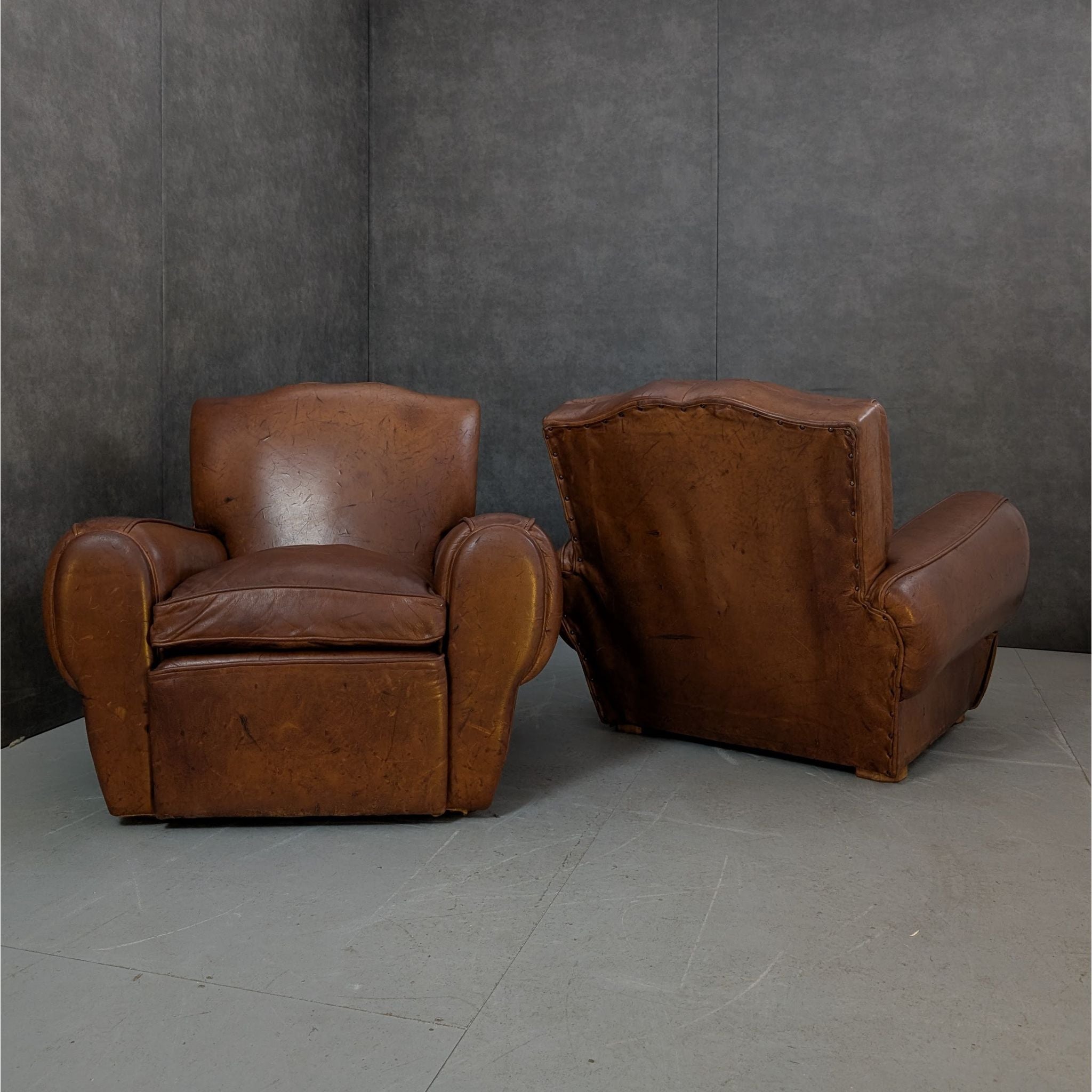 French club armchairs of this type became widely produced during the interwar period, particularly from the 1920s through the 1940s, when deep leather lounge seating defined the atmosphere of cafés, smoking rooms, and private salons. These examples feature the characteristic moustache shaped backrest, a softly curved crest that distinguishes many French club designs of the era, paired with generous rolled arms and thick leather upholstery secured with visible studwork. Constructed for durability and long seated comfort, the chairs rely on heavy frames, deep cushioning, and full grain leather that develops patina through decades of use. Today they bring the same grounded presence to interiors, reading as classic lounge seating with the warmth and atmosphere associated with traditional French club furniture.