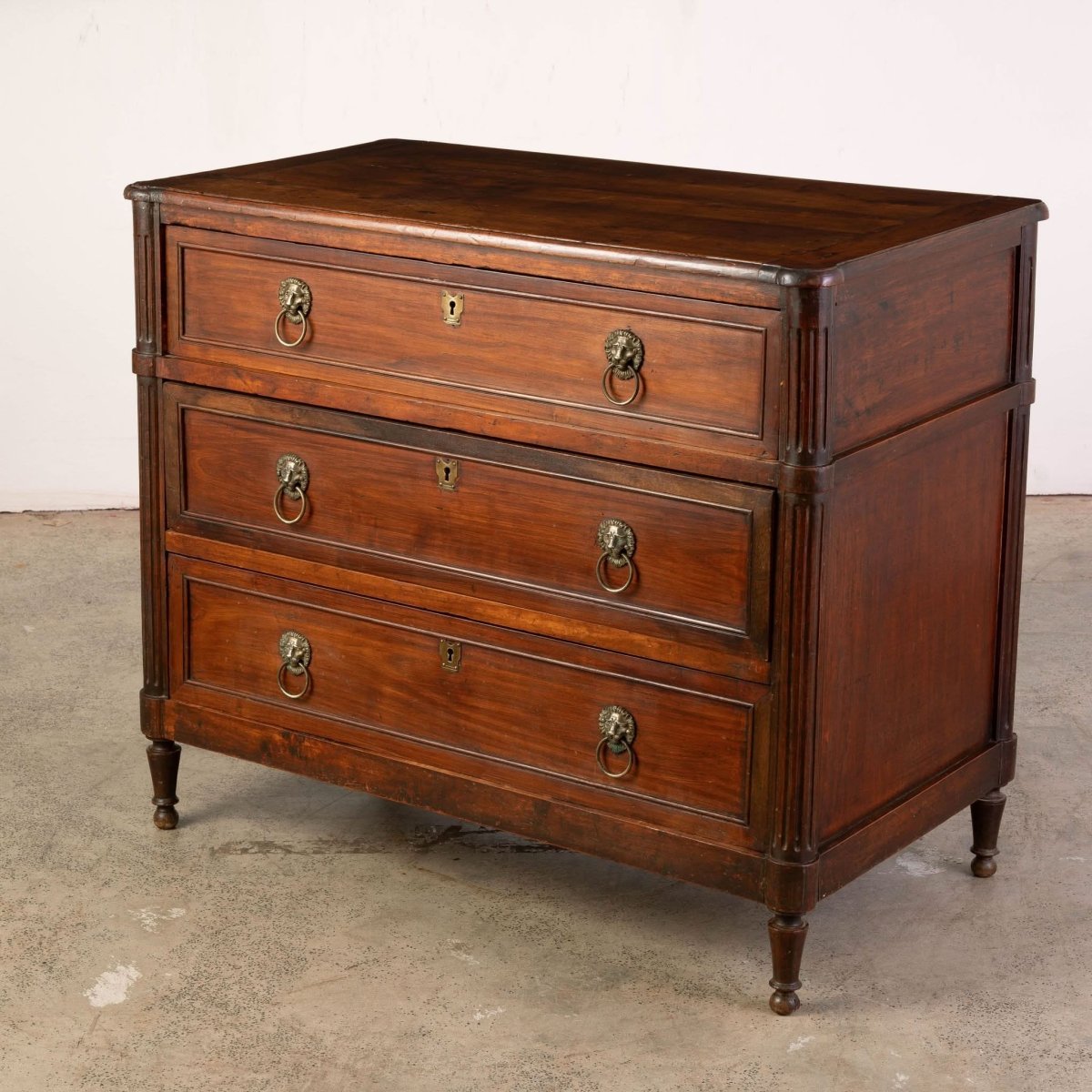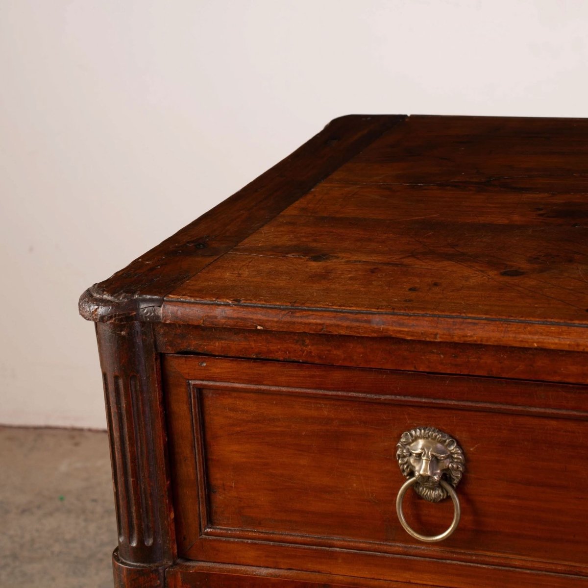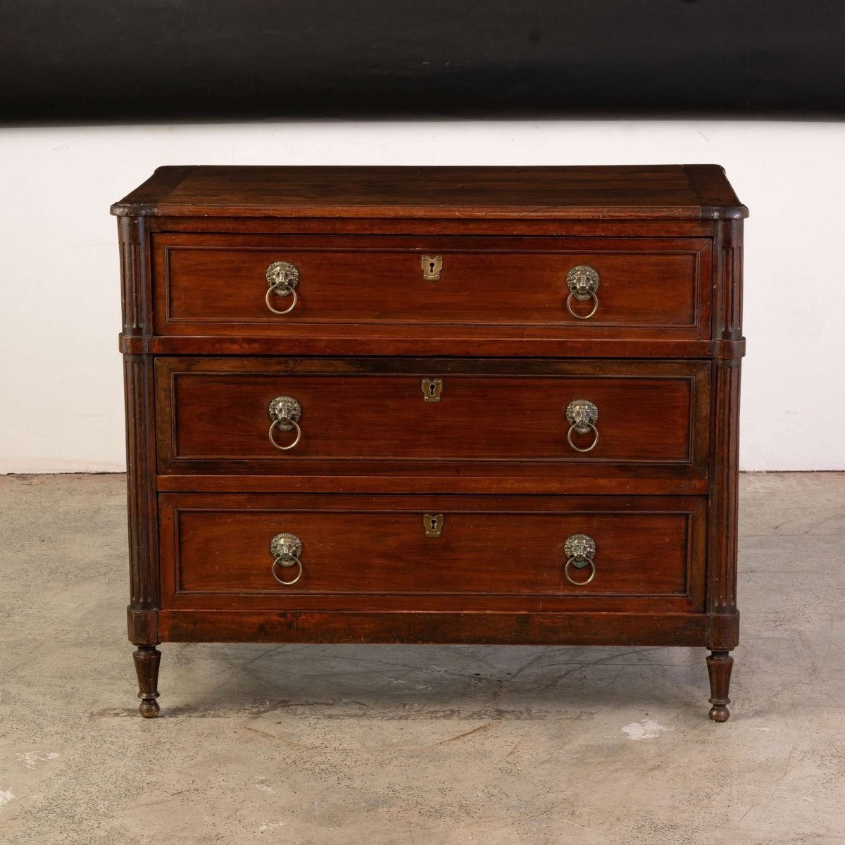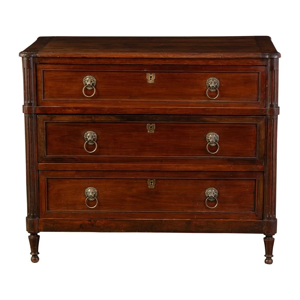 A late 18th Century Directoire commode, the top with shaped ends above three long panelled drawers, all mounted with brass lion mask handles and crown escutcheons, between fluted column ends and all raised upon turned tapering feet.