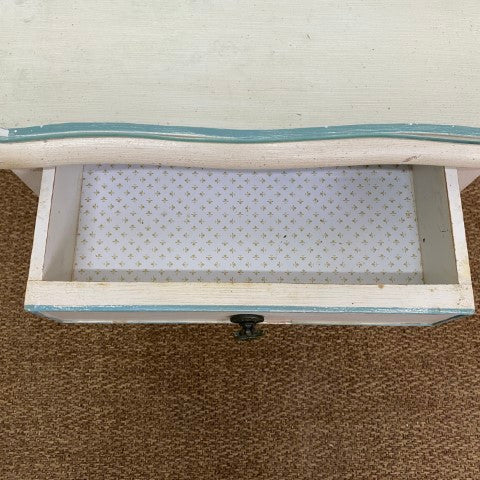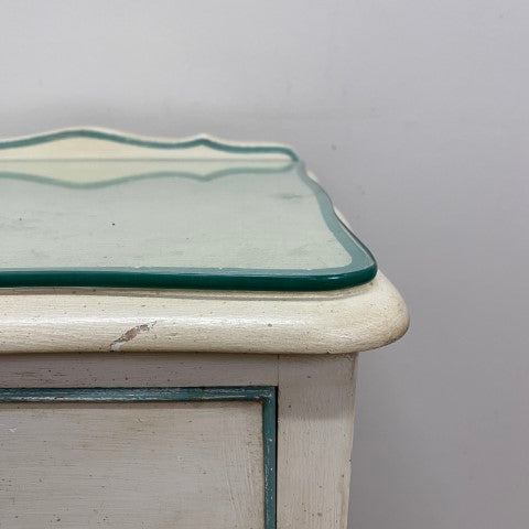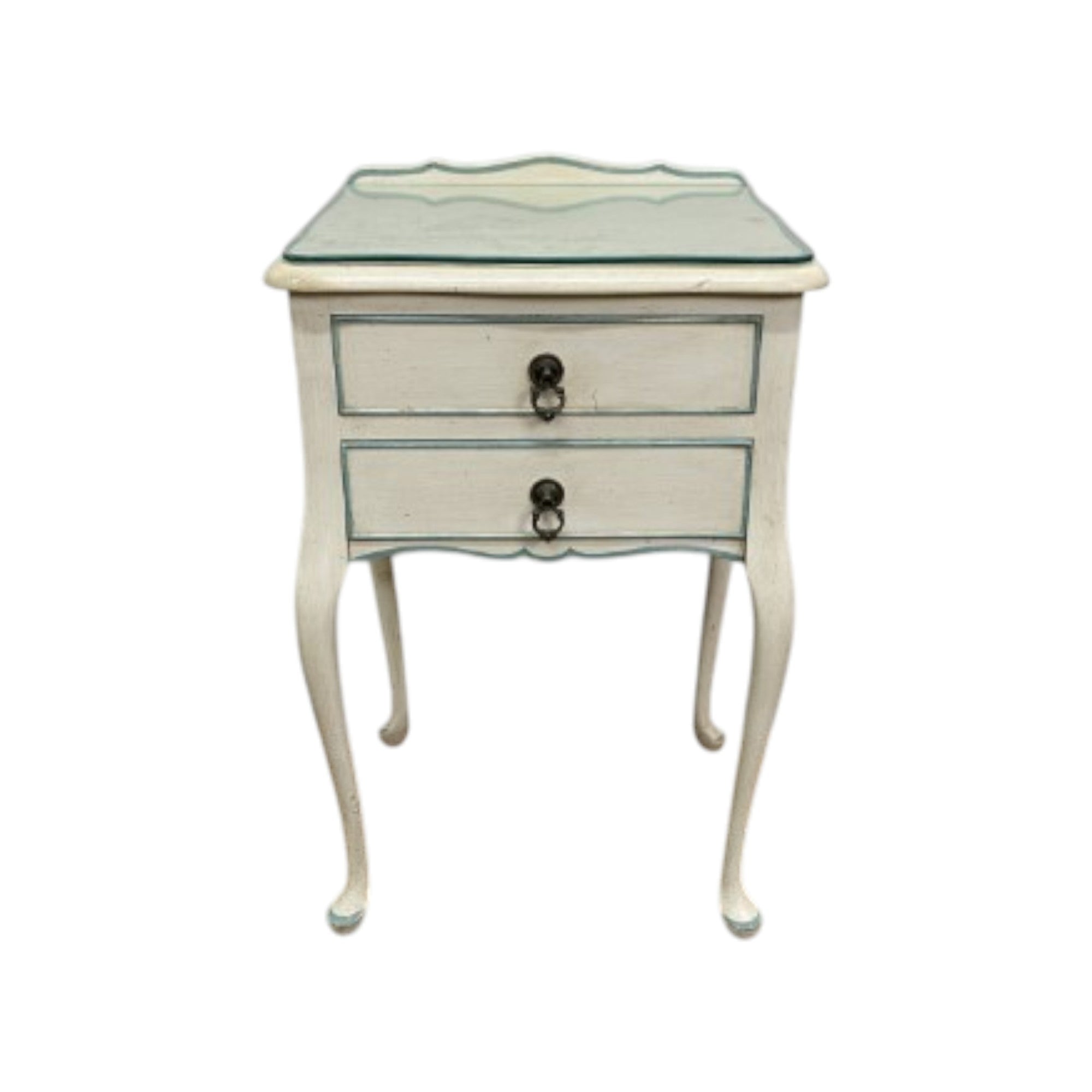 This lovely painted bedside cabinet is finished in white with soft blue accents, featuring long cabriole legs and two drawers. A custom-fit glass top adds a polished detail while preserving the painted surface. Its elegant proportions and classic French styling make it a refined decorative piece for bedrooms or living spaces.