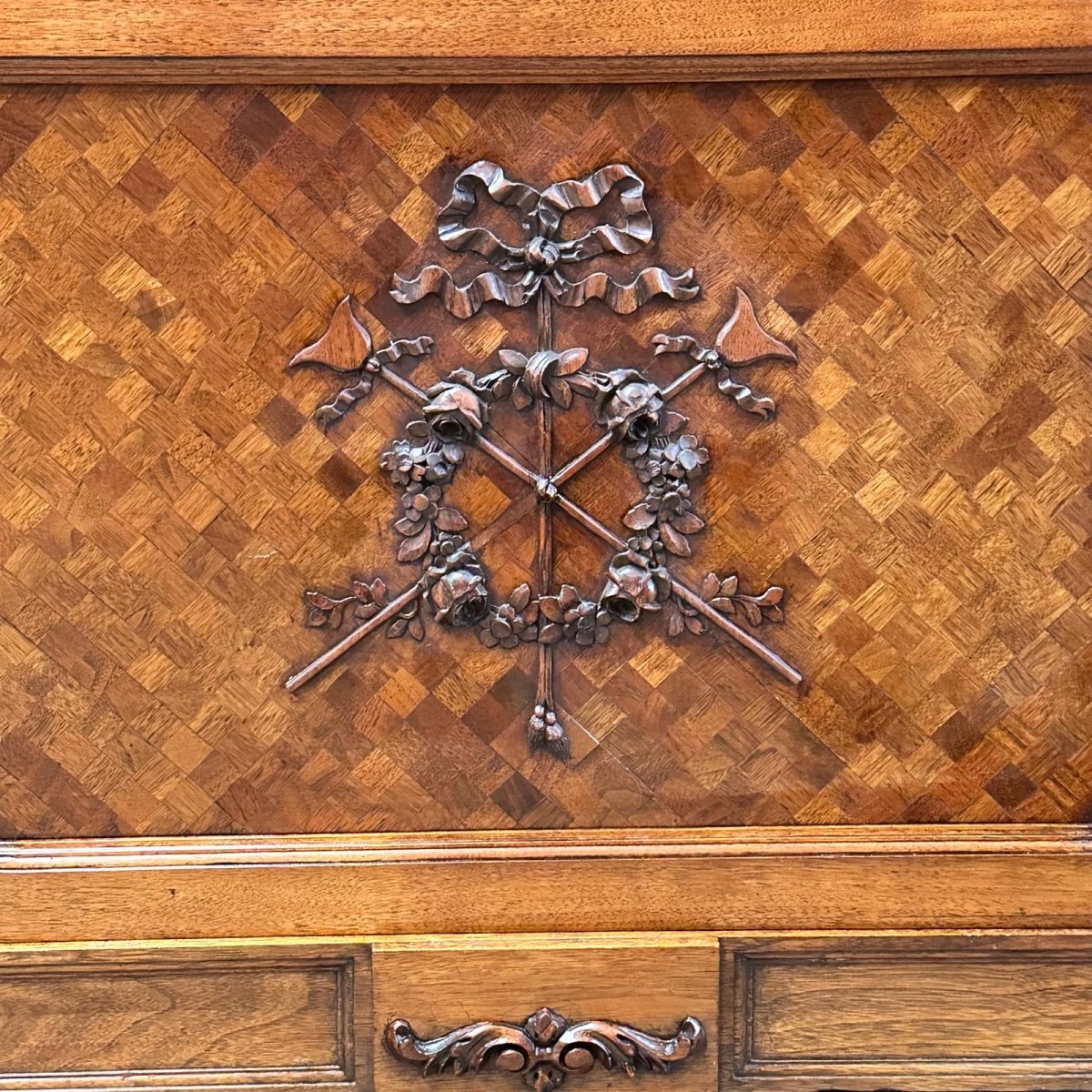 The outer door panel features a stunning parquetry design, with a central floral and ribbon motif. The cabinet is flanked by stunning ormolu mounts which finish the piece beautifully.