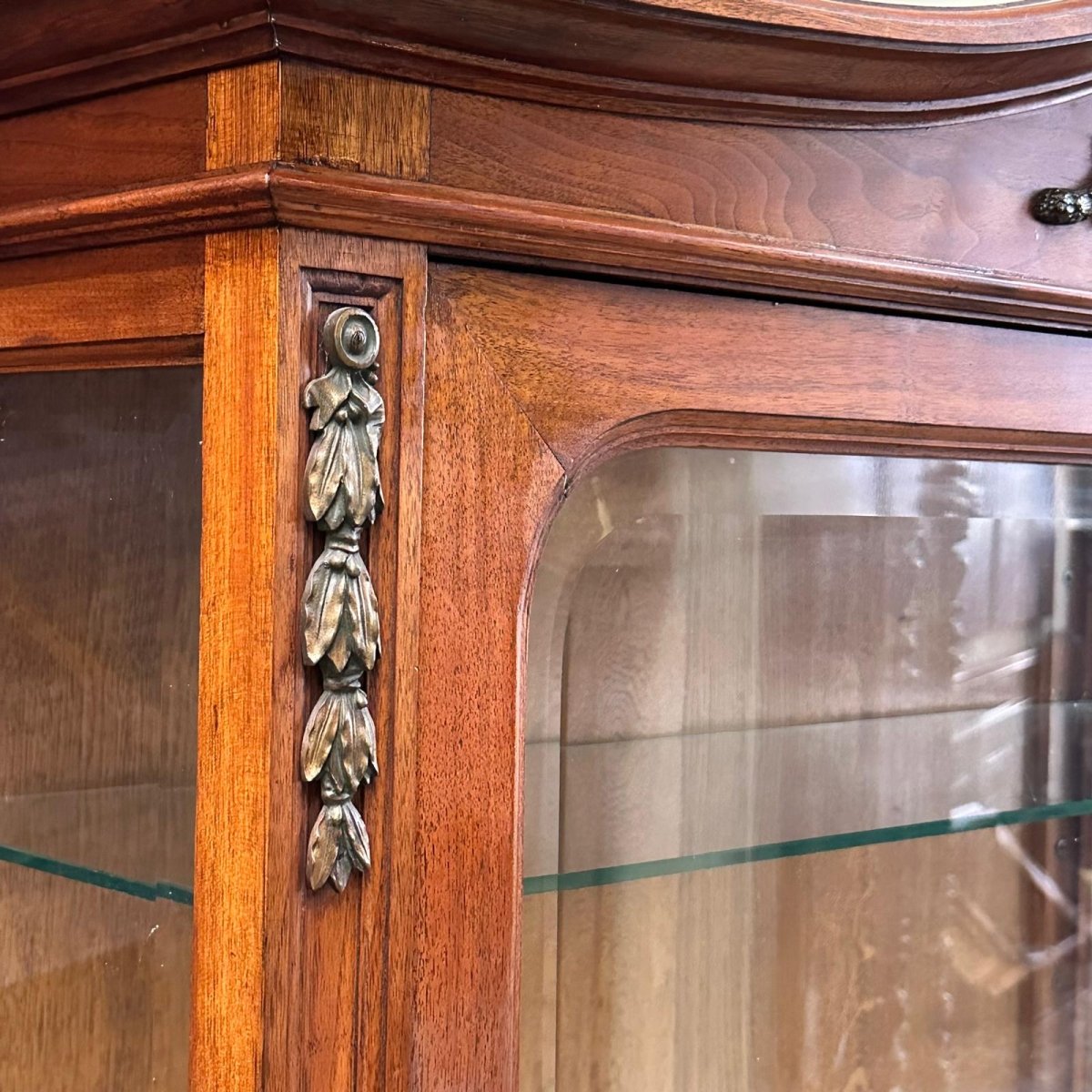 Made of lovely warm walnut, this antique display cabinet showcases the fine craft and luxury of French style. It features a single lockable glazed door, which opens to reveal 3 glass shelves and 2 lower wooden shelves.