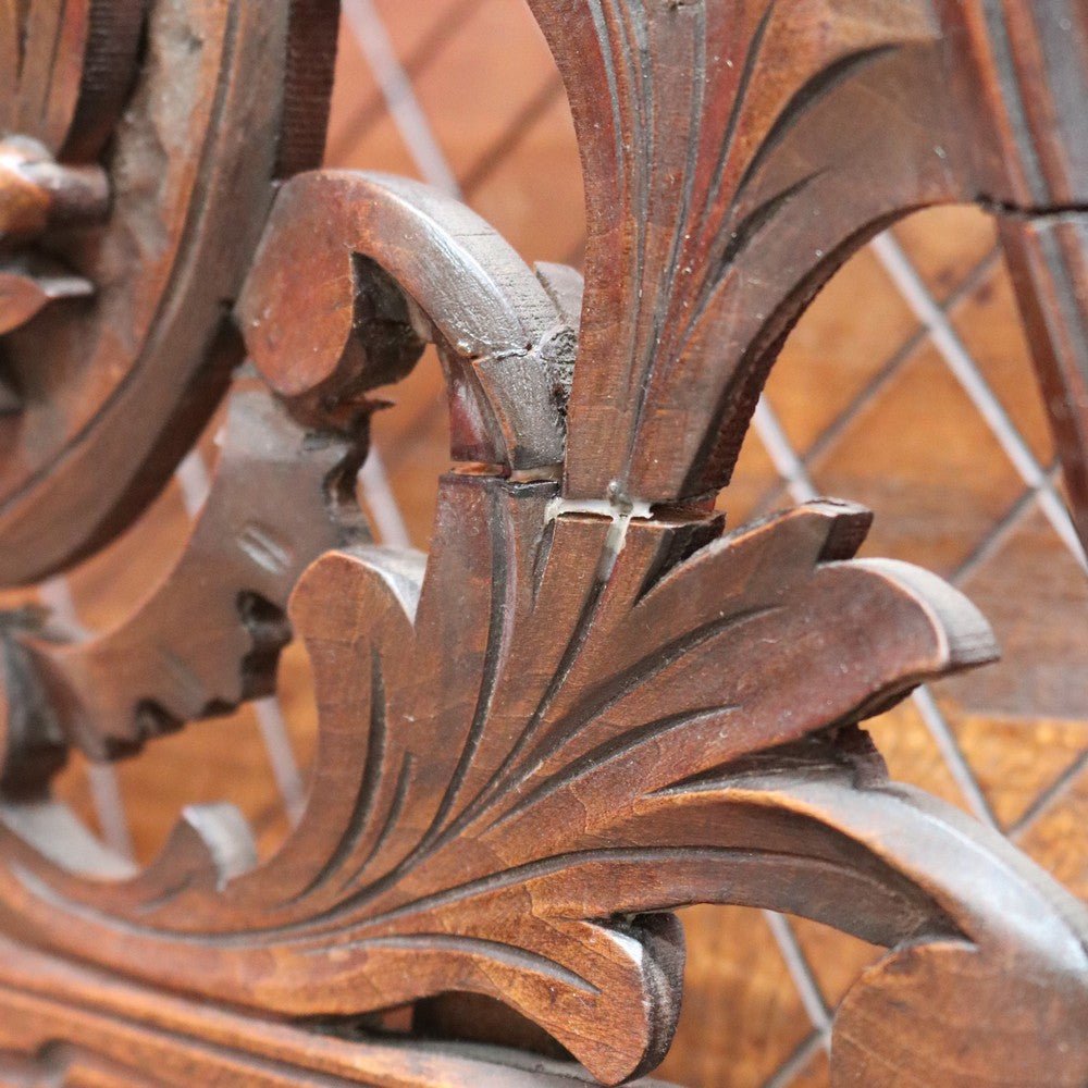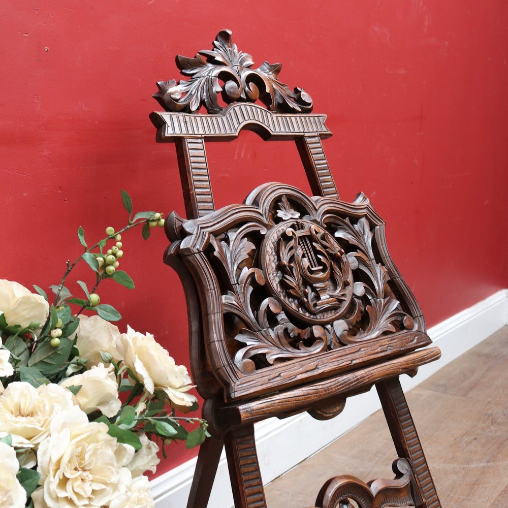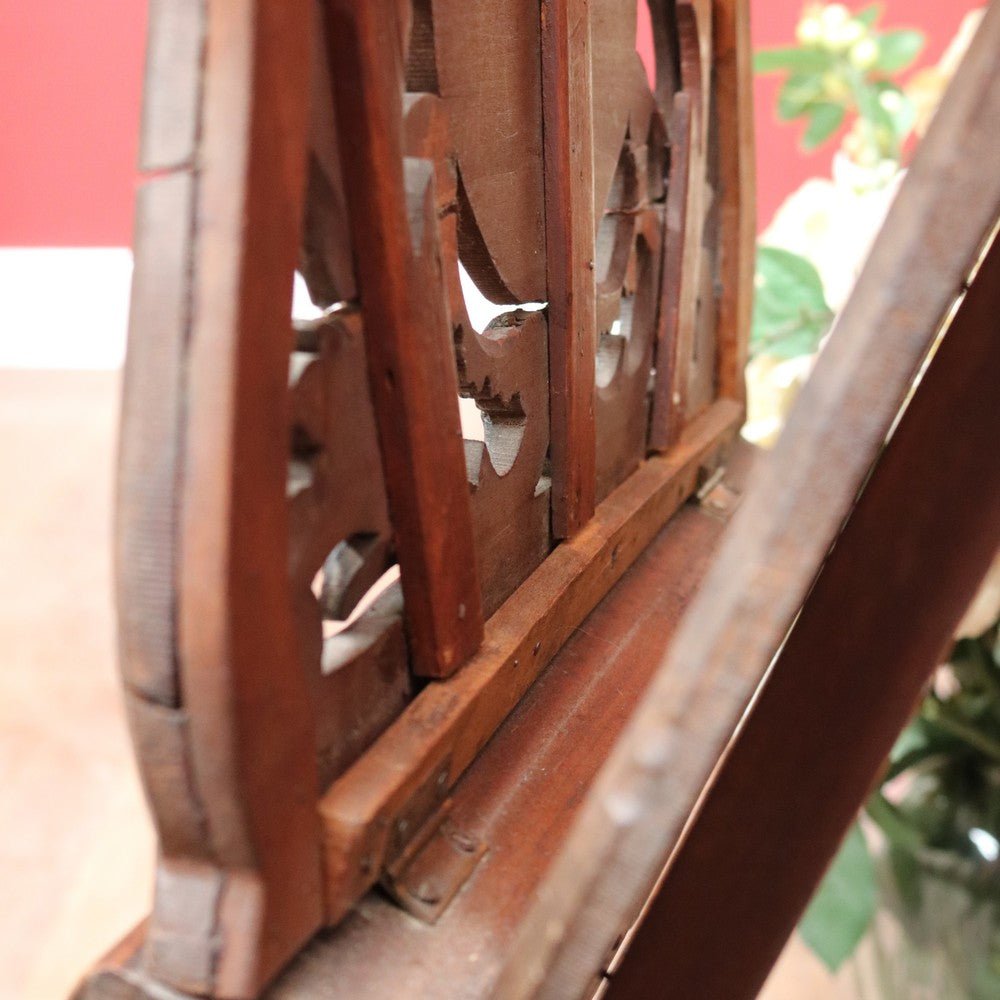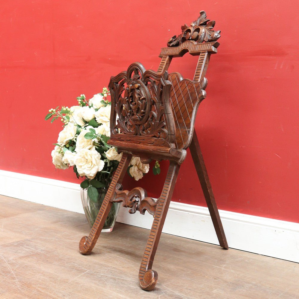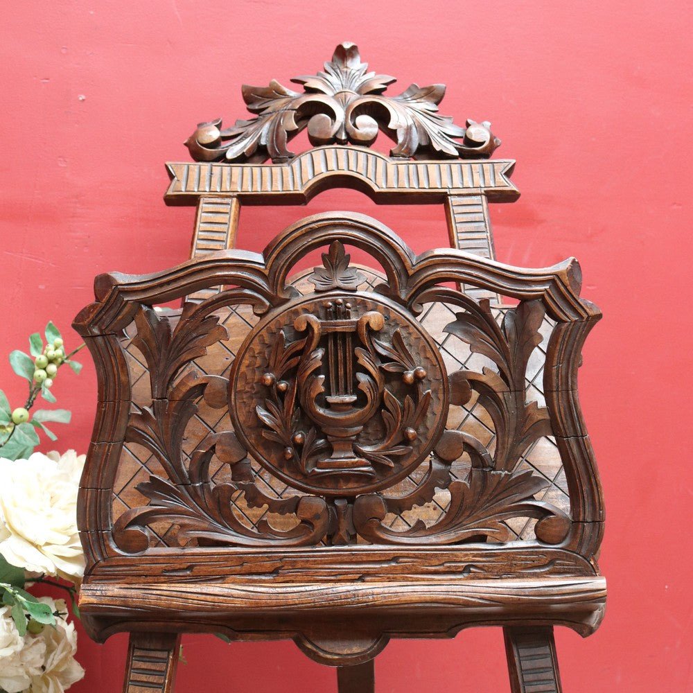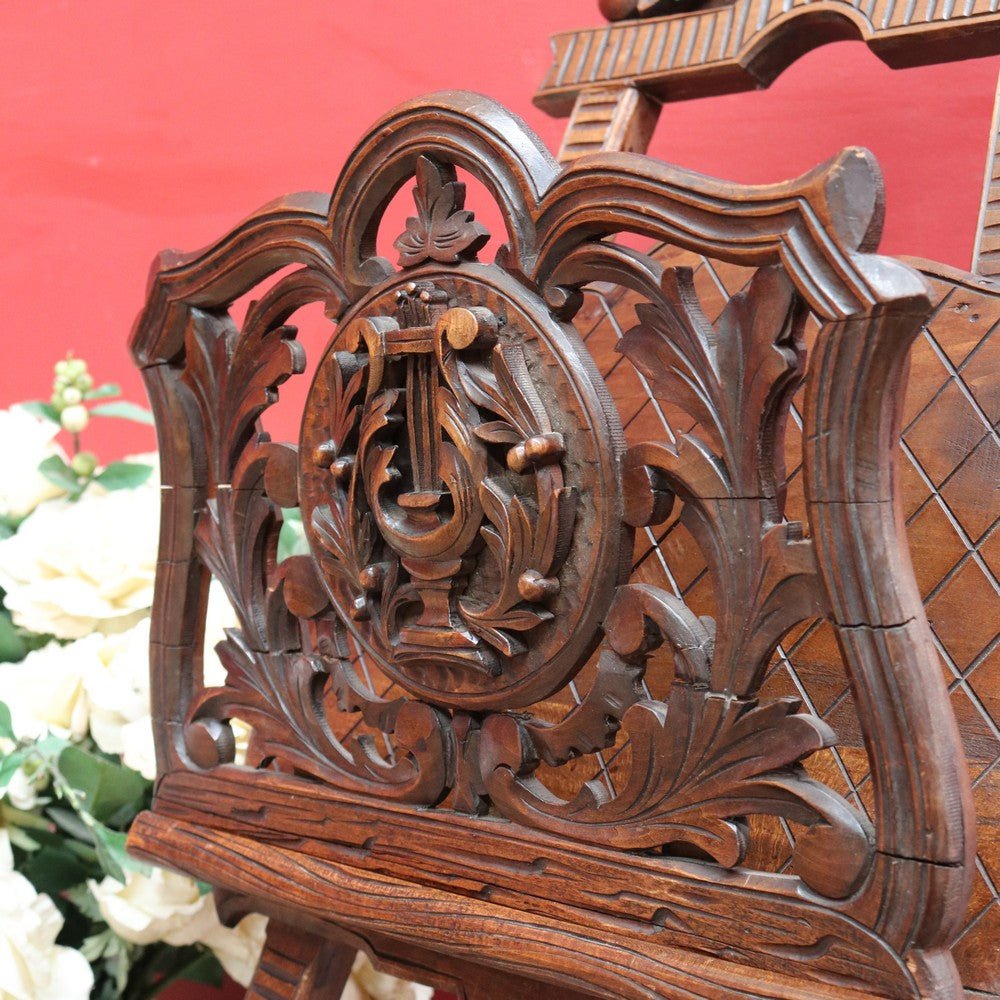 Description: A French walnut Canterbury or magazine rack designed in the form of an artist’s easel. It features a central lyre motif, a carved diamond-pattern backboard topped with a floral crown, and a shaped stretcher with scroll feet. A decorative and functional piece suitable for holding magazines, books or sheet music, with refined workmanship and elegant proportions.
