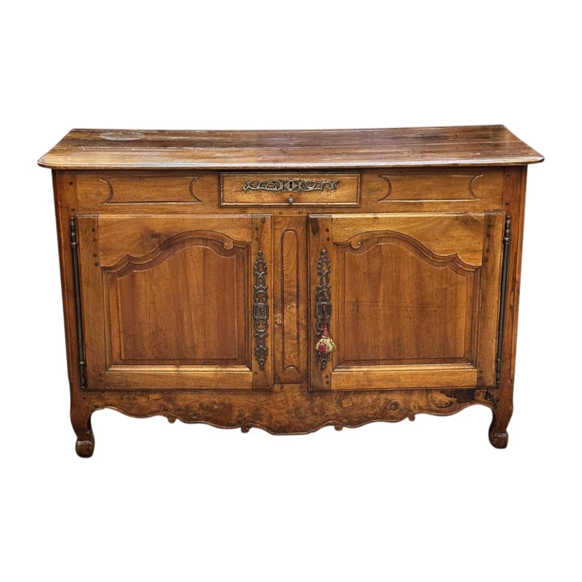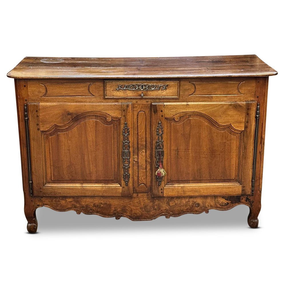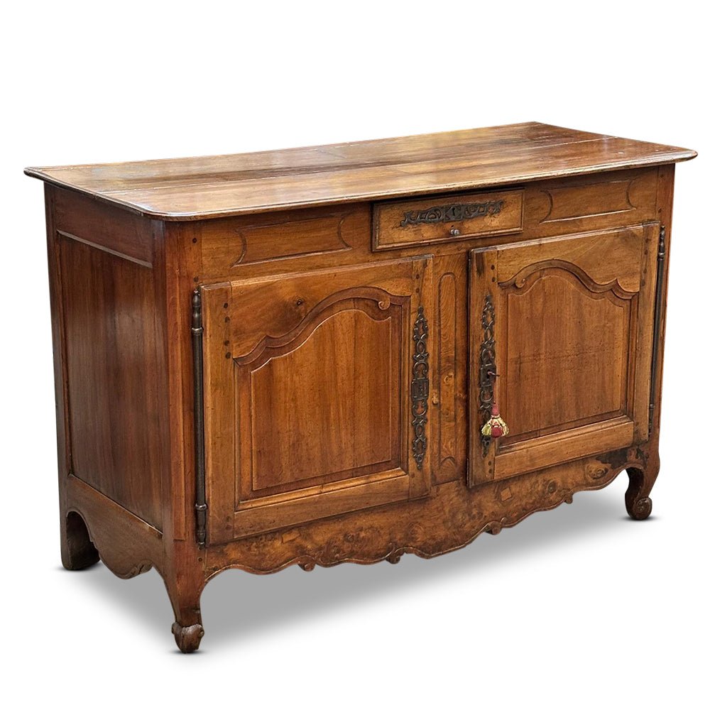 Crafted circa 1750 in Louis XV style, this buffet is made from walnut and features beautifully carved details and is further decorated with ormolu mounts.