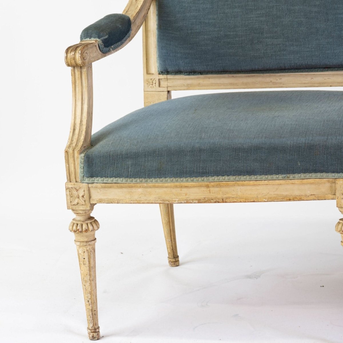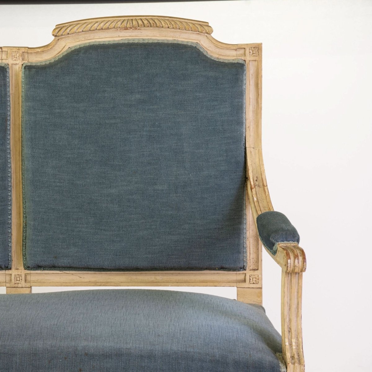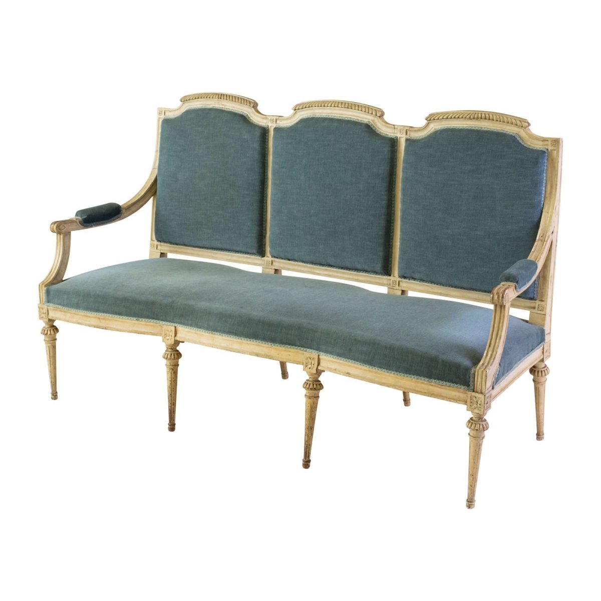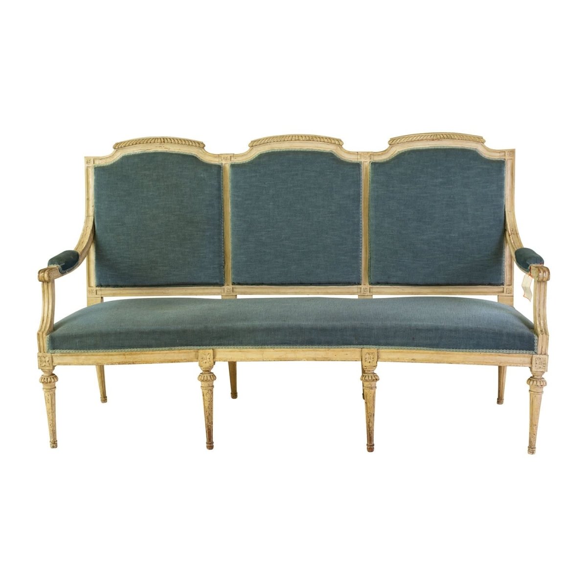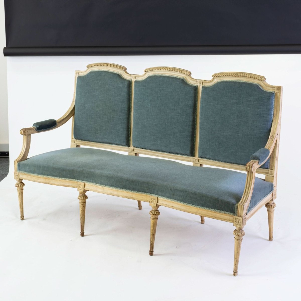 The shaped gadrooned back raised on eight tapering legs, upholstered in a teal velvet, retaining its original paint