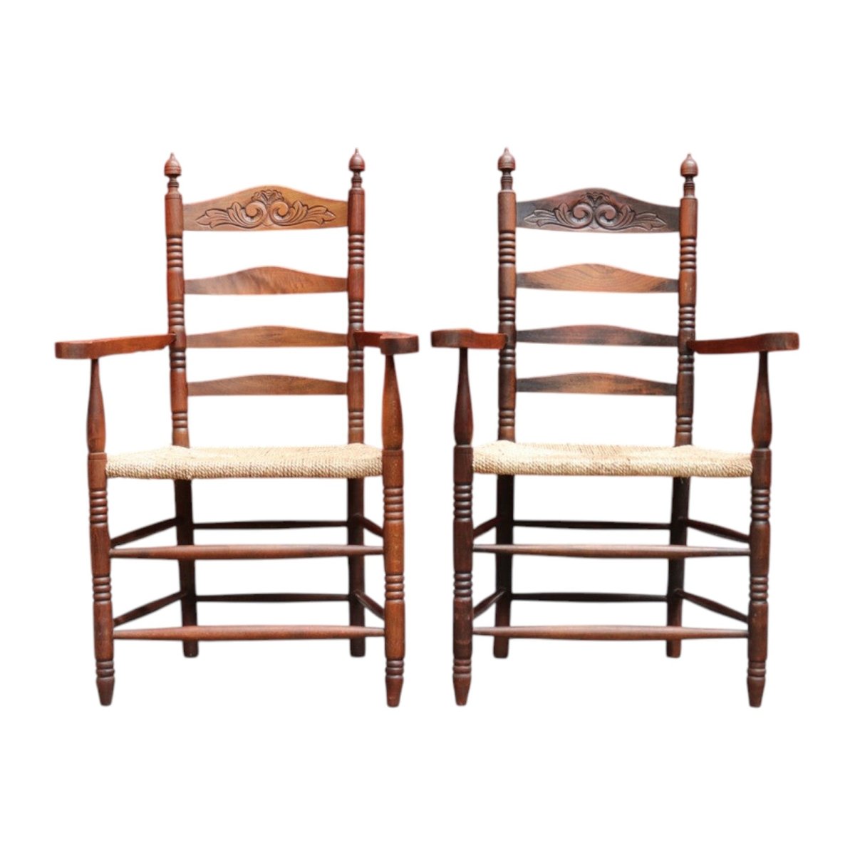 Description: Pair of antique French carver chairs with rush seats and curved ladder backs. Each chair features carved details on the top back rail, turned arms, and finials on the top corners. Strongly made with double stretchers to the front, back, and sides. Suitable as hall chairs, bedroom chairs, or occasional seating.