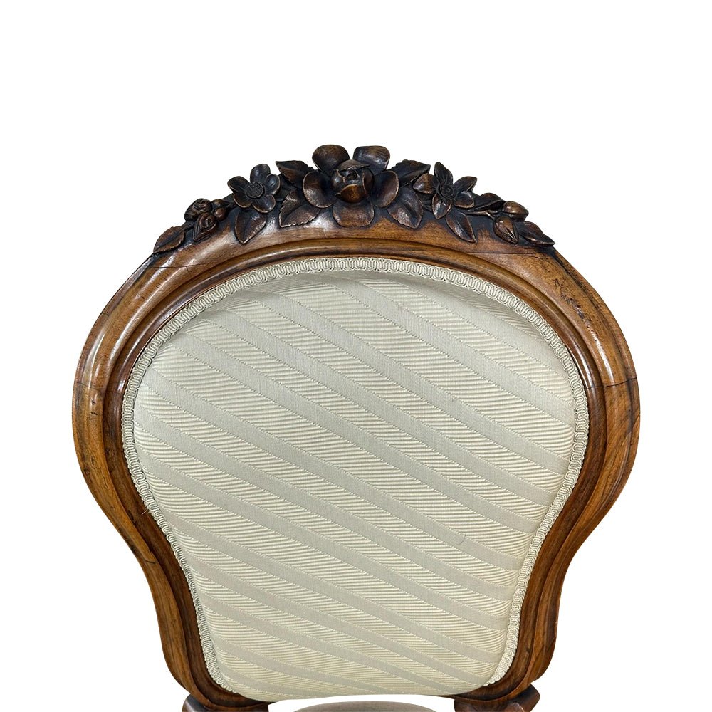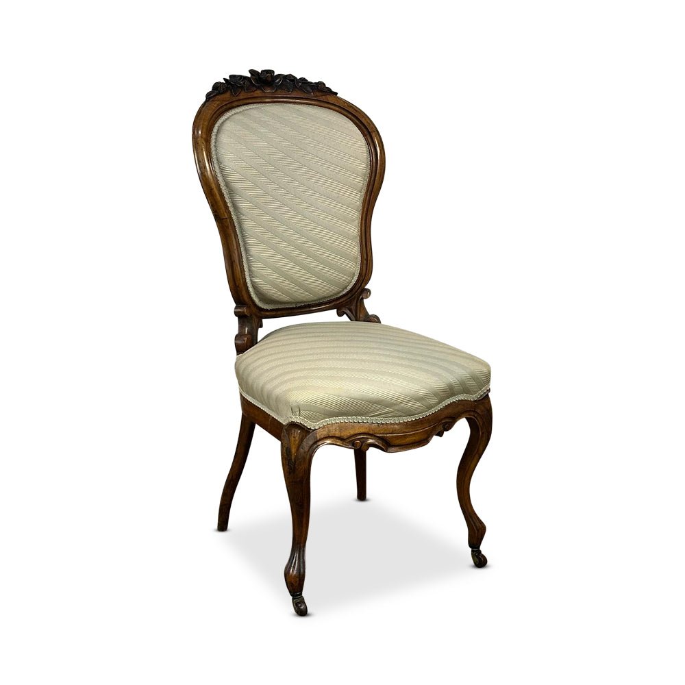 Beautifully crafted from warm walnut, these French dining chairs have wonderful character whilst remaining very comfortable. The chairs feature floral carved motifs to the back, and cabriole front legs. The chairs have been upholstered with a lovely neutral taupe striped tapestry which would fit in with any colour scheme. What makes these so comfortable is the padded back which is still in fabulous condition.