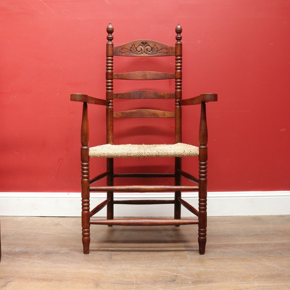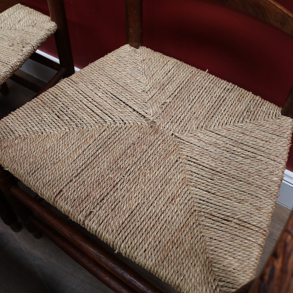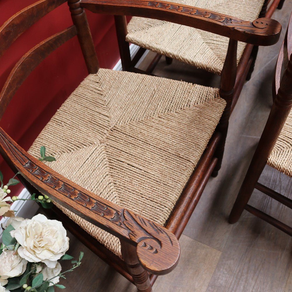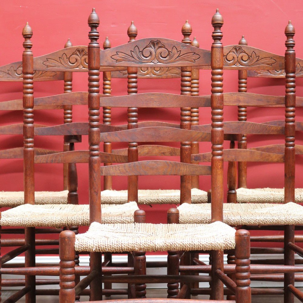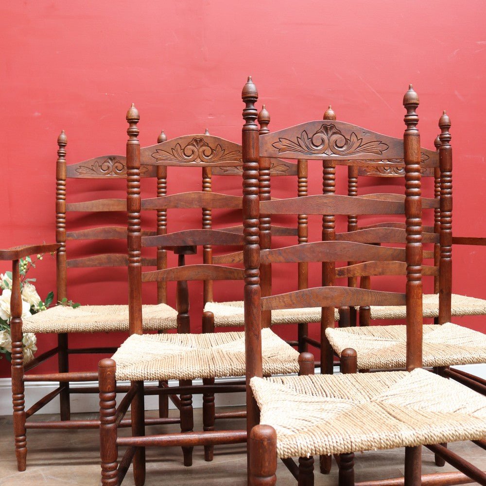 Description:Set of six antique French dining chairs with rush seats and curved ladder backs. Each chair features carved detail to the top back rail, with finials to the upper corners. The set includes two carvers (armchairs) and four side chairs.