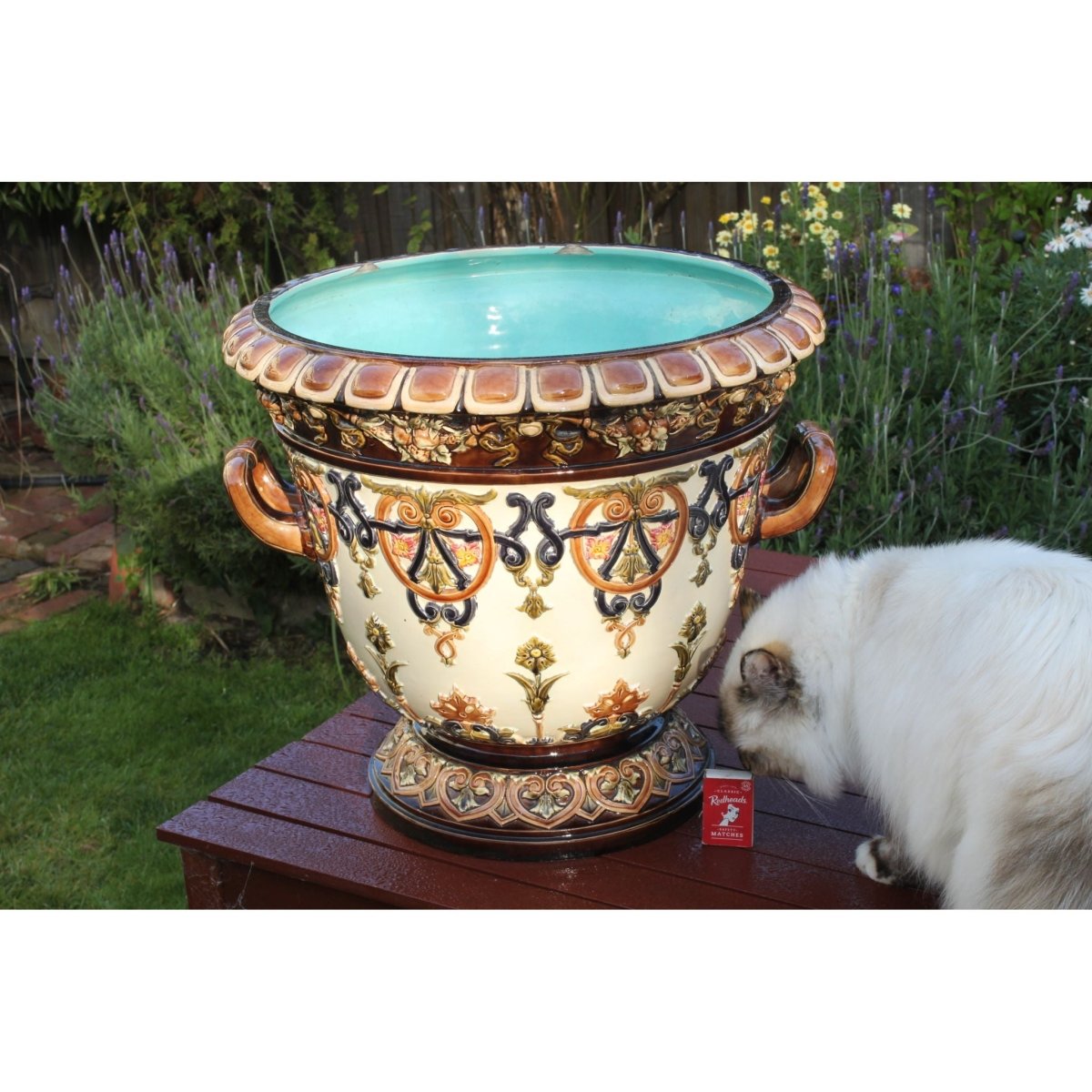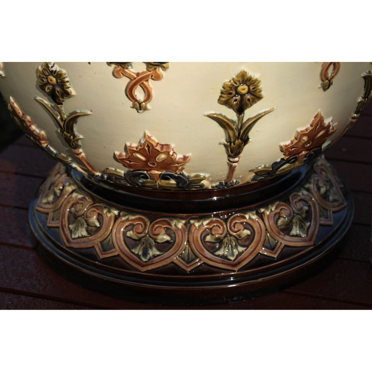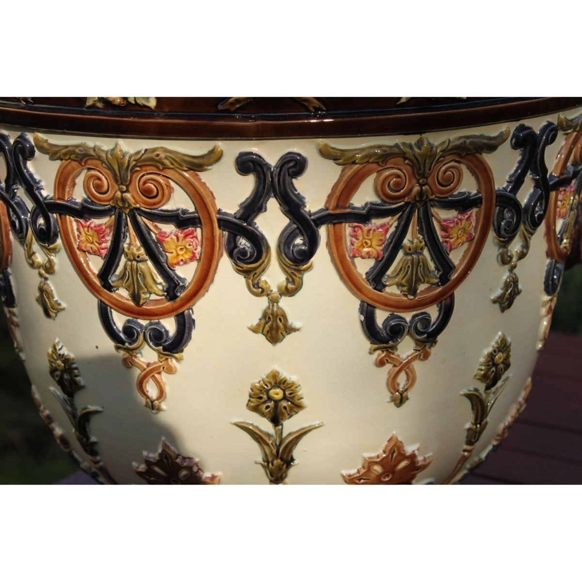 The raised decoration on this impressive majolica jardiniere was formed in separate moulds and then applied by hand. This is known as sprigging. After these sprigs were fired onto the body they were then glazed with the majolica glazes. Possibly French, it carries the number 2016 incised into the base, and a small impressed mark. I have been unable to attribute it to a maker. The jardiniere stands 395 mm (15.5 inches) high and has a diameter of 440 mm (17.5 inches). It weighs in at 8.75 kgs (19.3 lbs). Some small chips to the footrim have been professionally repaired. There are three chips to the underside of the inside rim and two small ones to the underside of the outer base rim. These last two are only seen when the jardiniere is turned upside down. There are a few small areas of damage to the sprigs as well. It would date from around 1880. Cat not included.