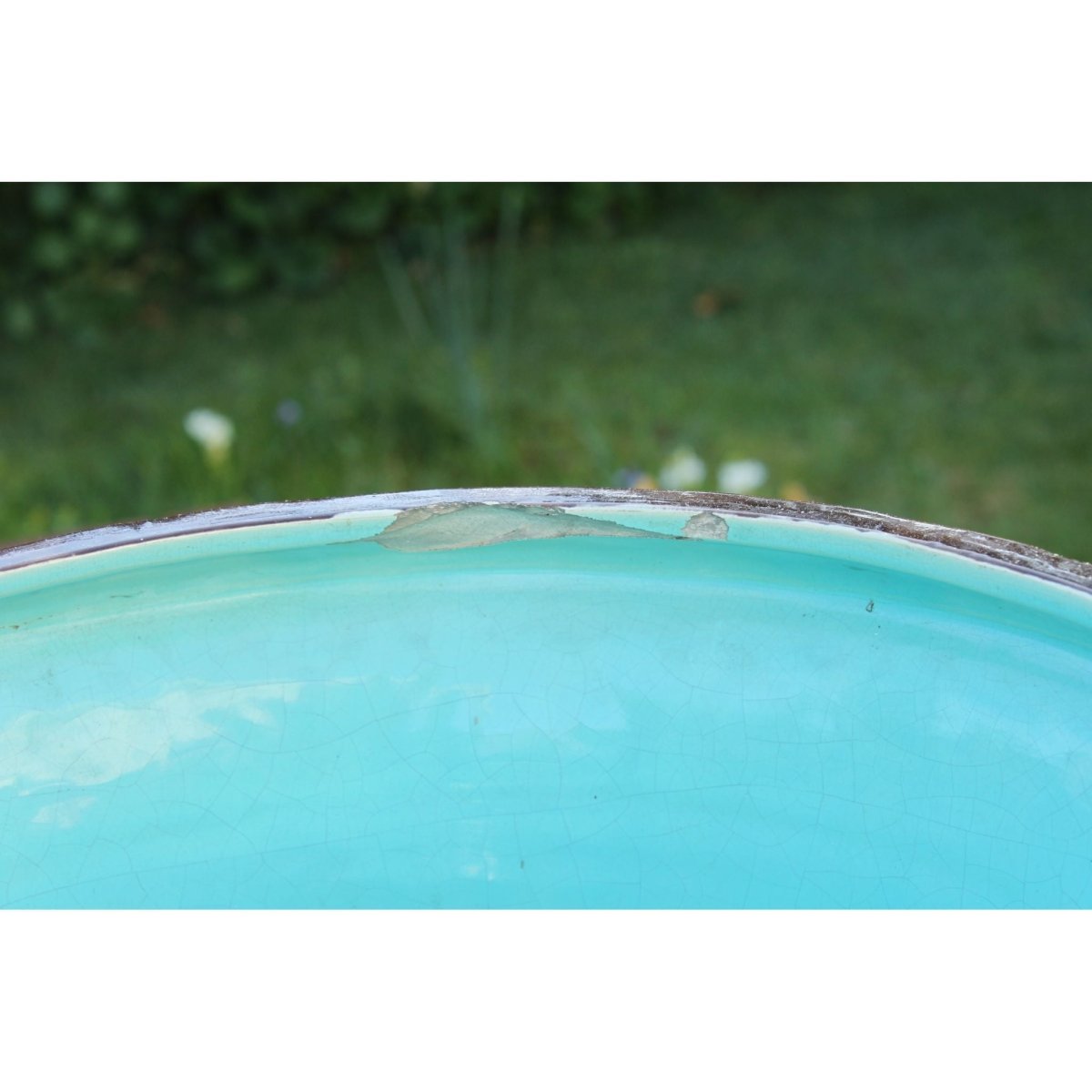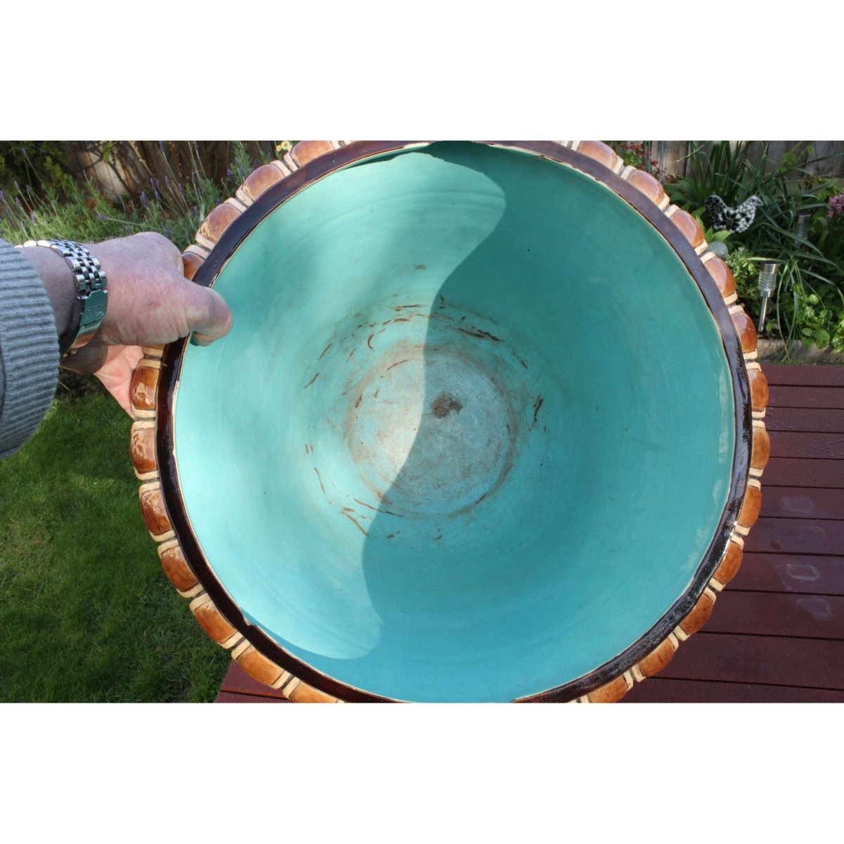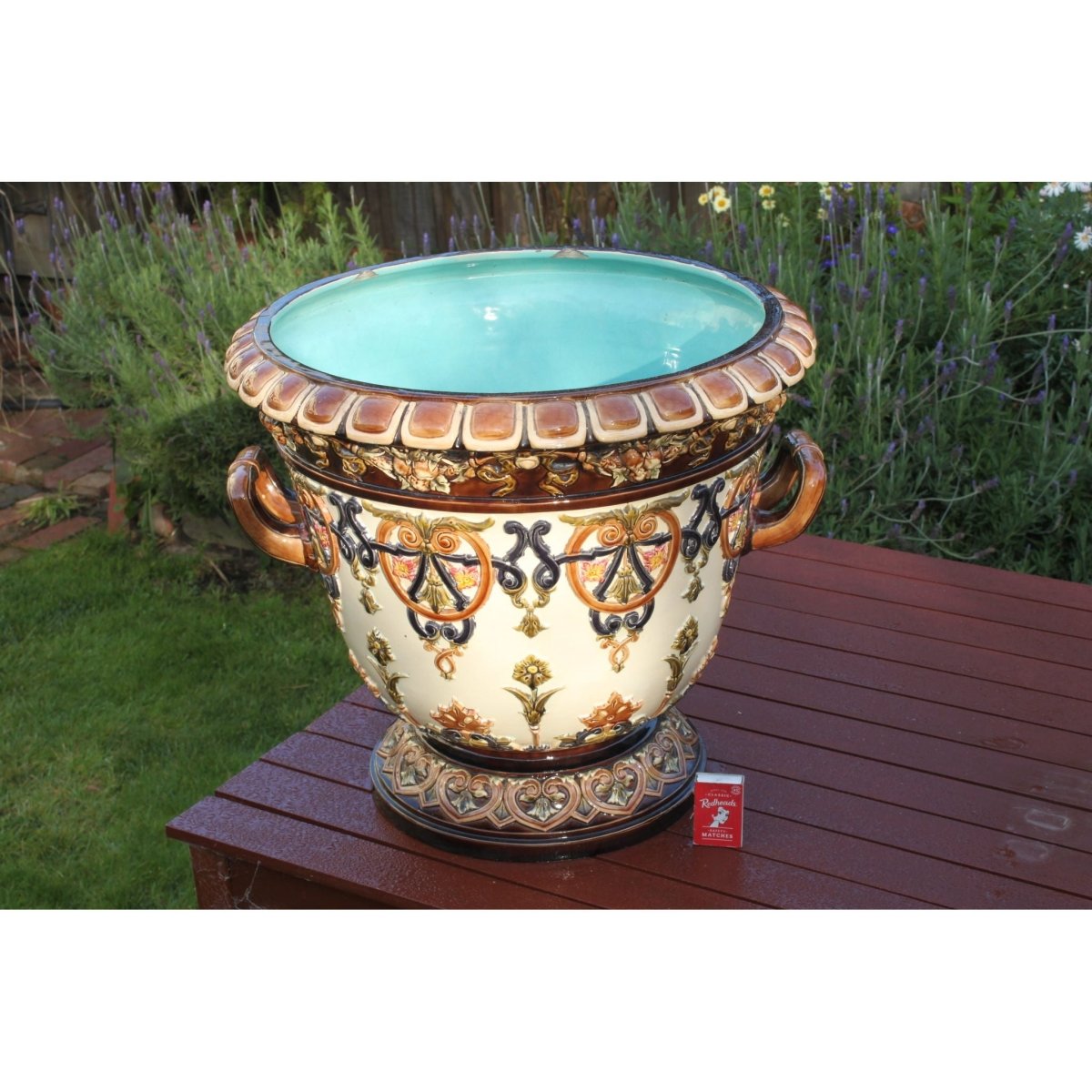 The raised decoration on this impressive majolica jardiniere was formed in separate moulds and then applied by hand. This is known as sprigging. After these sprigs were fired onto the body they were then glazed with the majolica glazes. Possibly French, it carries the number 2016 incised into the base, and a small impressed mark. I have been unable to attribute it to a maker. The jardiniere stands 395 mm (15.5 inches) high and has a diameter of 440 mm (17.5 inches). It weighs in at 8.75 kgs (19.3 lbs). Some small chips to the footrim have been professionally repaired. There are three chips to the underside of the inside rim and two small ones to the underside of the outer base rim. These last two are only seen when the jardiniere is turned upside down. There are a few small areas of damage to the sprigs as well. It would date from around 1880. Cat not included.