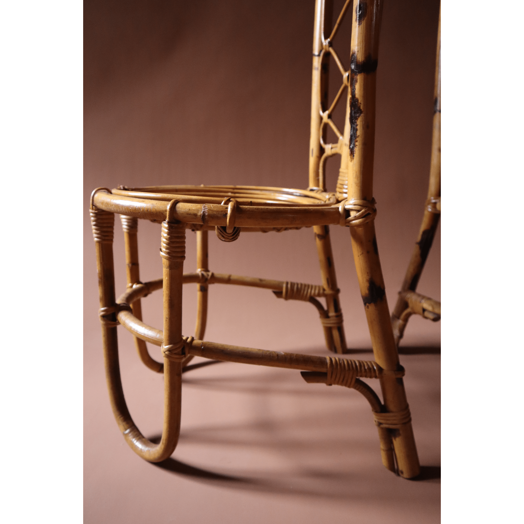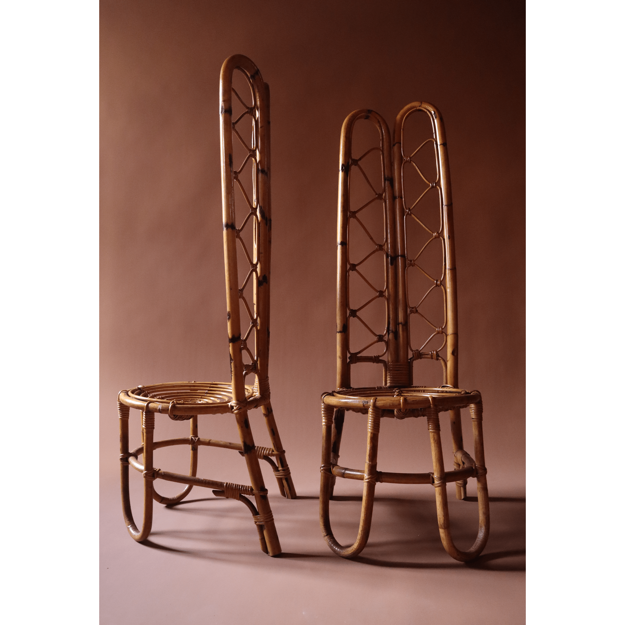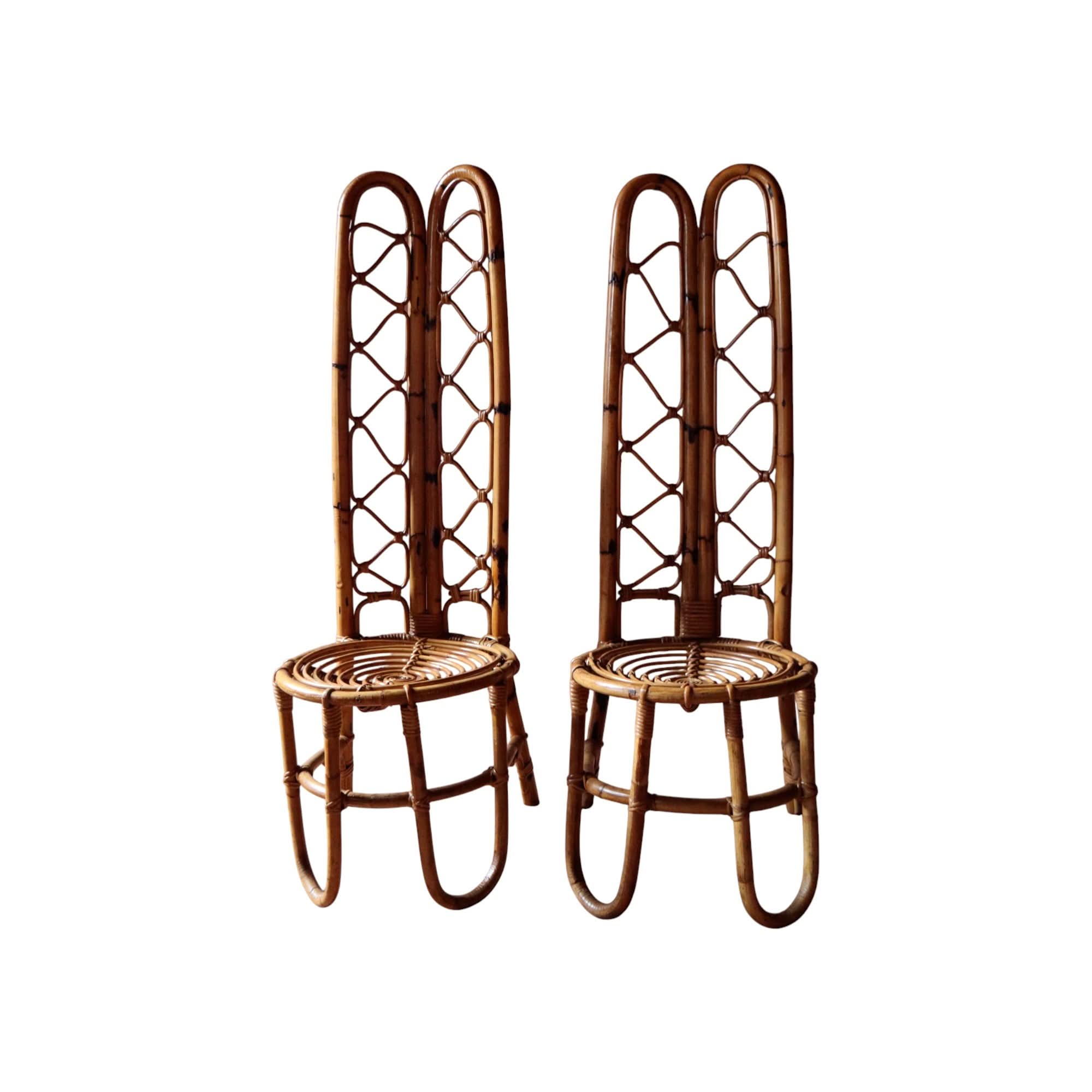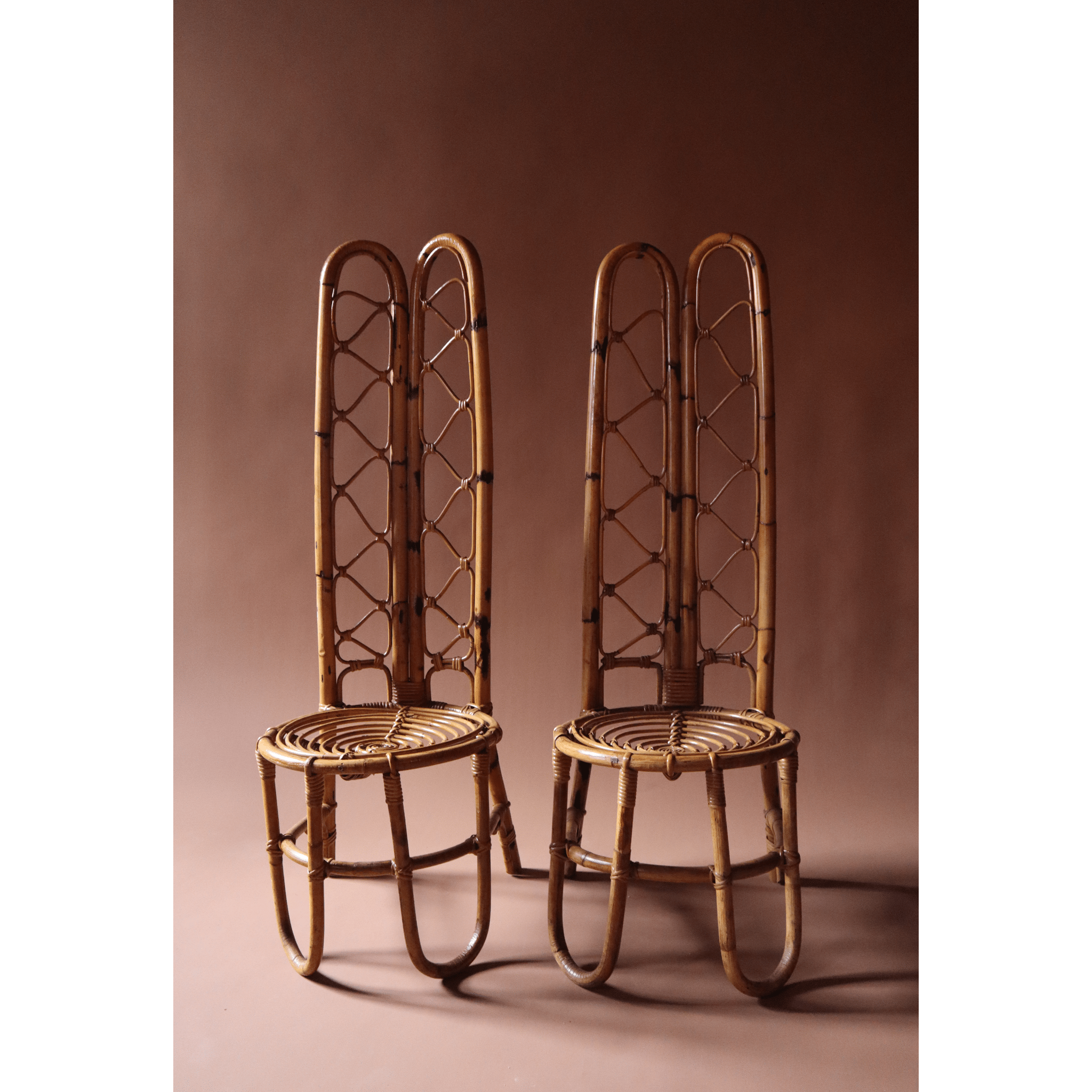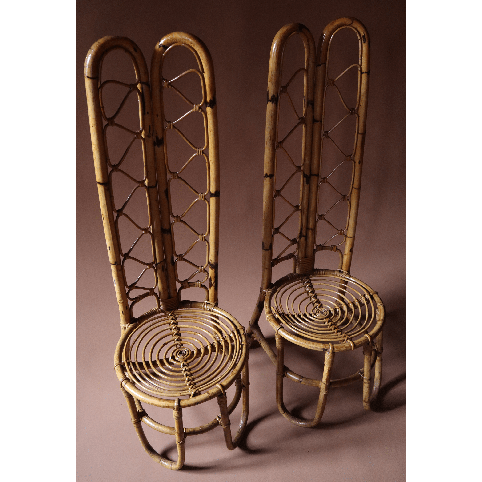 Stunning set of two, high backed occasional chairs. Made from bamboo and cane detailing. The pattern within the back panel is one of the most beautiful we've seen in this style of chair, popular from the disco era.