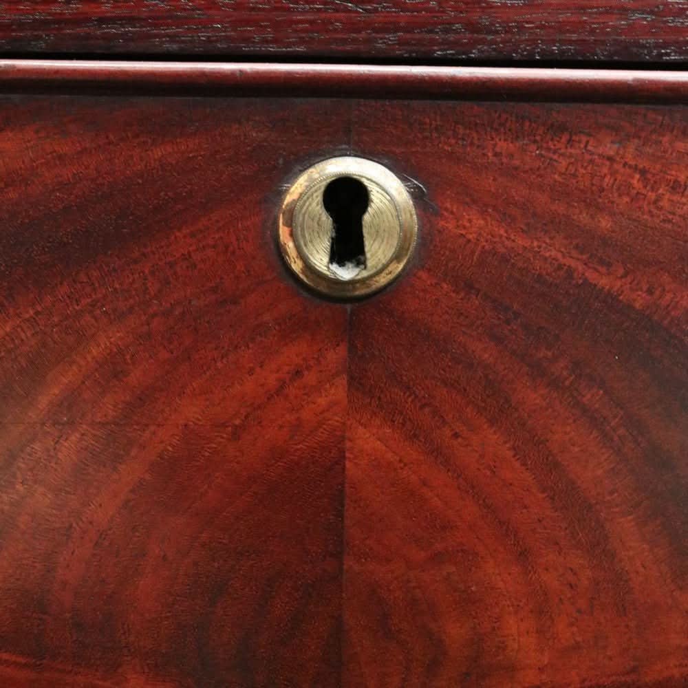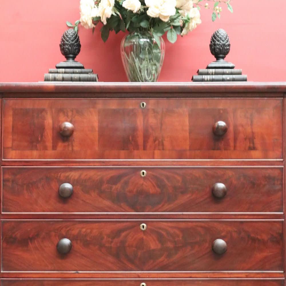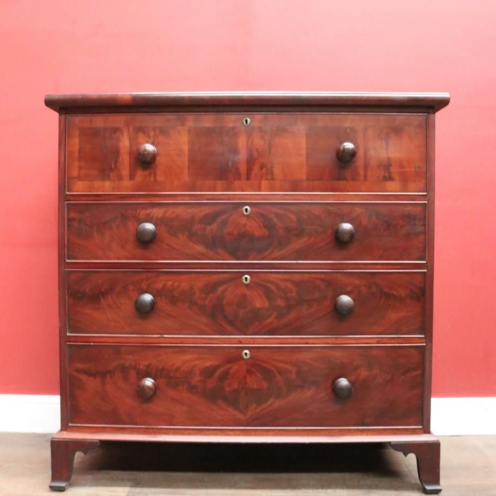 Description: An elegant antique English chest of drawers crafted from solid mahogany with striking flame mahogany veneer to the drawer fronts. This well-proportioned piece features four smooth-sliding drawers, all with their original locks, escutcheons, and handles, a rare find for a piece of this age.