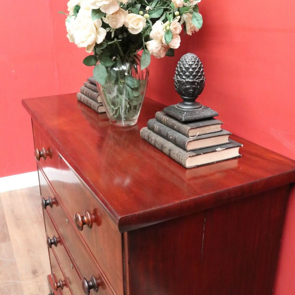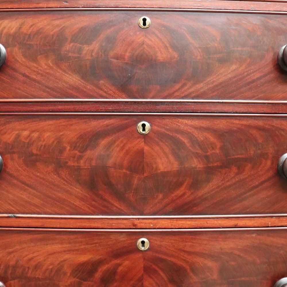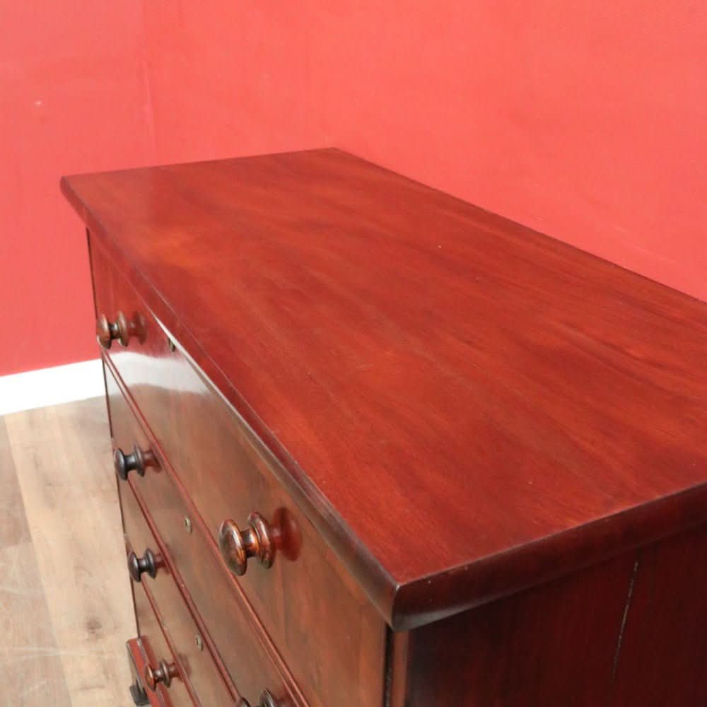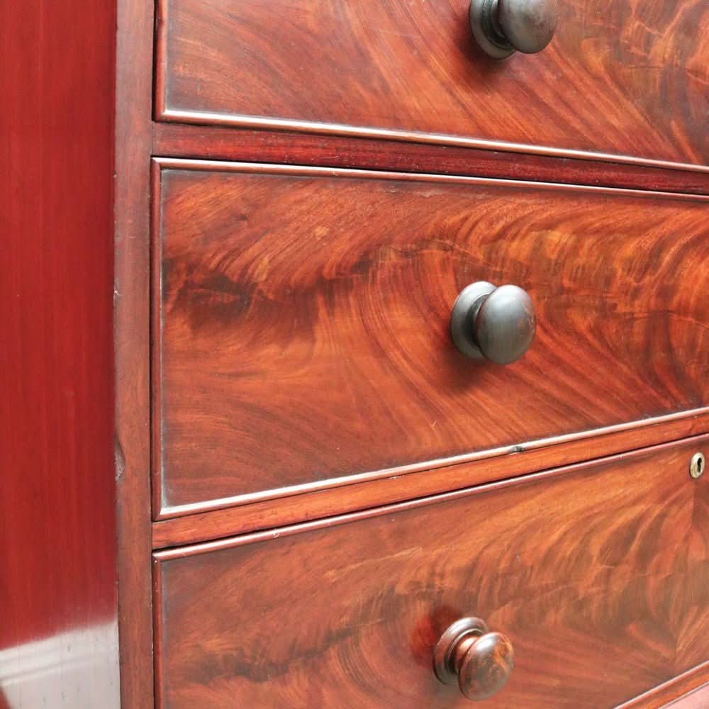 Description: An elegant antique English chest of drawers crafted from solid mahogany with striking flame mahogany veneer to the drawer fronts. This well-proportioned piece features four smooth-sliding drawers, all with their original locks, escutcheons, and handles, a rare find for a piece of this age.