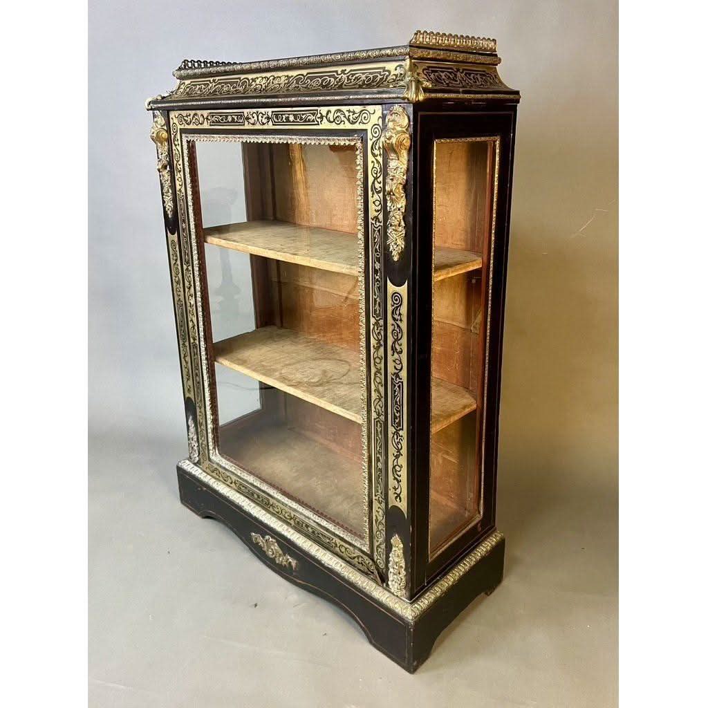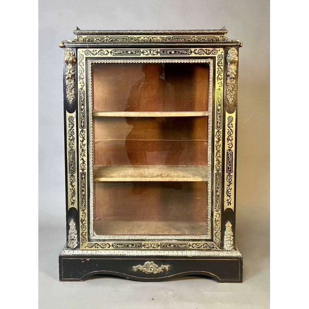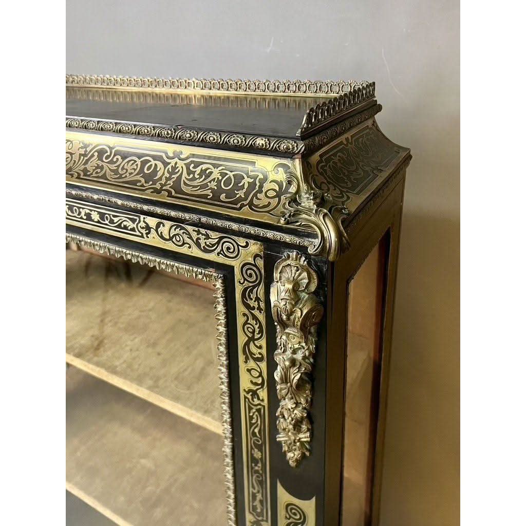 This is a very good example of a genuine antique French 19th century Display Cabinet in the manner of the famous French cabinetmaker Andre Charles Boulle 1642 - 1732 who perfected the art of marquetry also known as inlay into an Ebony surface. He specialised in brass, Pewter and tortoiseshell inlays. This 19th Century Ebonised Cabinet has intricate Brass inlays and is further embellished with quality and well cast applied Bronze mounts and moldings.