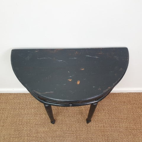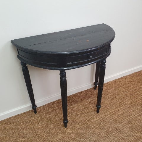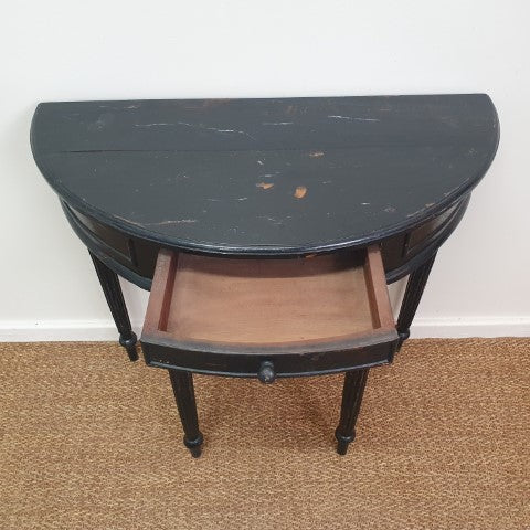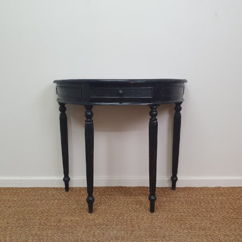 This black half-moon demi-lune hall table features a single drawer and a sleek curved silhouette. Its simple design and elegant proportions make it a versatile decorative piece for hallways, entryways, or living spaces, complementing both classic and contemporary interiors.