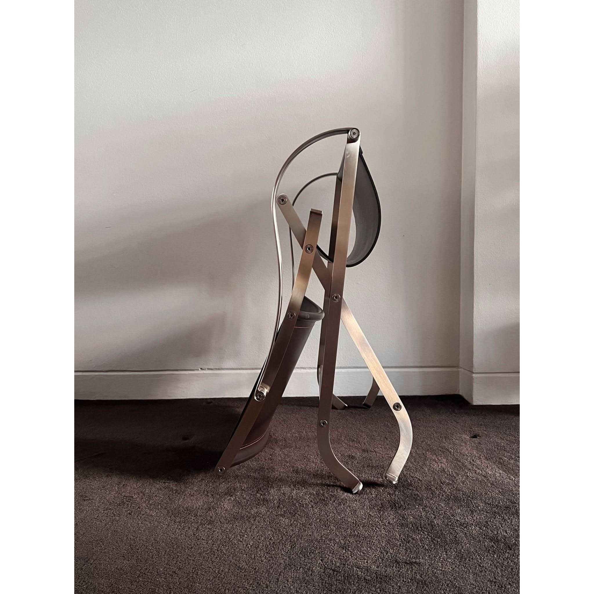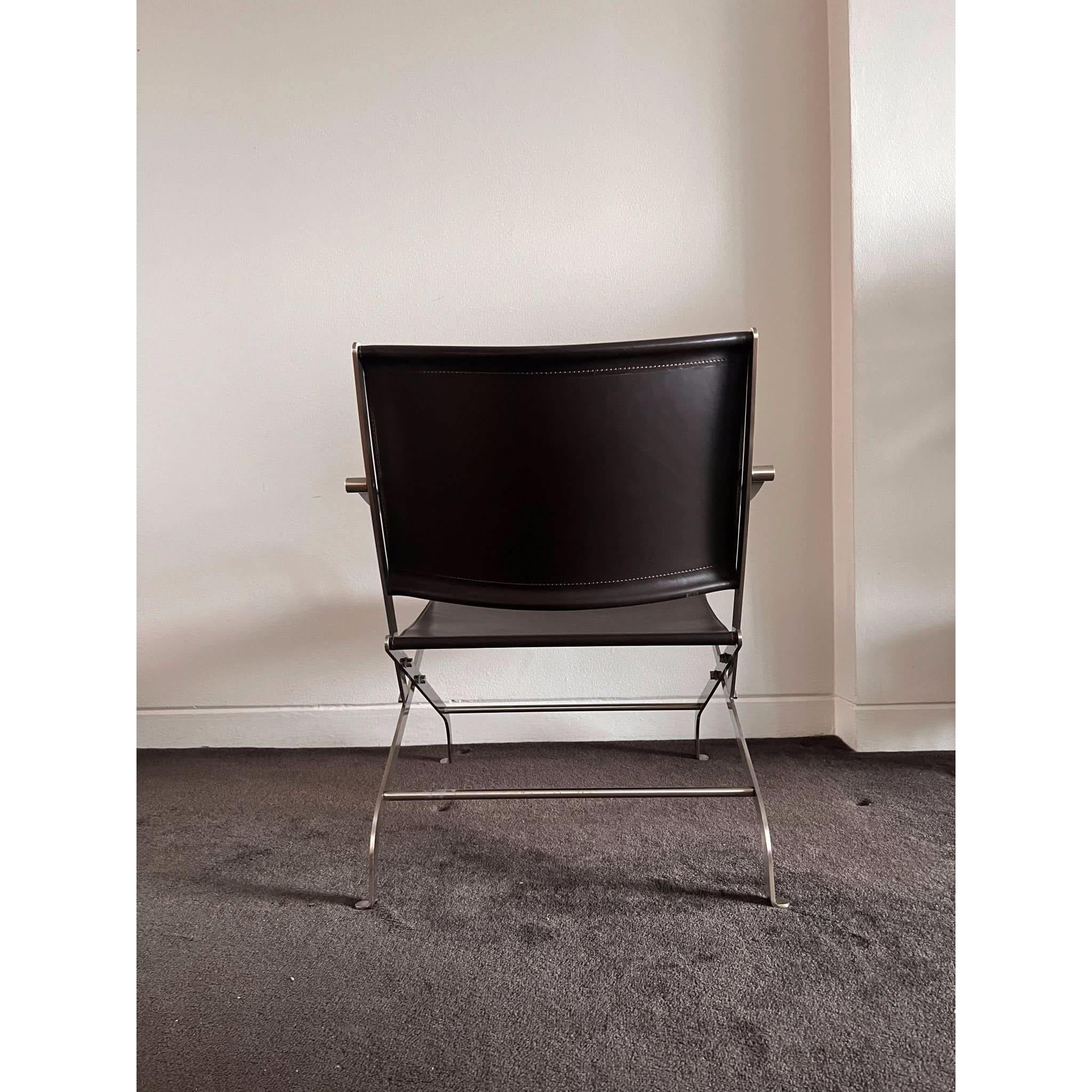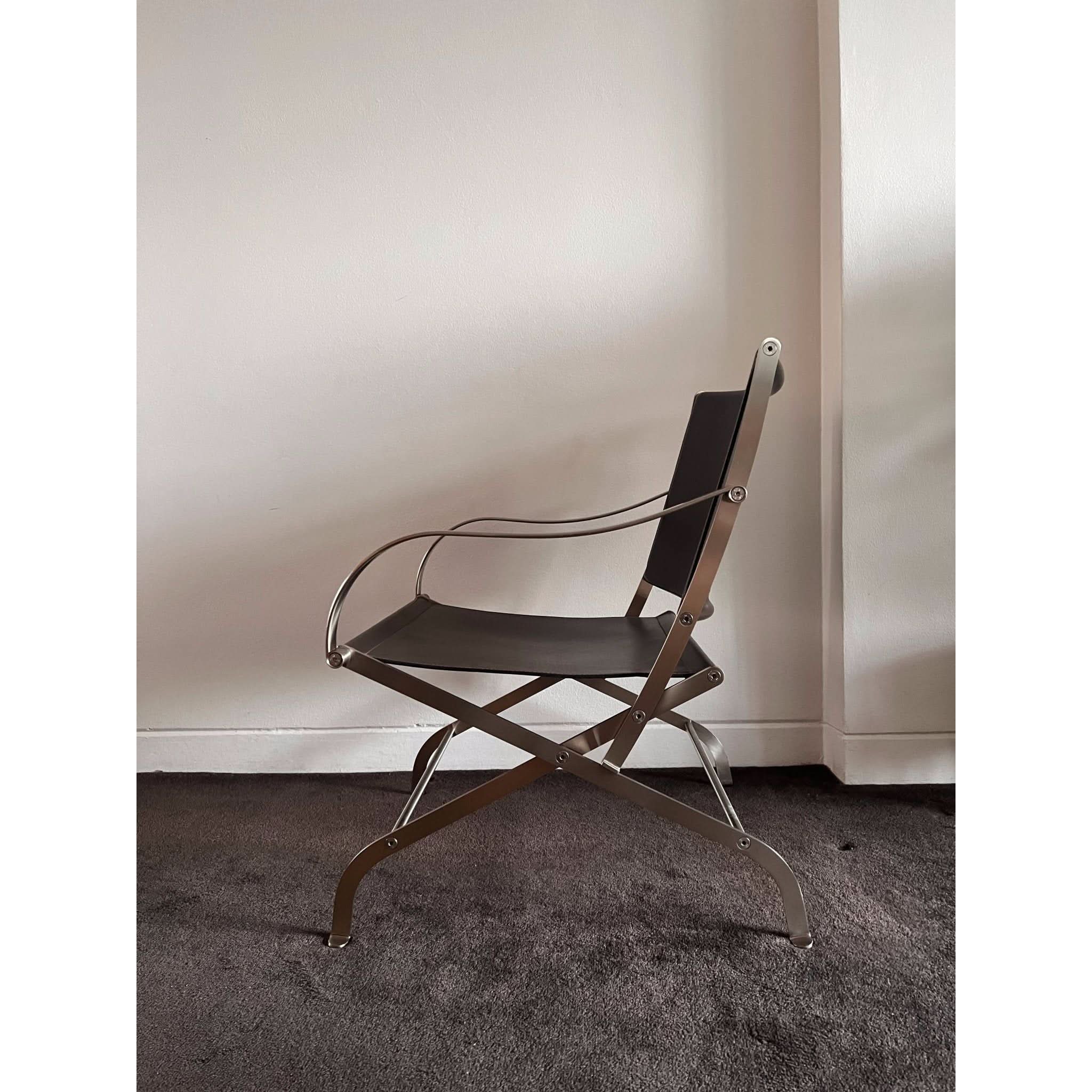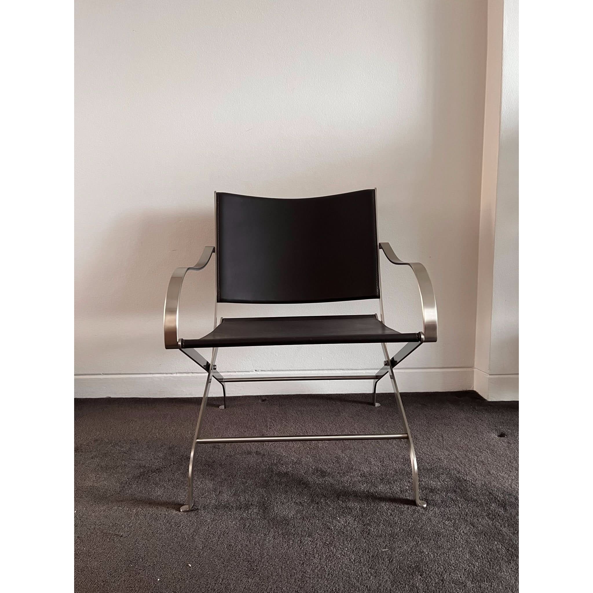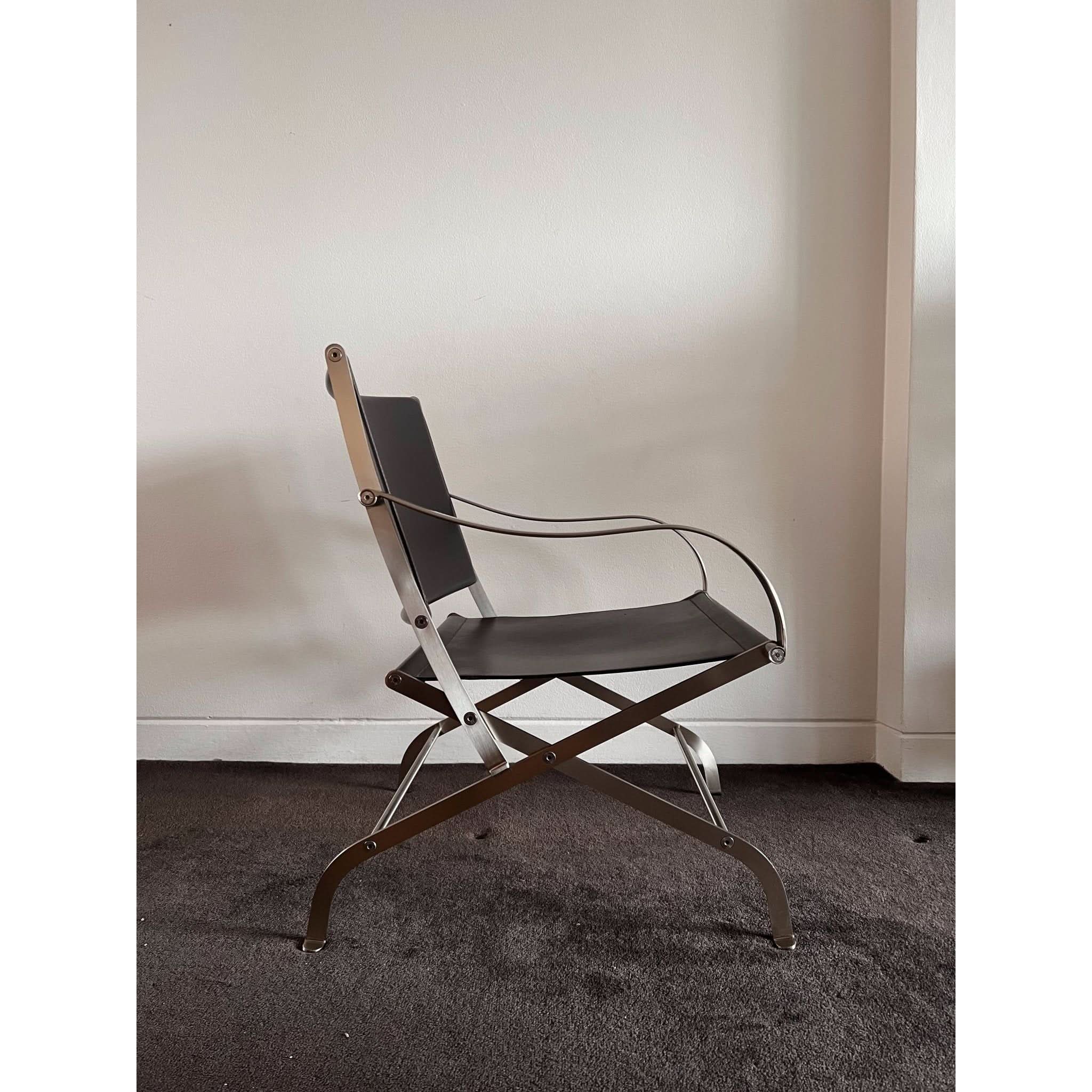 Manufactured in Italy, the chair was designed in 1996 by Antonio Citterio for Flexform. The archetypical folding chair, Carlotta was reinterpreted in a contemporary vein with a light hand and a pitch-perfect marriage of sophisticated materials, like metal and leather.