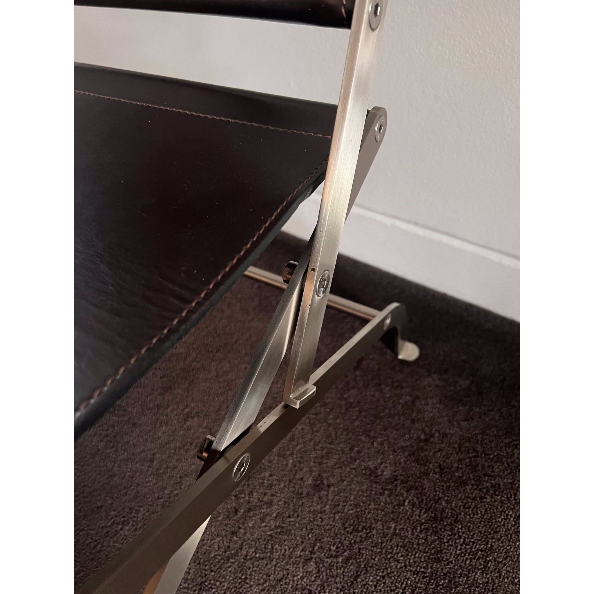 The joint screws, clearly visible on the metal structure, emphasise the austere, unornamented design that sets this armchair apart. Frame is satined chrome and upholstery is dark brown leather with matching stitching. Very minor marks of wear in the leather and pitting to the chrome are visible, as shown in photo, but generally in excellent condition.