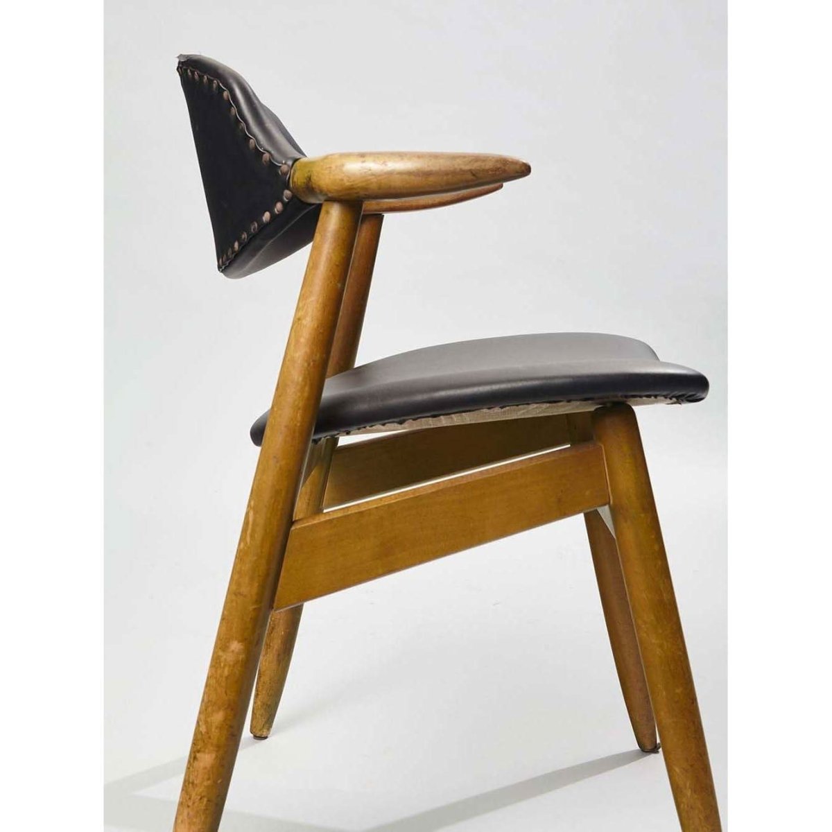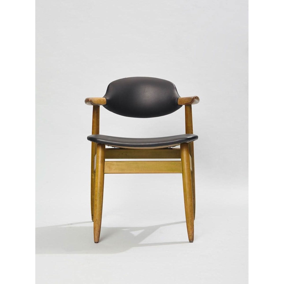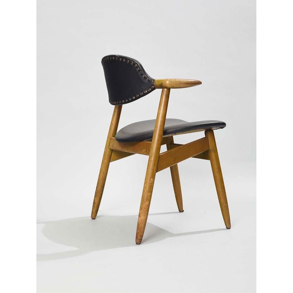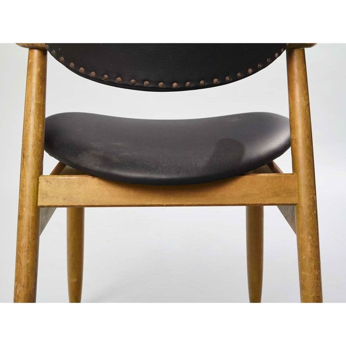 Made of solid ash wood and black original vinyl upholstery, these are fantastically shaped chairs offering super comfort seating.