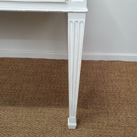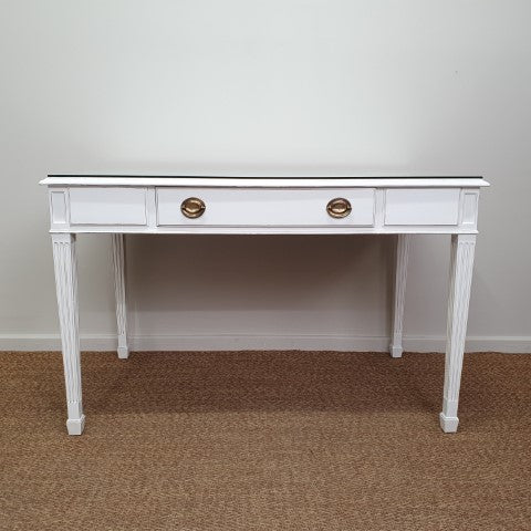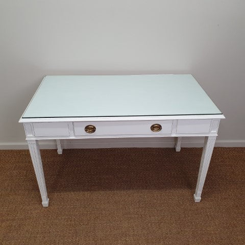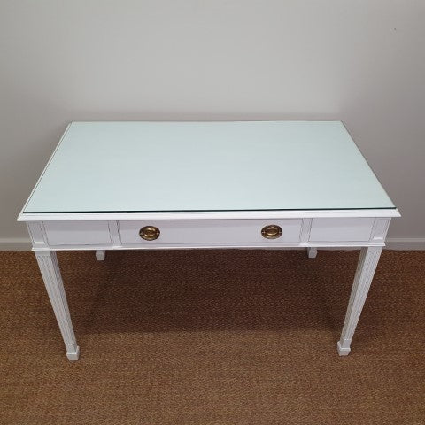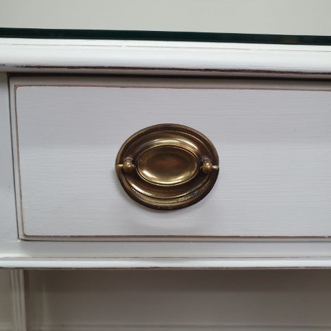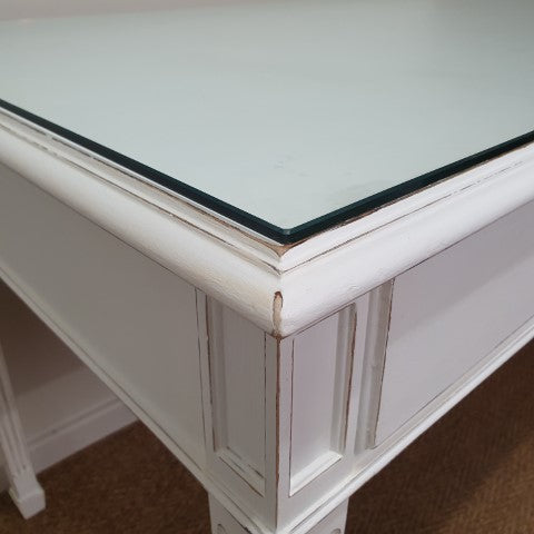 This French Provincial style desk is painted in Pure White Annie Sloan Chalk Paint. It features a single drawer and a custom glass top to keep the paint finish protected. Its Georgian-inspired design and clean lines make it a refined decorative piece for bedrooms, studies, or living areas. Lightly distressed detailing adds subtle character, giving it a timeless, versatile appeal.
