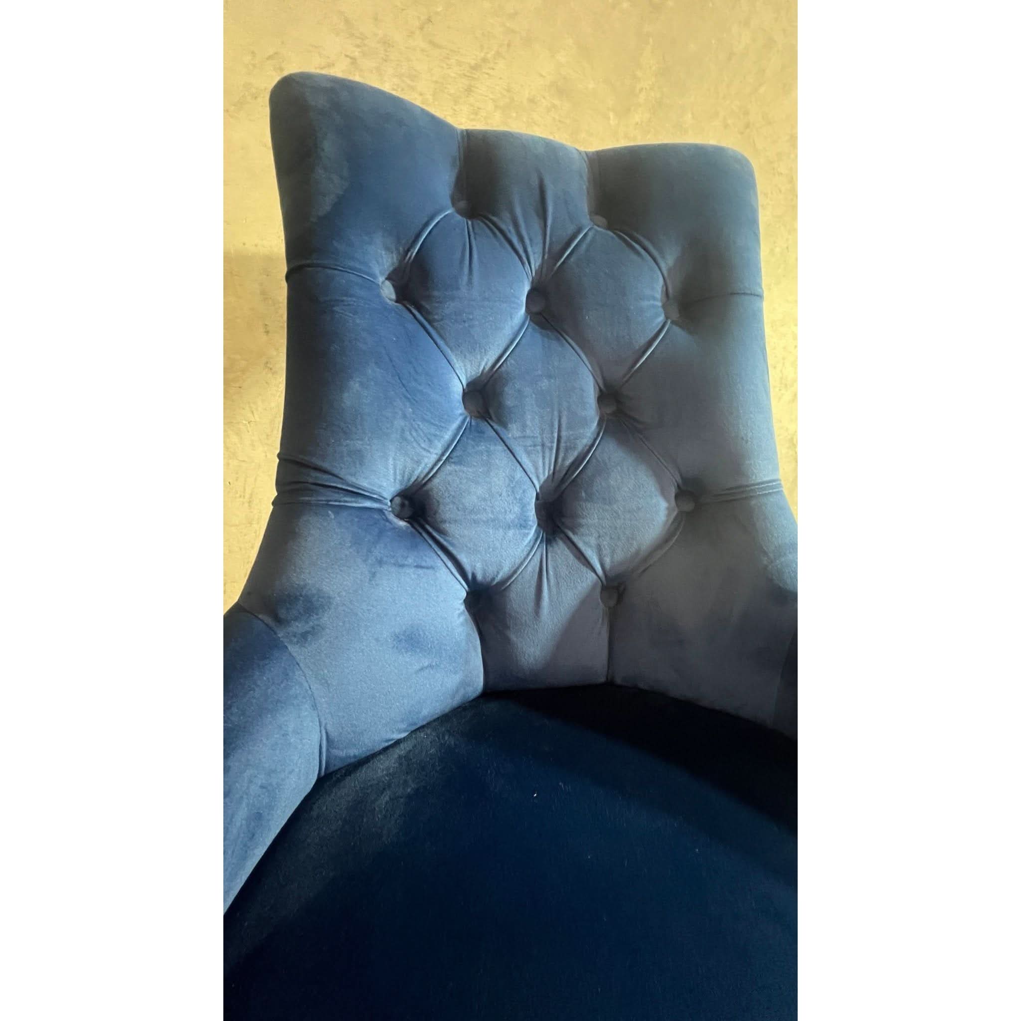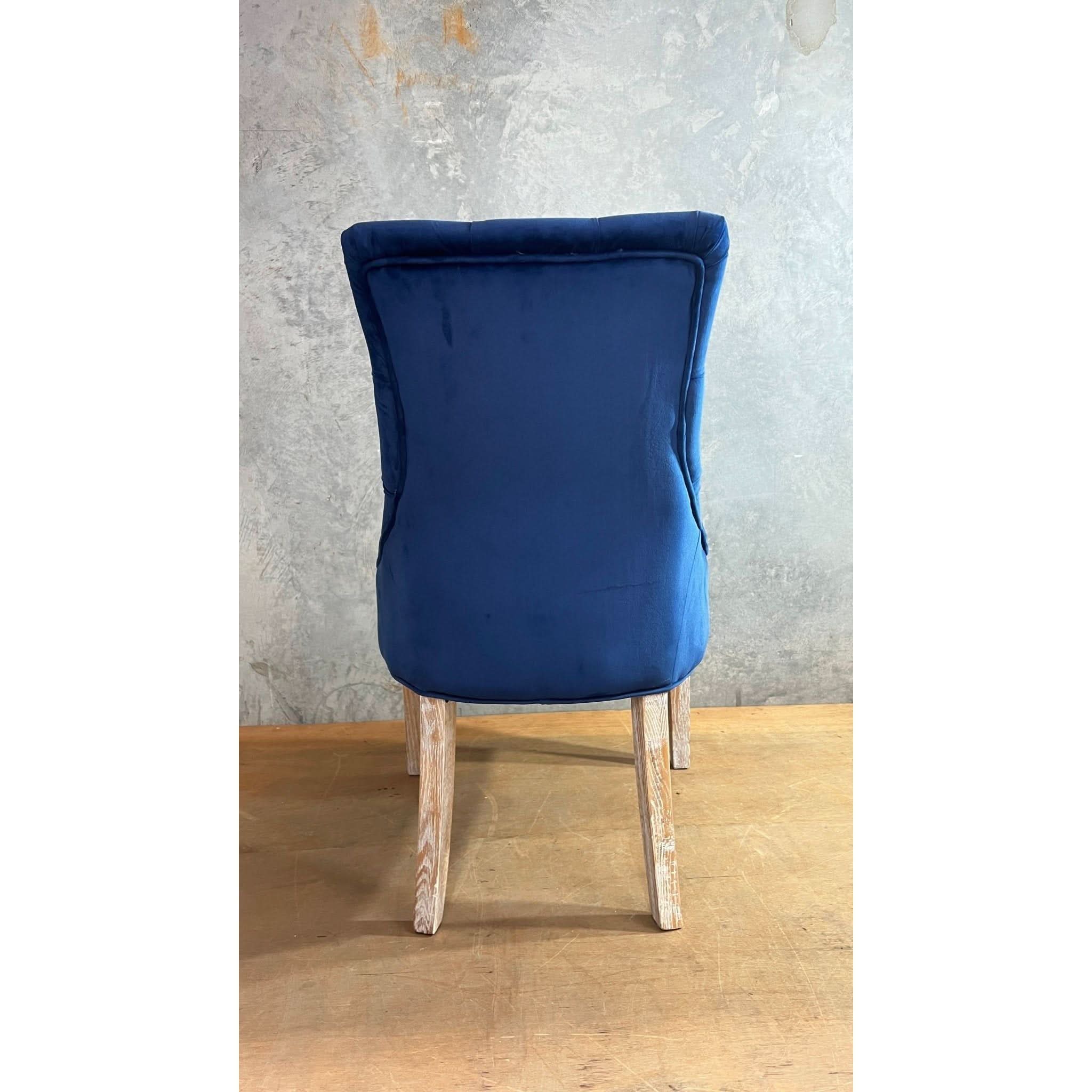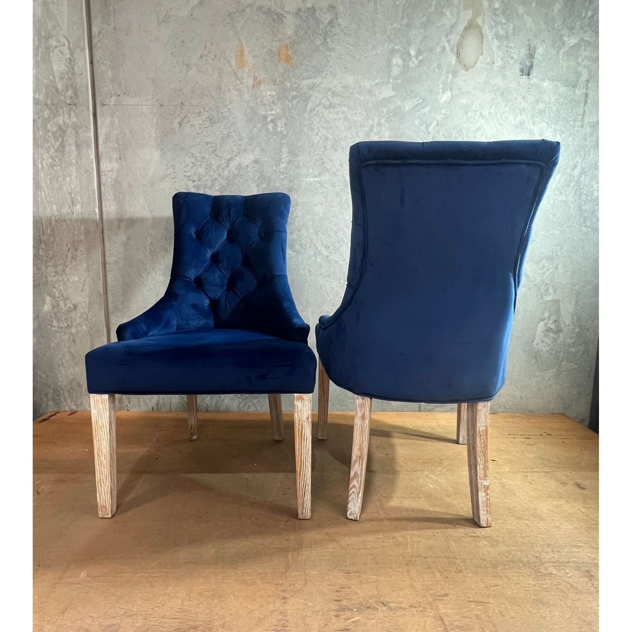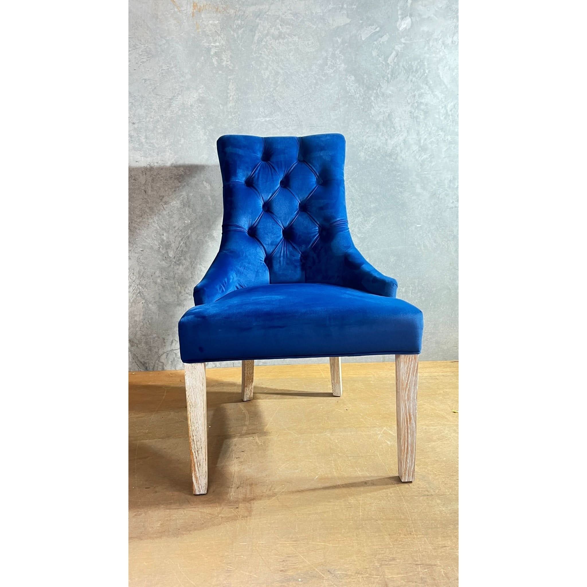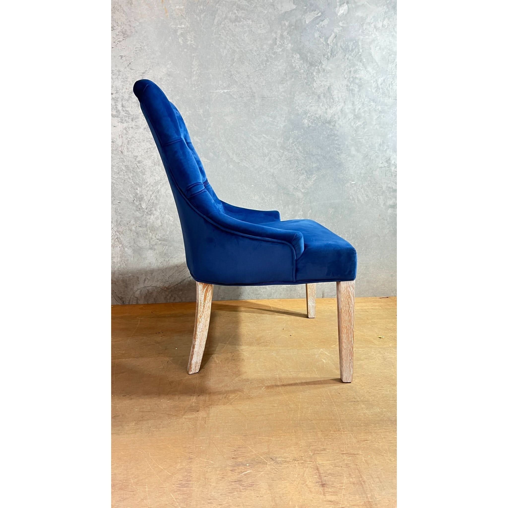 Add a sense of grandeur to your living, dining or bedroom with this pair of navy velvet diamond button studded chairs. Lime washed pine legs bring a warmth that will work in both modern country or Hollywood regency style.
