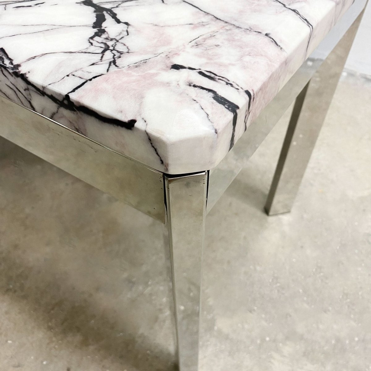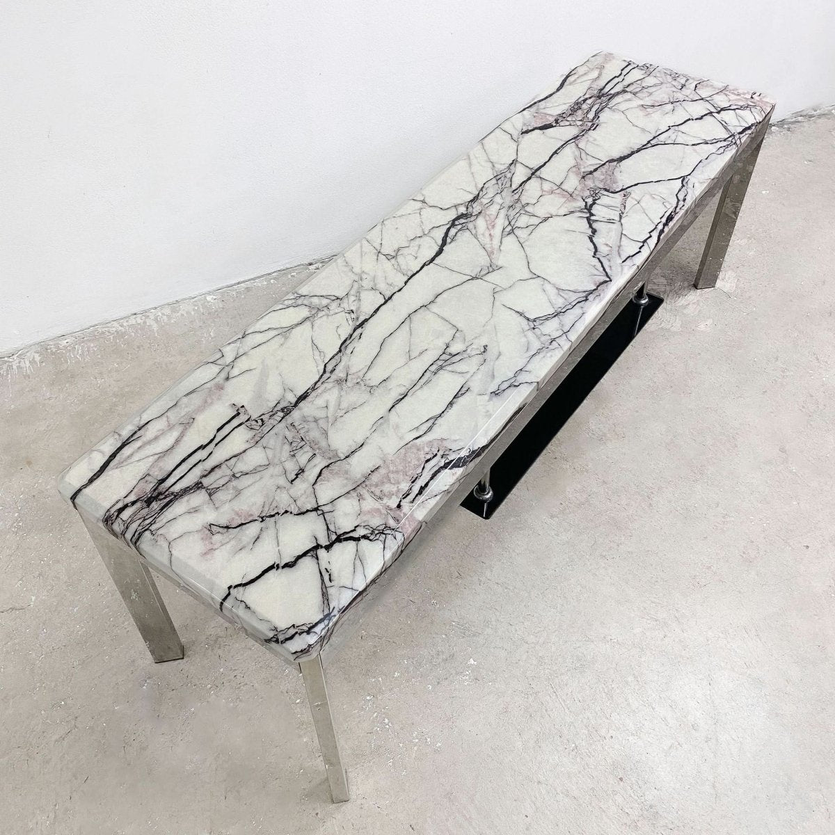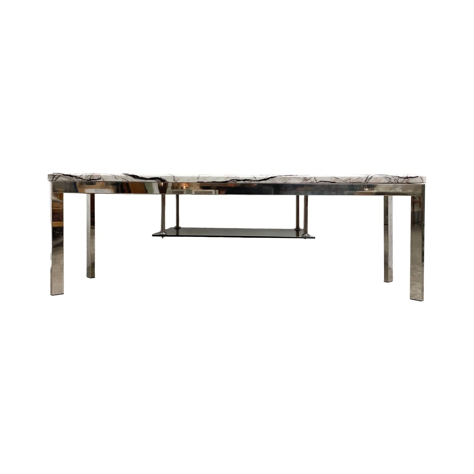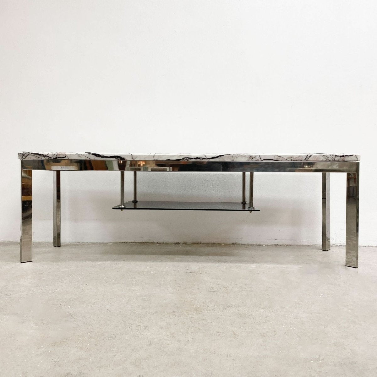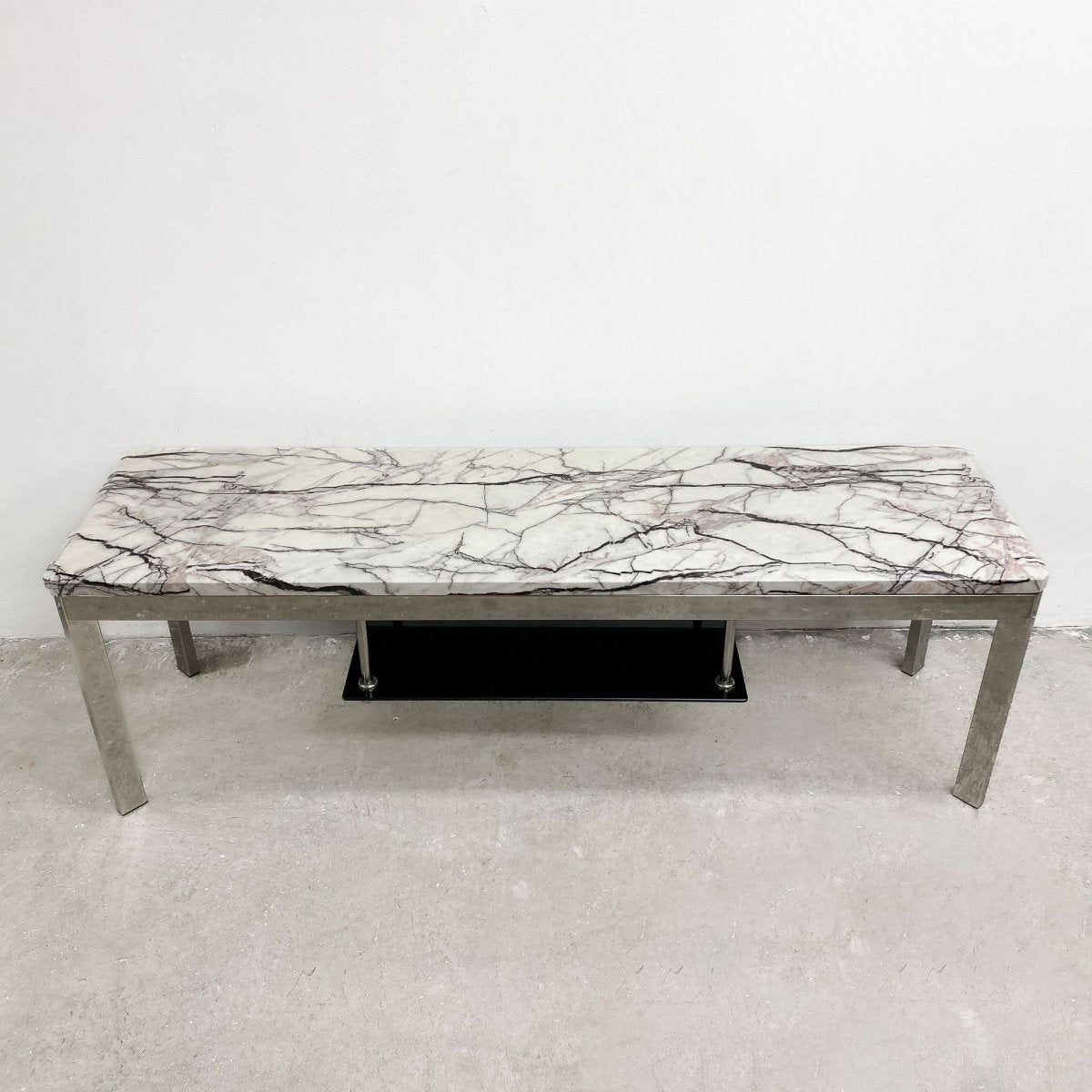 Fabulous post modern 1990s coffee table, featuring a stunning Italian bevelled edge marble top, chrome base and black glass shelf.  Also perfect as an entertainment unit.  In great vintage condition, with minor signs of previous use commensurate with age.