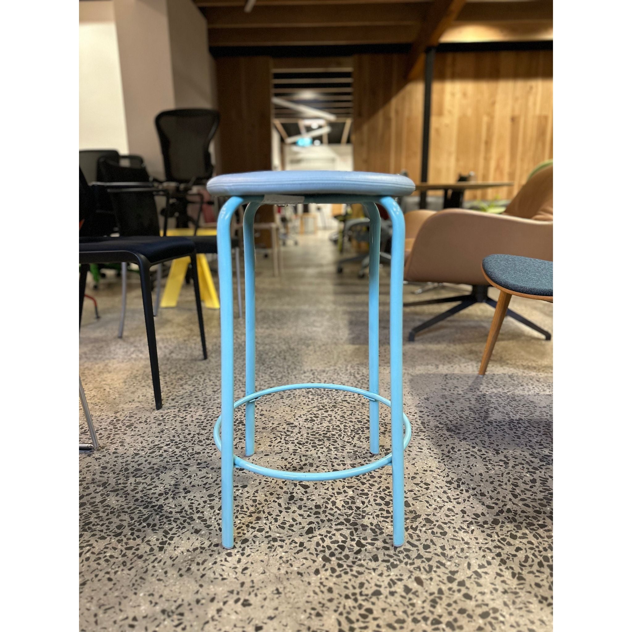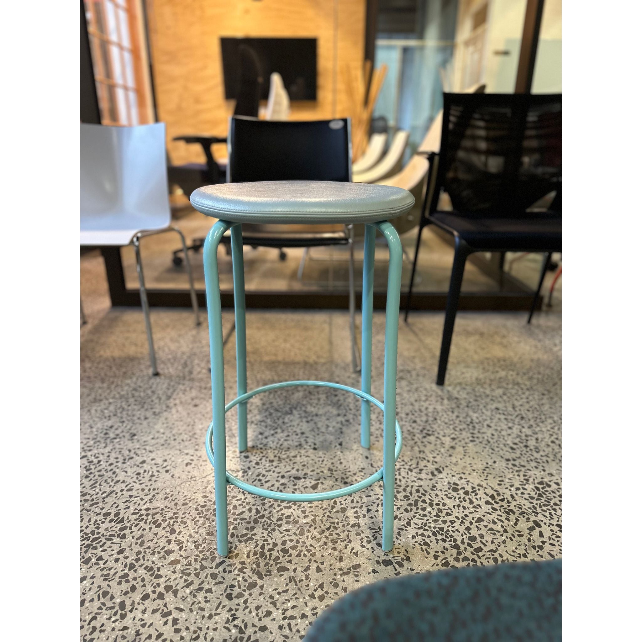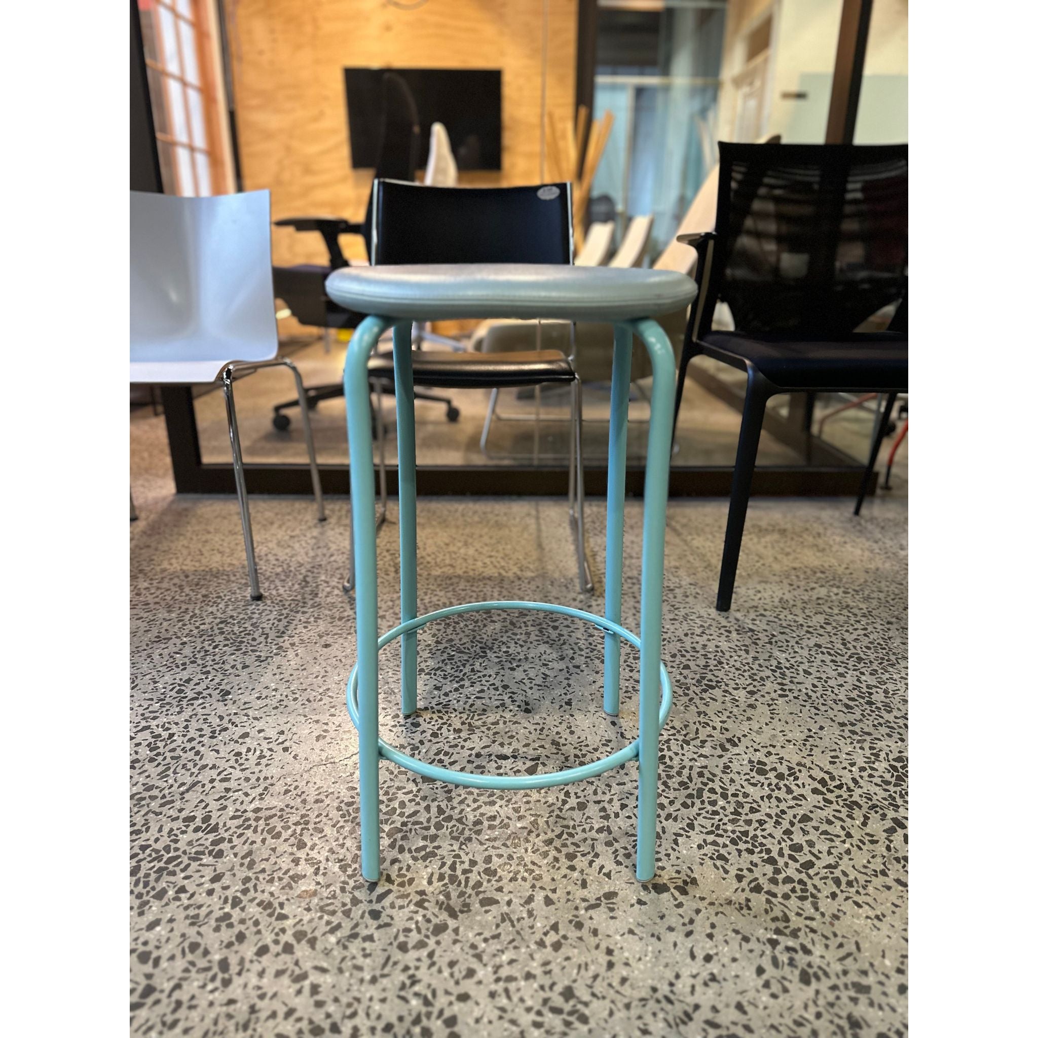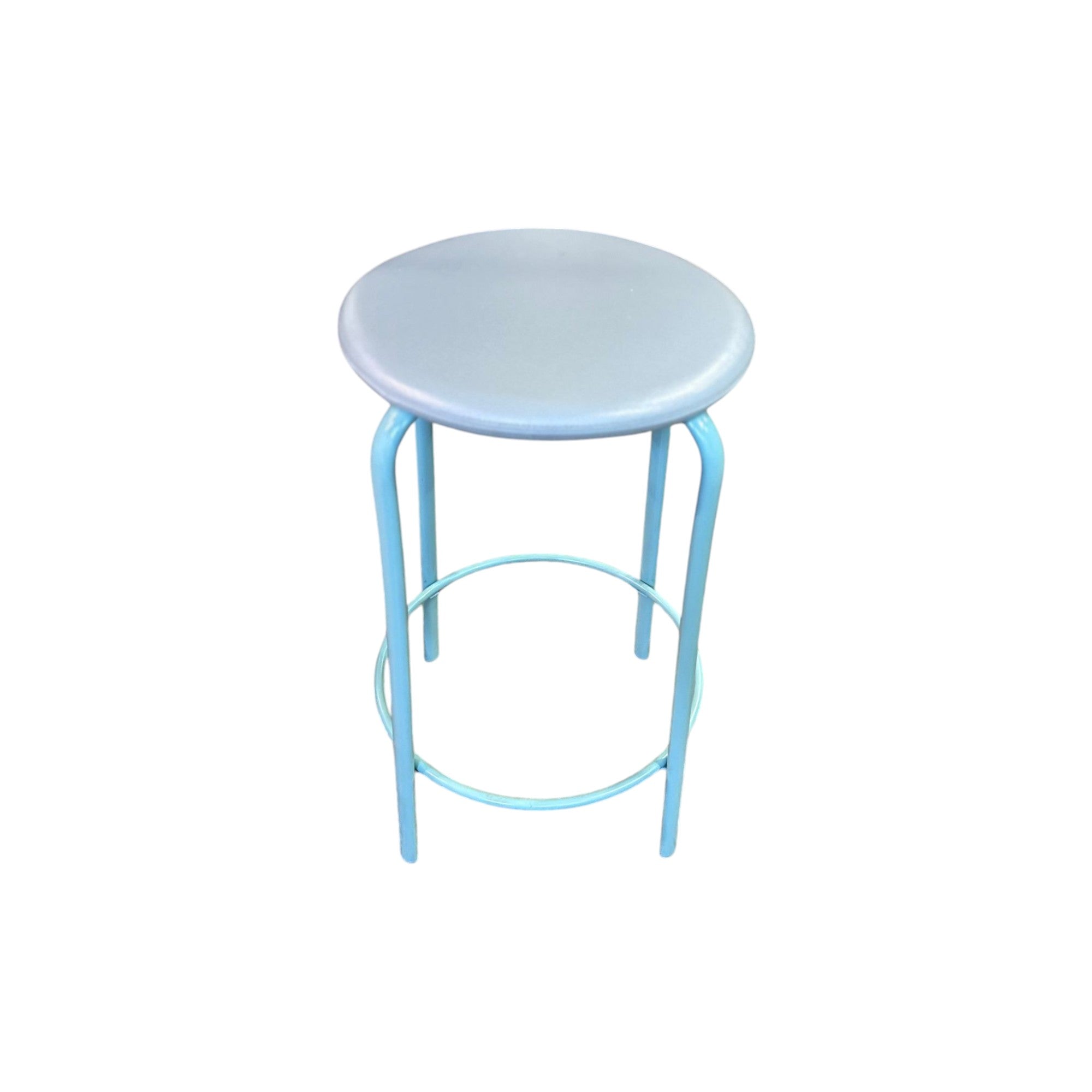 High stool with a lacquered metal stand and upholstered seat. The simple design makes it suitable for most spaces. The low weight makes it easy to pull out or put away if necessary. Has a footrest for comfortable support.